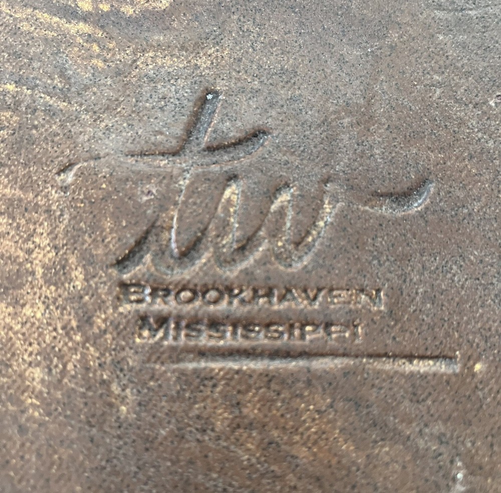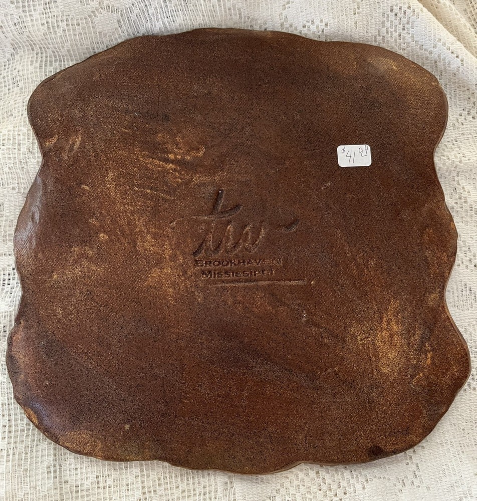 Beautiful art pottery platter/plaque done by artist Terry Warnock. This 10x10 inch piece features a fanciful letter “F” and an embossed design with a scalloped edge. No damage.