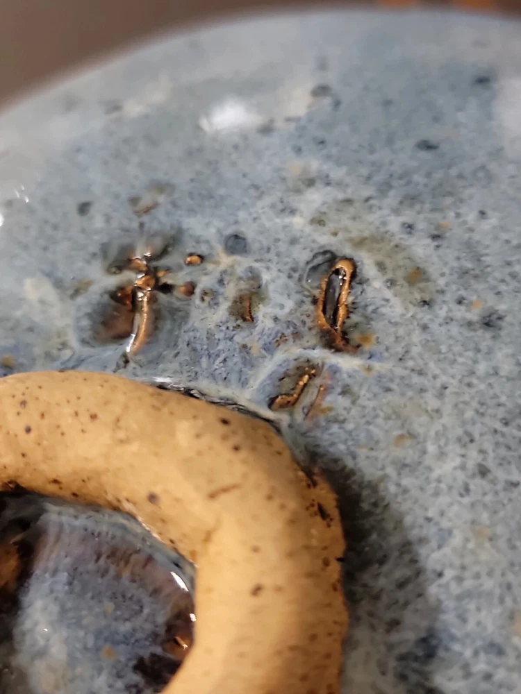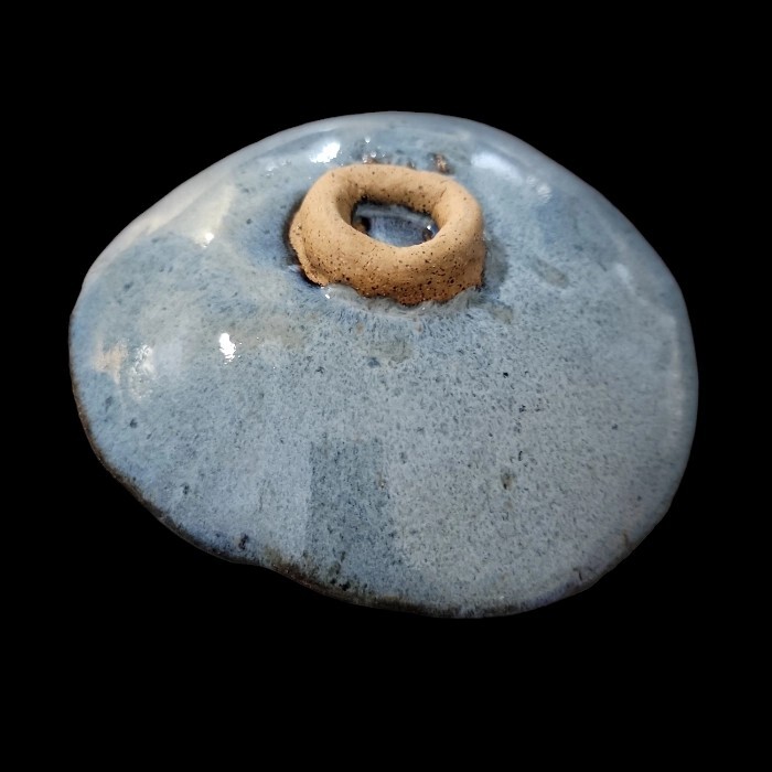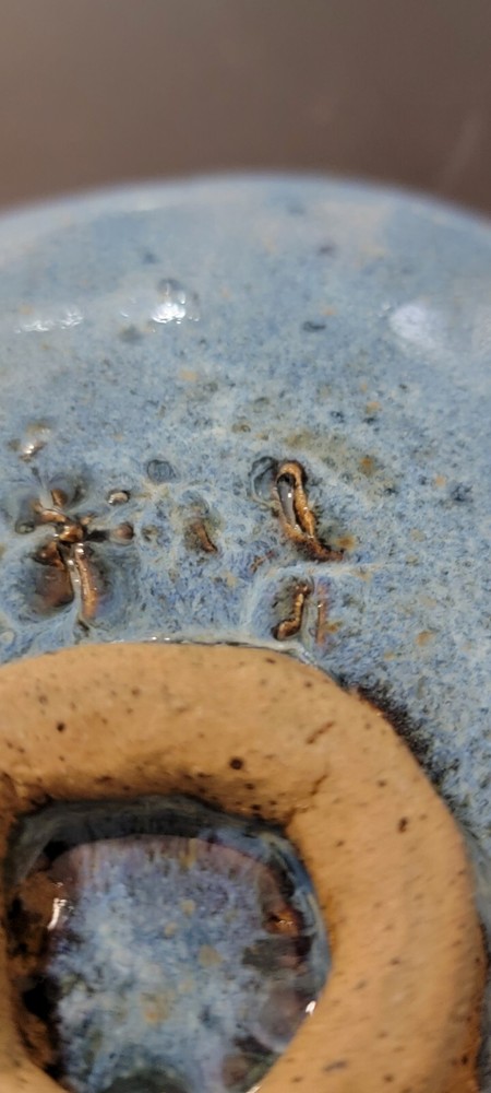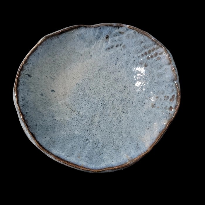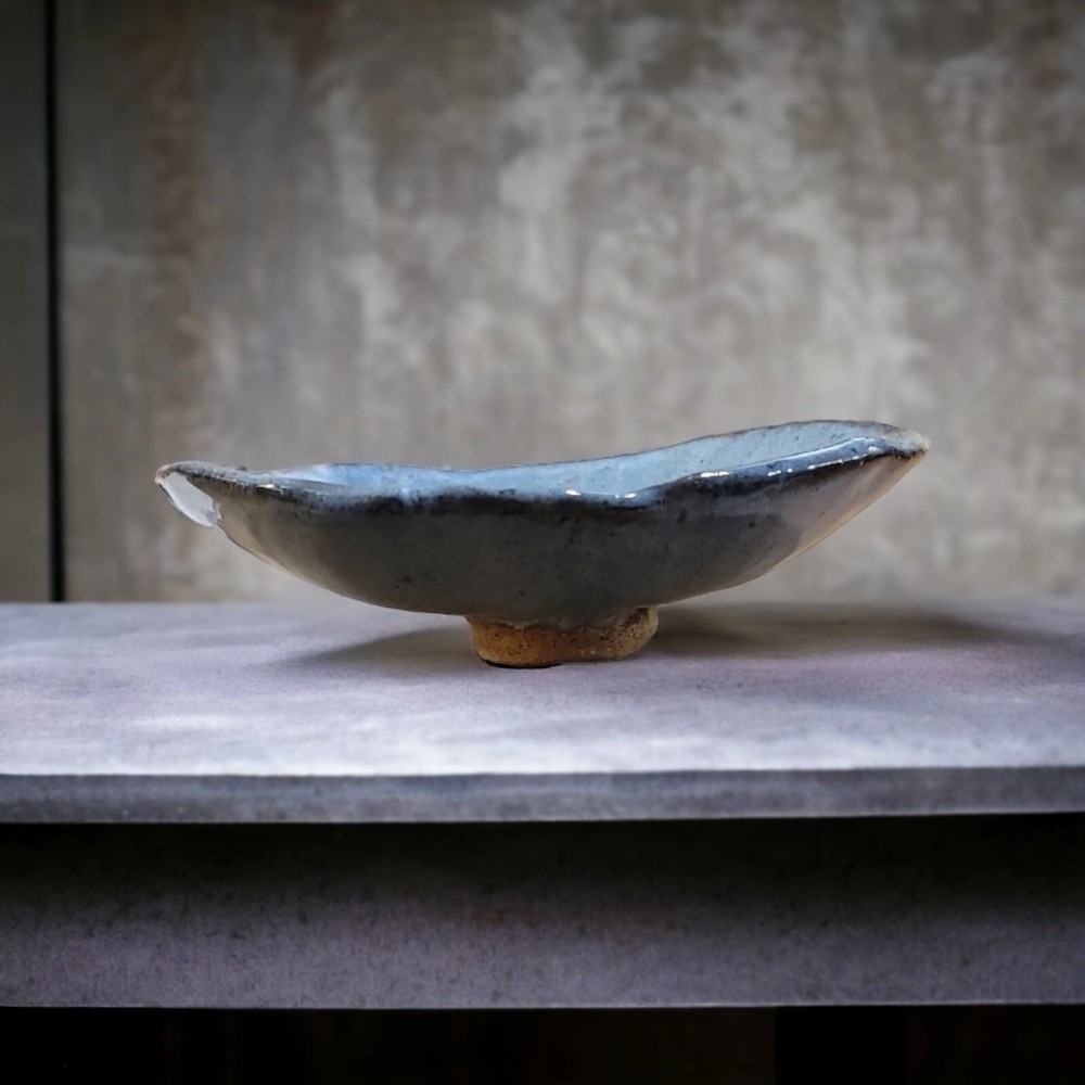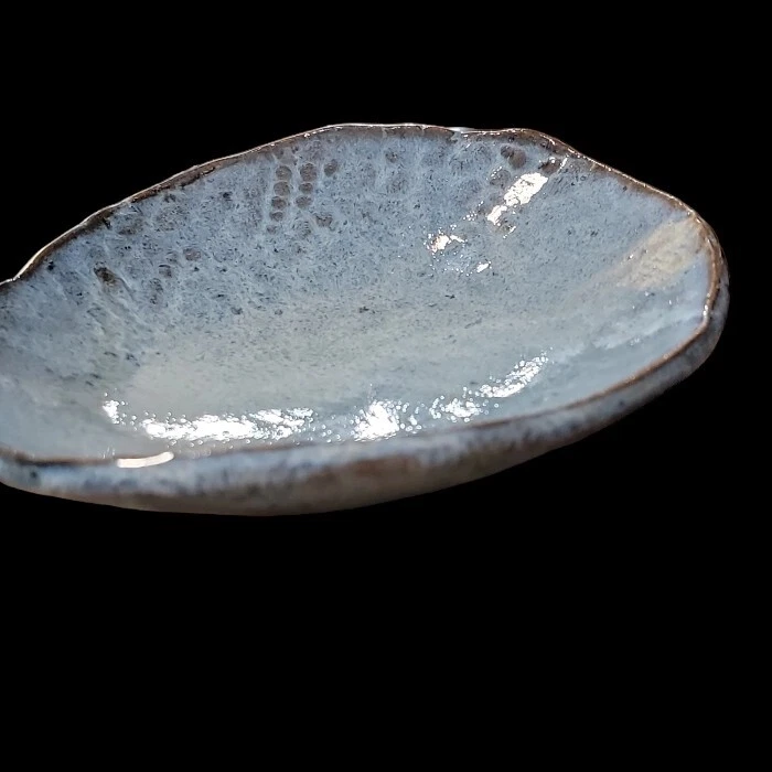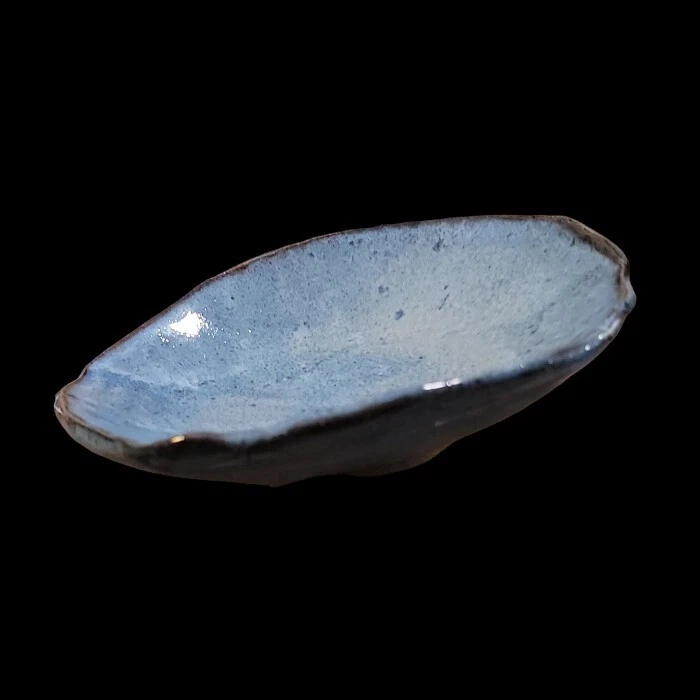 The diameter of this irregular shaped bowl is about 6". It is about 21/2" high on one side and 1 1/2" on the opposite side. The weight before packaging is 10.2 oz. The abstract shaped shallow dish or bowl sits on a small donut shaped footing. It features a glossy blue glaze which is gorgeous, making it a great addition to any collection. It is handmade and signed, with an incised backstamp to authenticate its originality. Interesting signature but I can not decipher the markings.