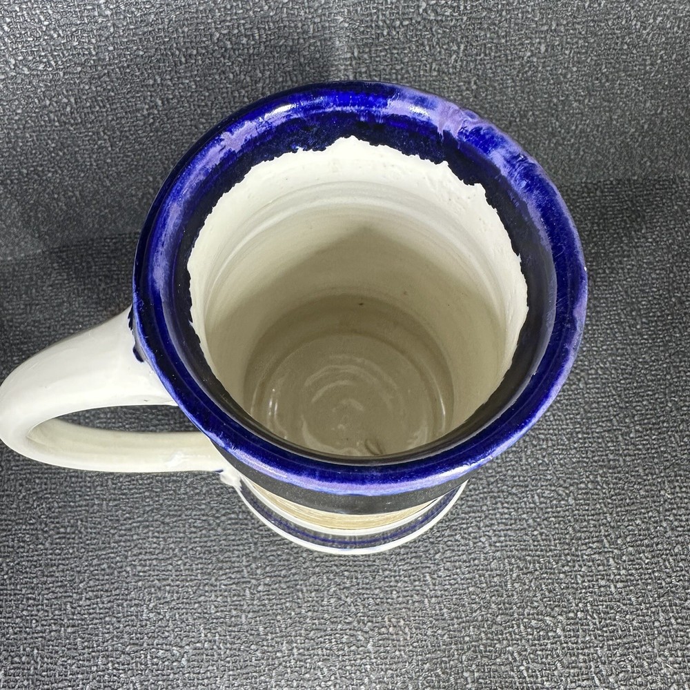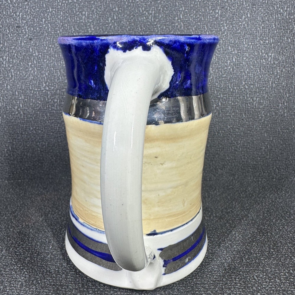 Just got this amazing vintage tankard and it's even better in person! The silver and blue glaze is stunning, and it feels so substantial in hand. Perfect condition, clean from a smoke-free home. Absolutely love this unique piece - it's my new favorite coffee mug!