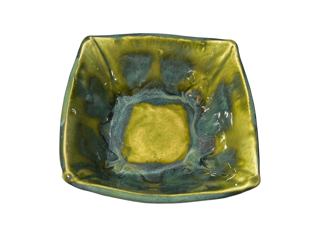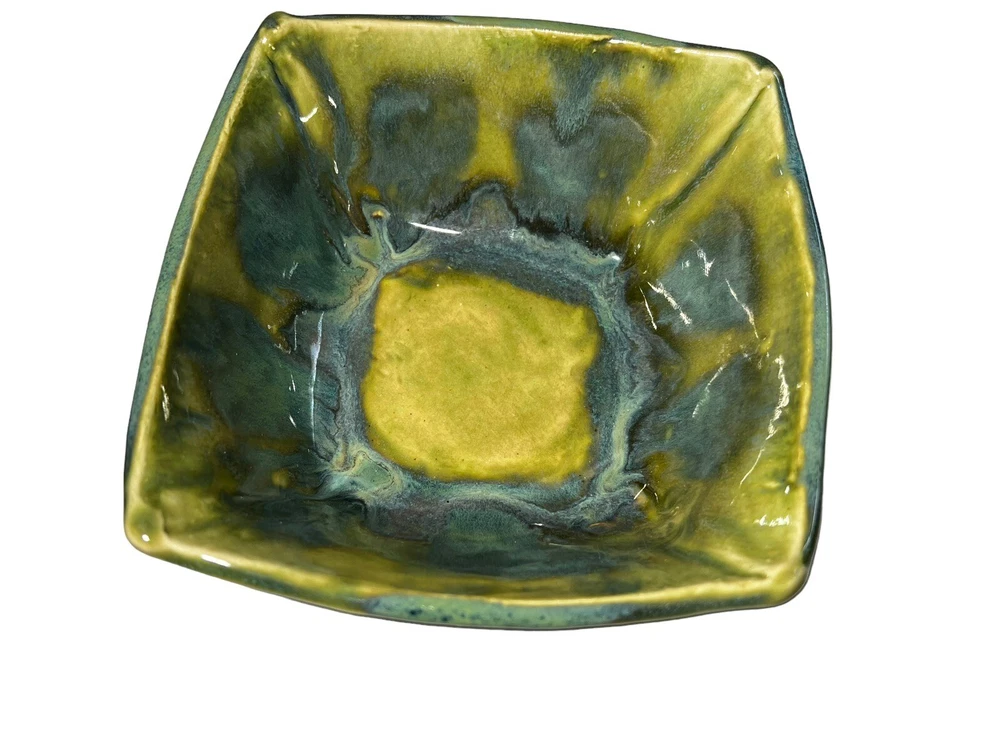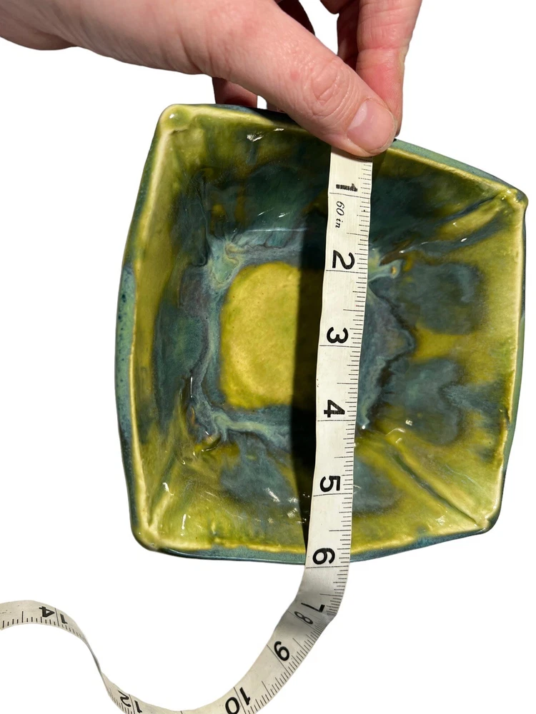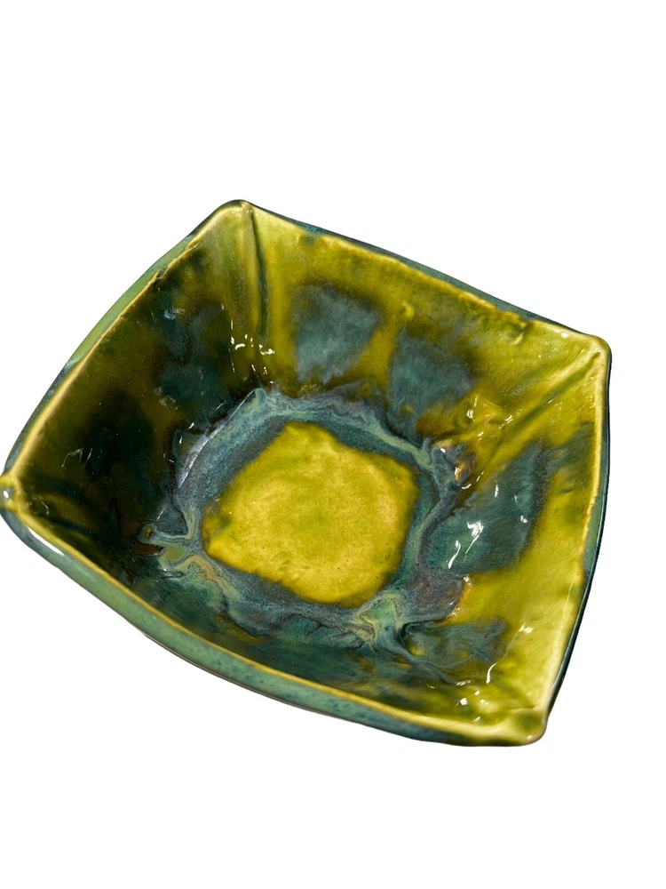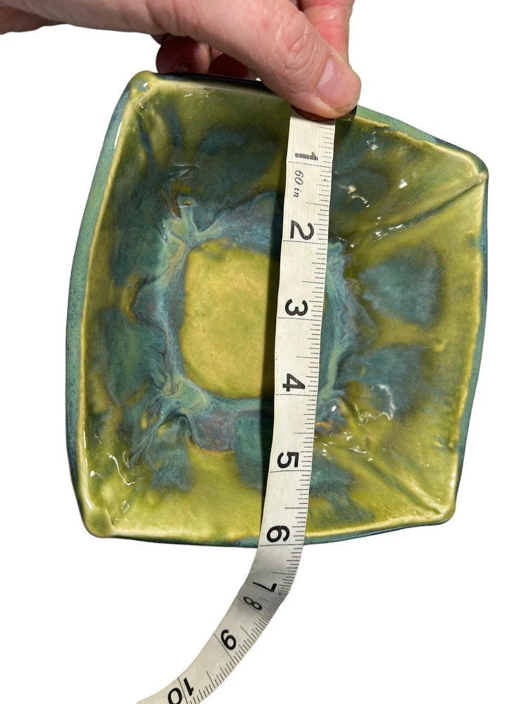 This stunning square bowl is a must-have for any lover of contemporary art pottery. The beautiful multicolor marble drip pattern and glossy finish make it a unique and eye-catching piece, perfect for serving sushi or dips in the included dipping bowls. Handmade by an artisan and crafted in a studio, this bowl is an original and one-of-a-kind item that will add a touch of elegance to any table setting. Measuring 6" in length and width and 2" in height, with a depth of 2.5", this bowl is perfect for both decorative and practical purposes. Thank you for checking out one of our items! We do reuse packaging to help recycle, but all fragile items are bubble wrapped and packaged to prevent any and all damage. We have over 20 years in reselling and take care of our packages and customers. If you have any problem whatsoever, please do not hesitate to contact us.