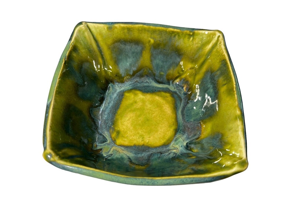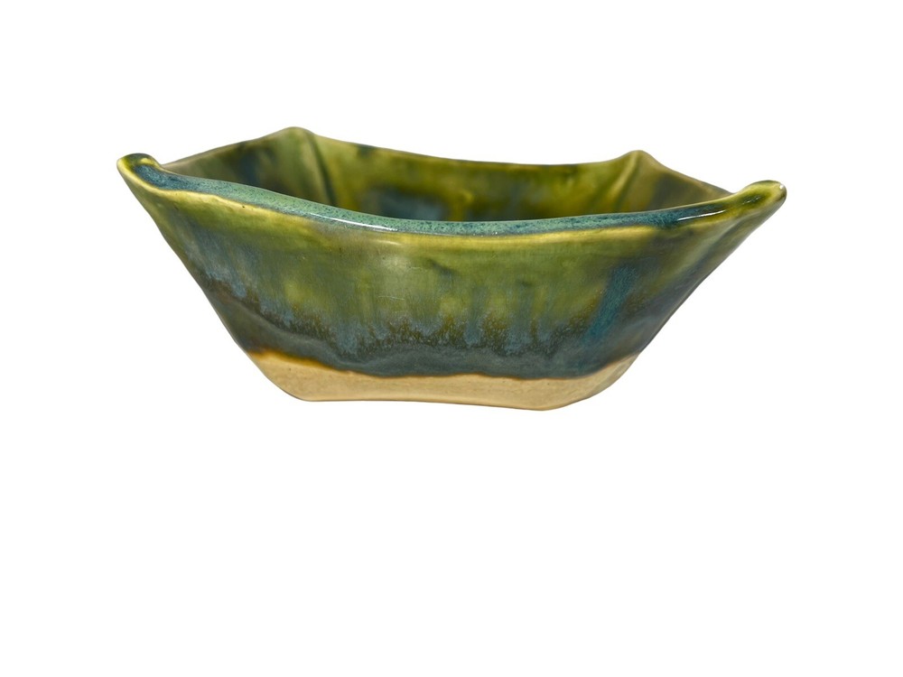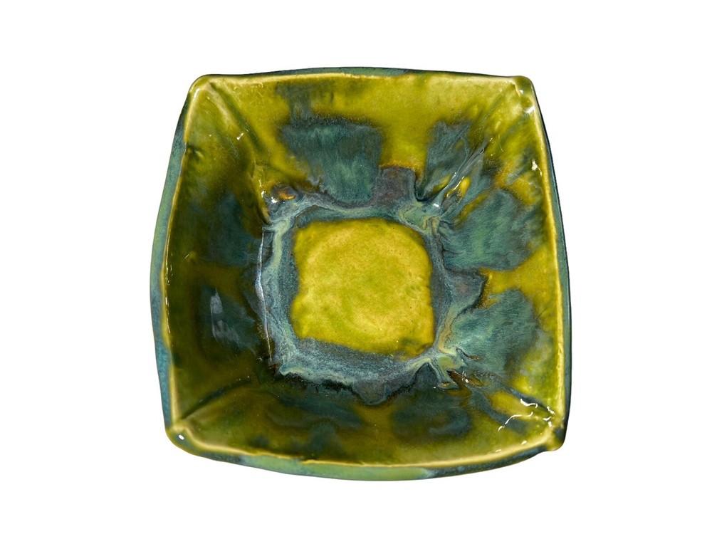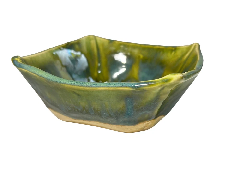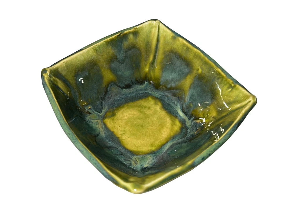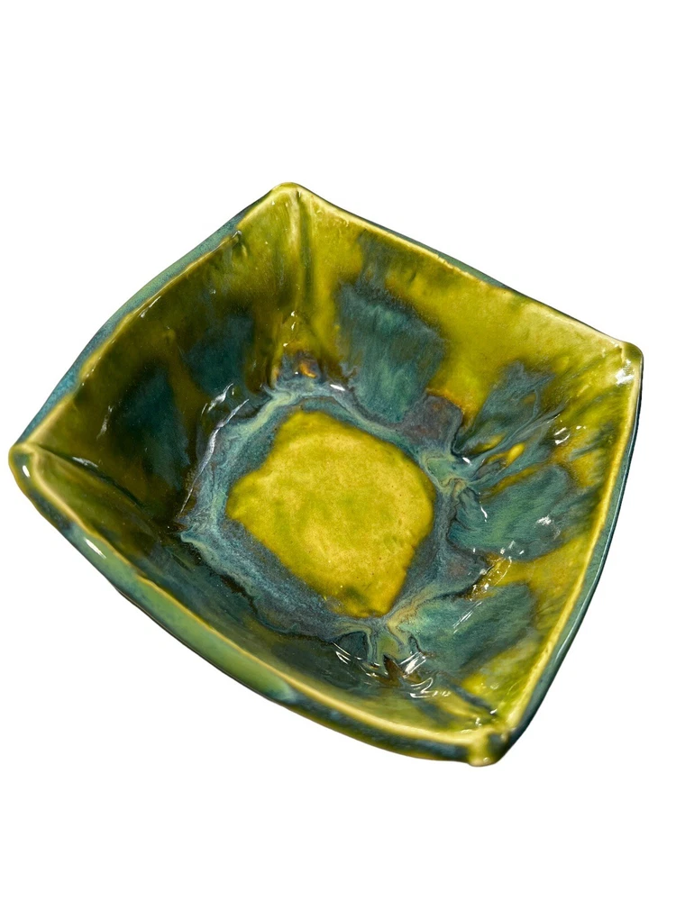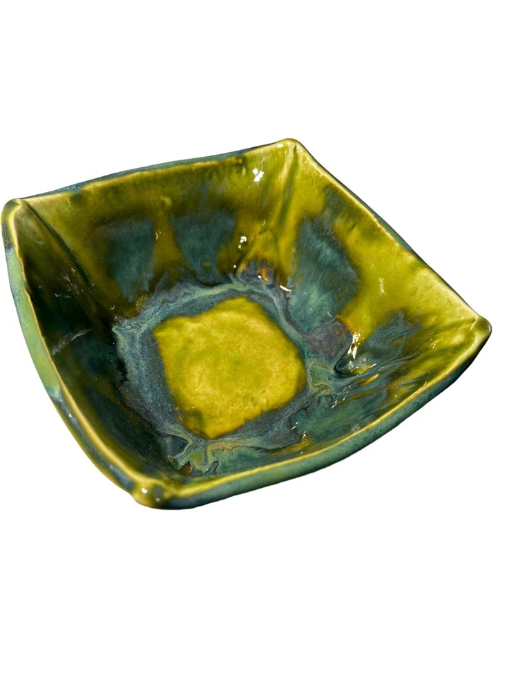 This stunning art pottery bowl is a true showstopper! The vibrant blues, greens, and purples swirl together in a mesmerizing marble pattern that catches the light beautifully. The glossy finish and unique square shape make it perfect for serving sushi or displaying as a decorative piece. I love that it comes with matching dipping bowls—such a thoughtful touch! Handcrafted by an artist, it feels special and high-quality. The size is just right for small servings or as a centerpiece. Every time I use it, guests compliment its beauty. A fantastic addition to my collection!