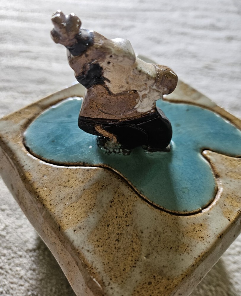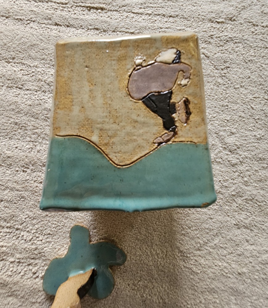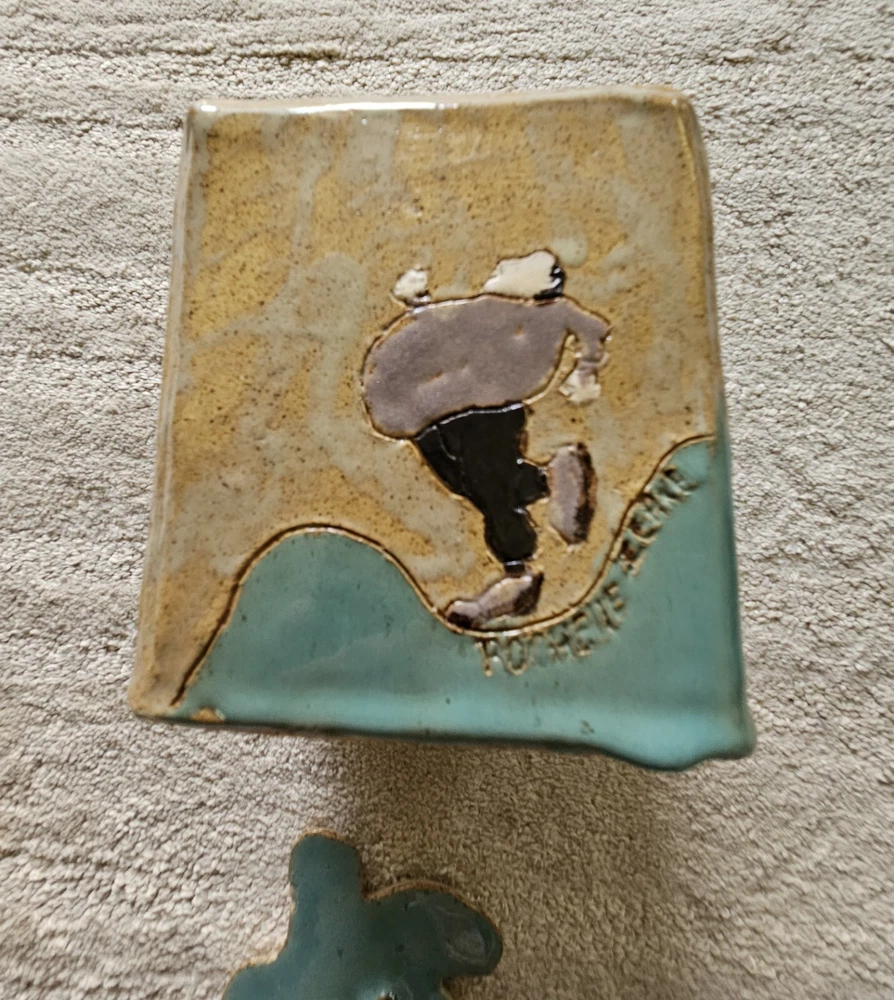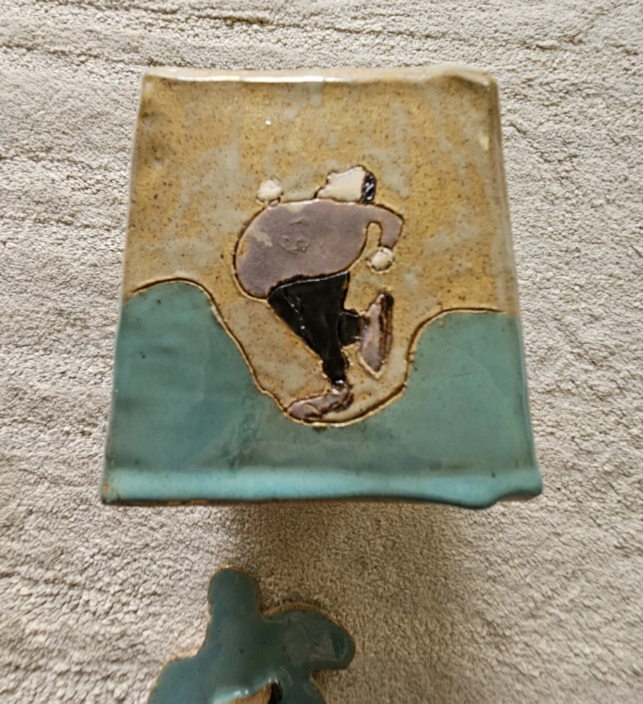 Studio Art Pottery Square Box Jar Jogger Runner Handle Side Designs Hills. Signed Rochelle Zerke. Clean reglued break on lid. Height 9 inches with Handle. Width 5 x 5 Square....