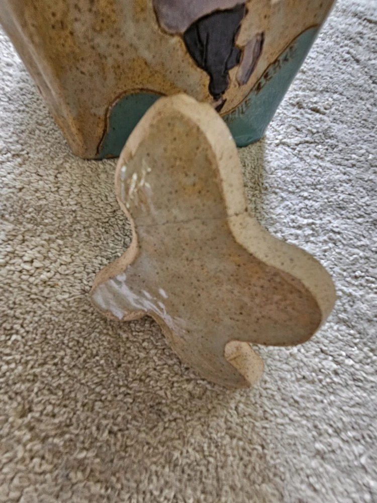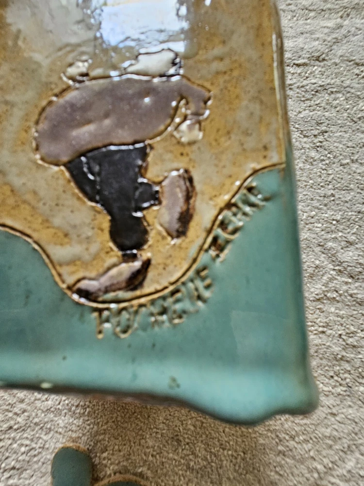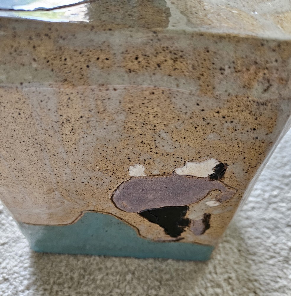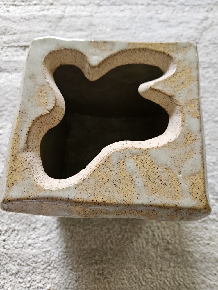 Studio Art Pottery Square Box Jar Jogger Runner Handle Side Designs Hills. Signed Rochelle Zerke. Clean reglued break on lid. Height 9 inches with Handle. Width 5 x 5 Square....