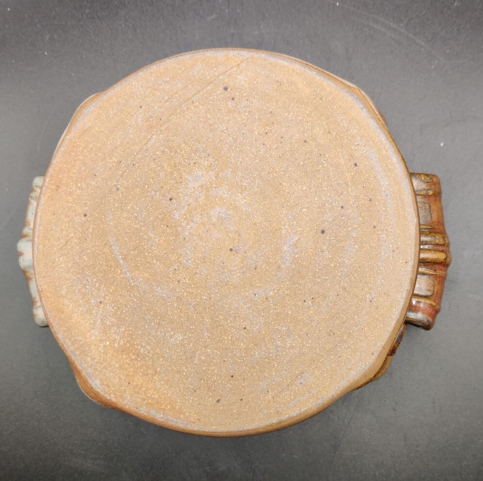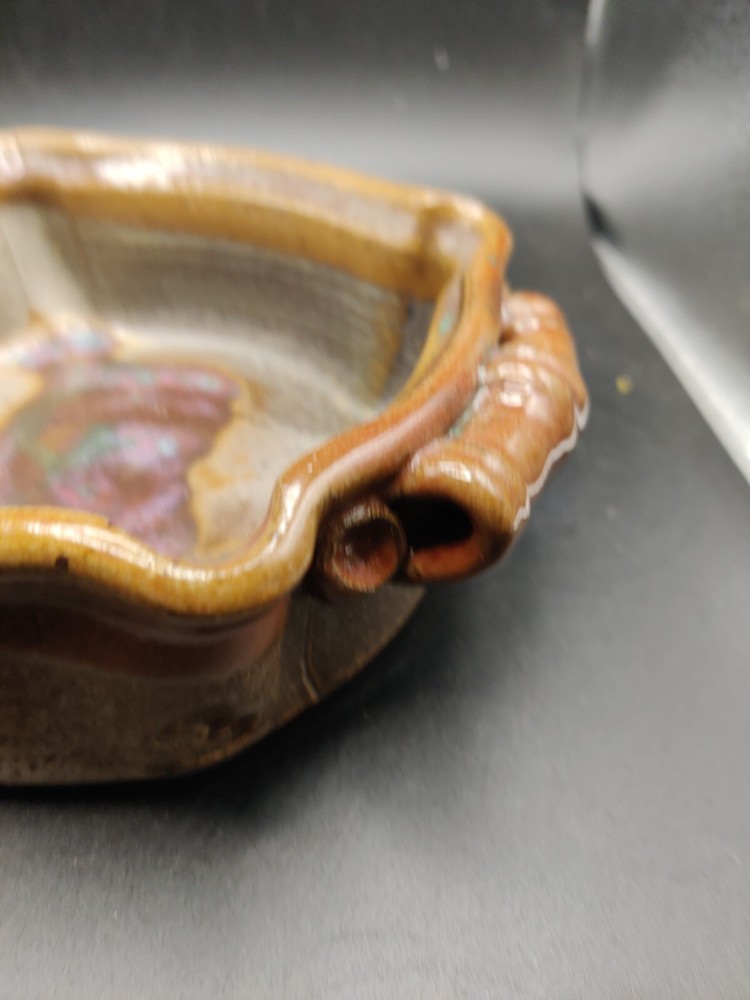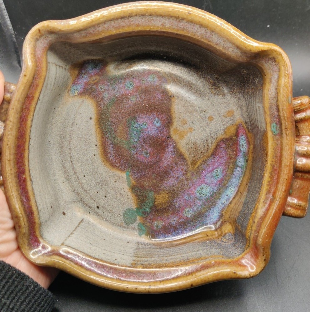 This beautiful studio art pottery square dish is sure to impress. Crafted from high-quality clay and stamped with the SB logo, this dish is a must-have for any collector. Its unique shape and brown color make it a perfect addition to any home decor. Ideal for serving snacks or side dishes, this bowl is perfect for both casual and formal occasions. Its production style is art pottery, adding a touch of elegance to any setting. Don't miss out on the opportunity to own this stunning piece. 7" x 6" x 2"