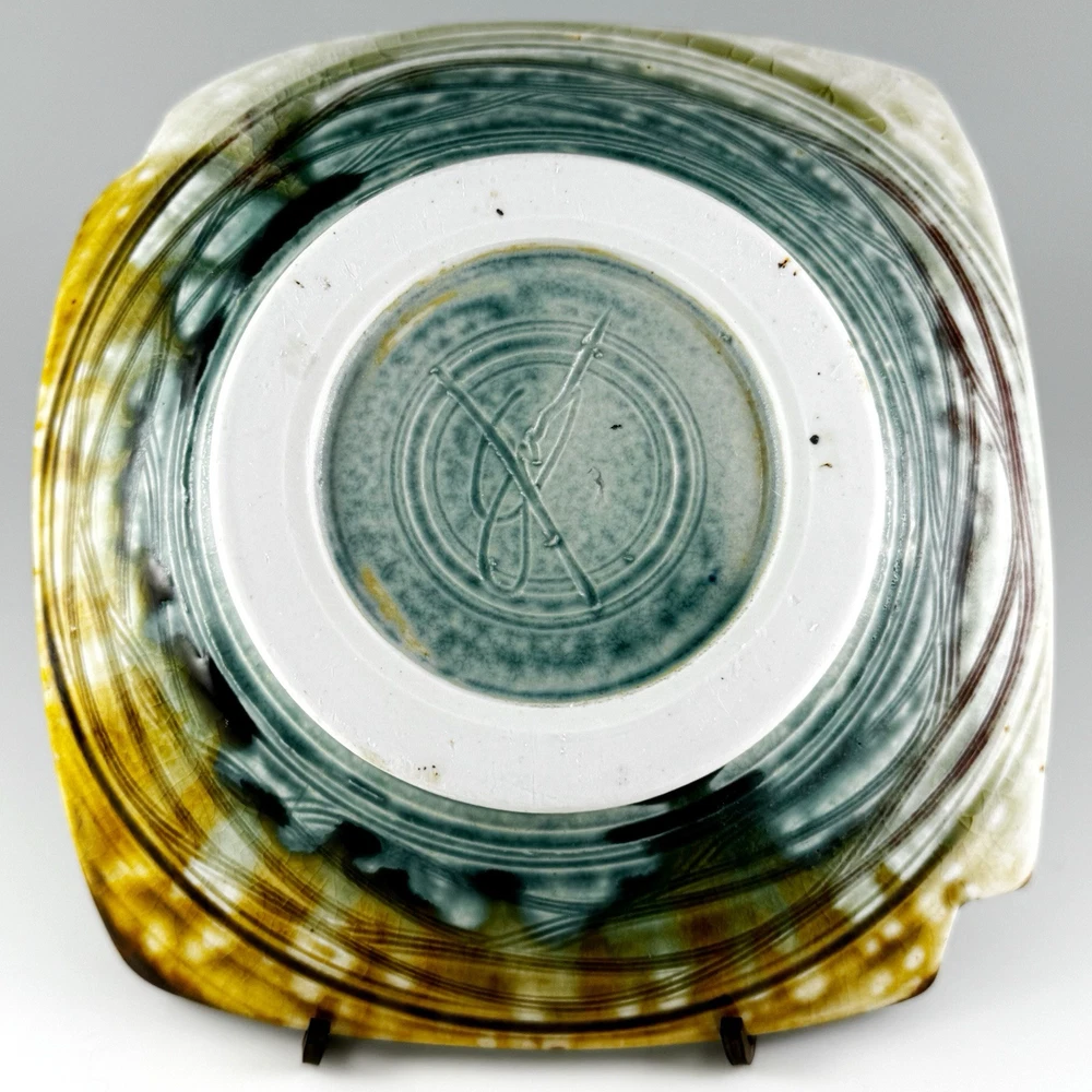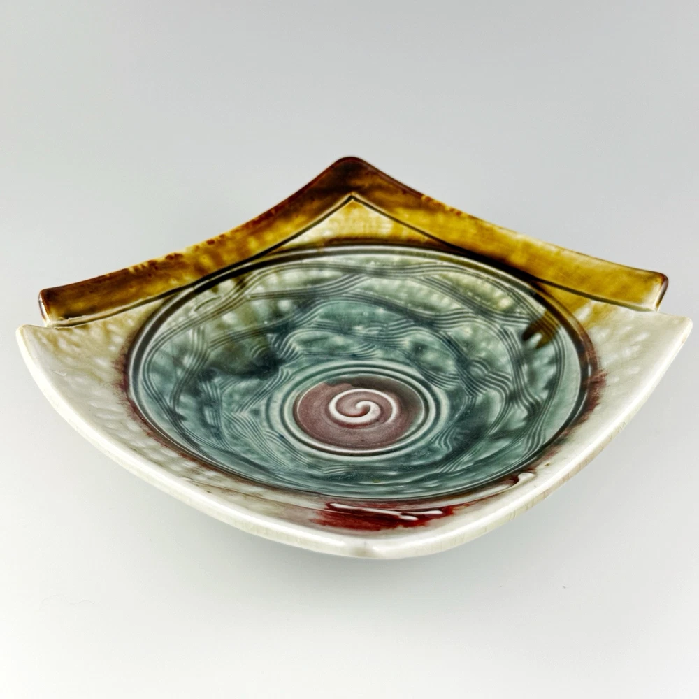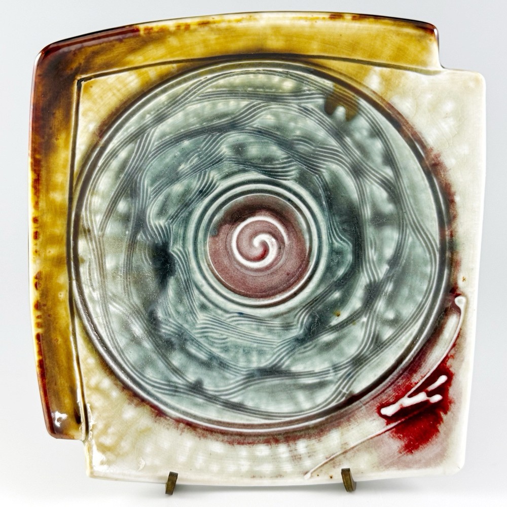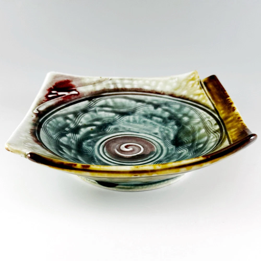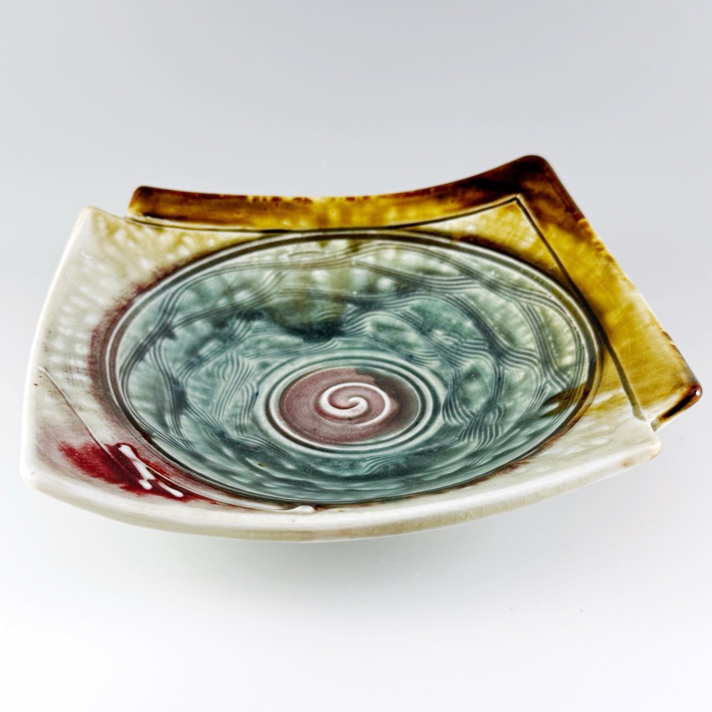 Studio pottery textured square decorative bowl Red, blue & brown glazed stoneware Vintage Crazing (see last photo) 6 5/8 x 6 5/16 x 2 in (16.8 x 16 x 5 cm) Signed on bottom Handmade in USA Display stand not included Handmade, studio art pottery stoneware bowl with circular and wavy lines, glazed in a rich blue and brown with red accents!