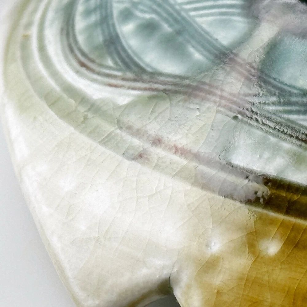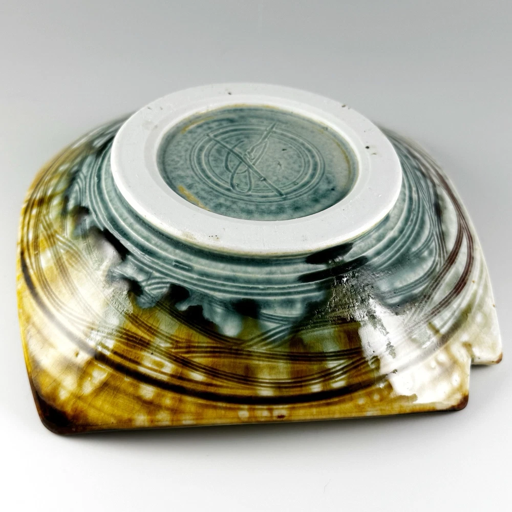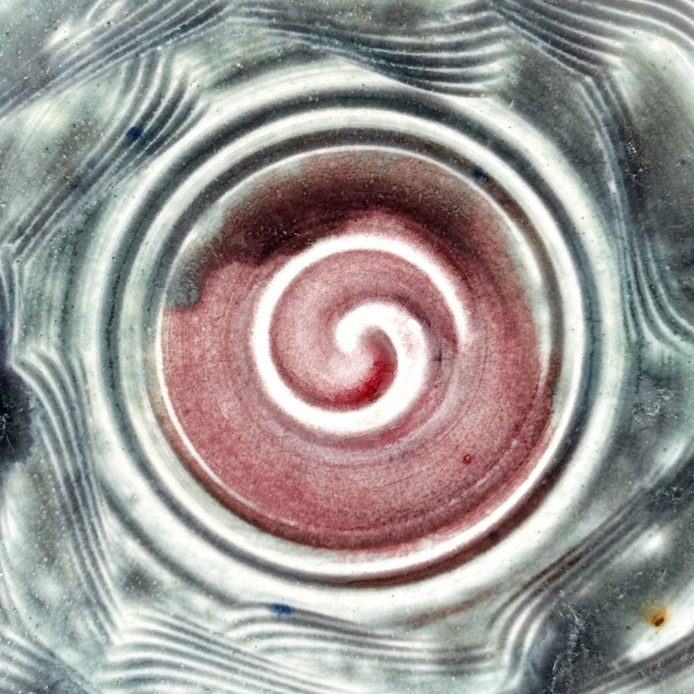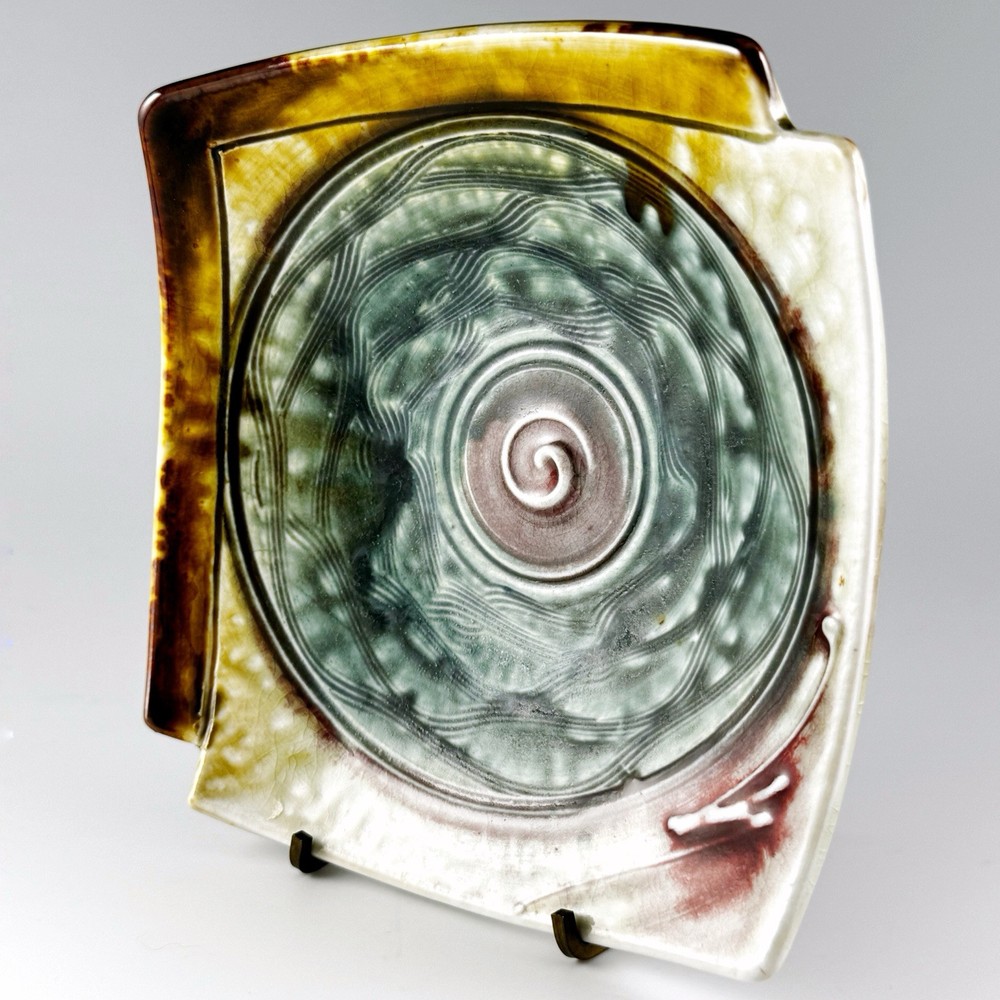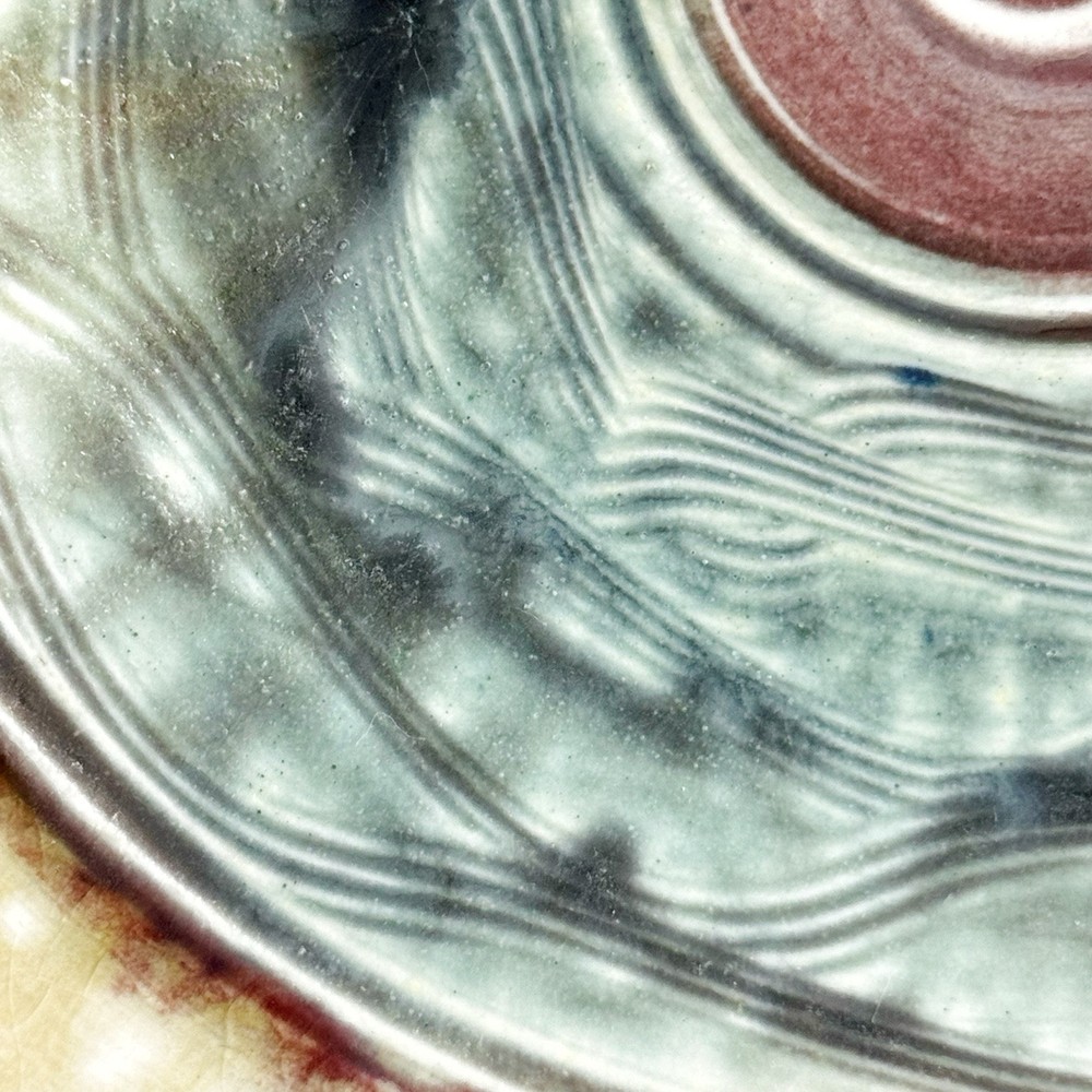 Studio pottery textured square decorative bowl Red, blue & brown glazed stoneware Vintage Crazing (see last photo) 6 5/8 x 6 5/16 x 2 in (16.8 x 16 x 5 cm) Signed on bottom Handmade in USA Display stand not included Handmade, studio art pottery stoneware bowl with circular and wavy lines, glazed in a rich blue and brown with red accents!