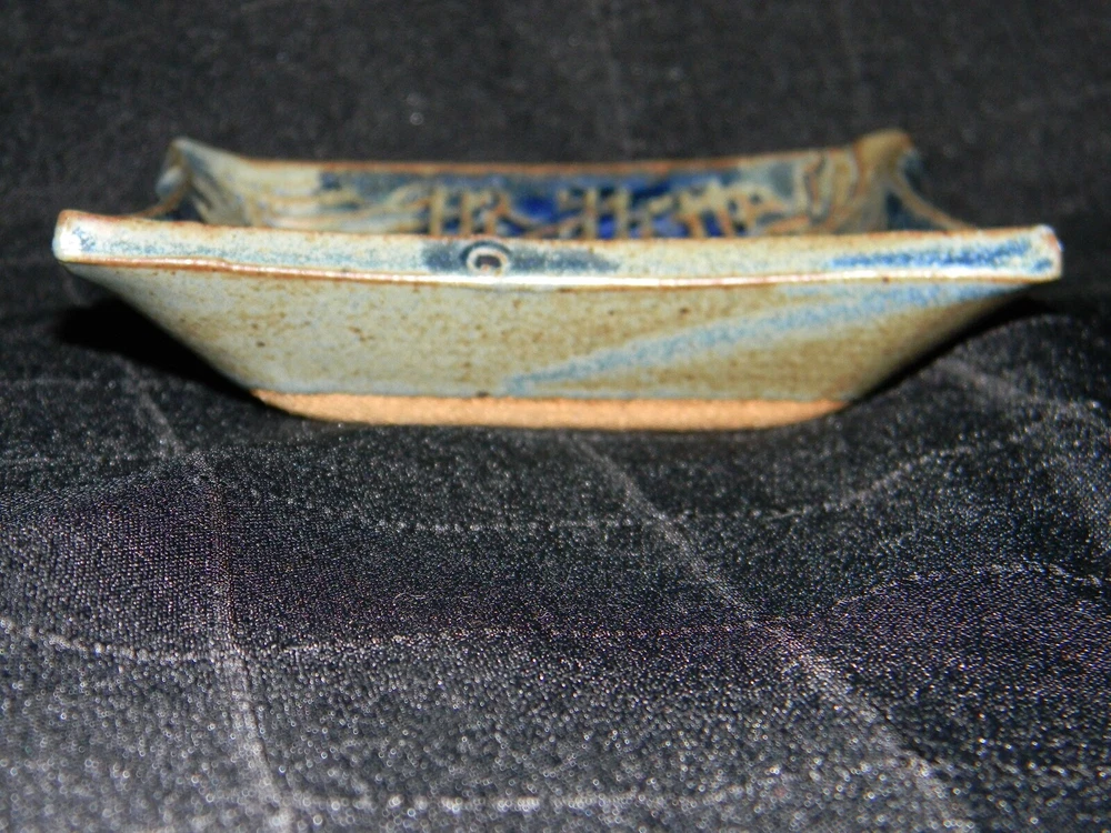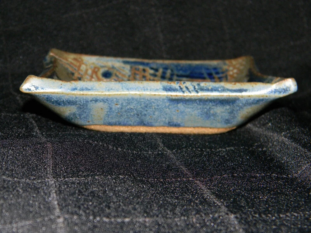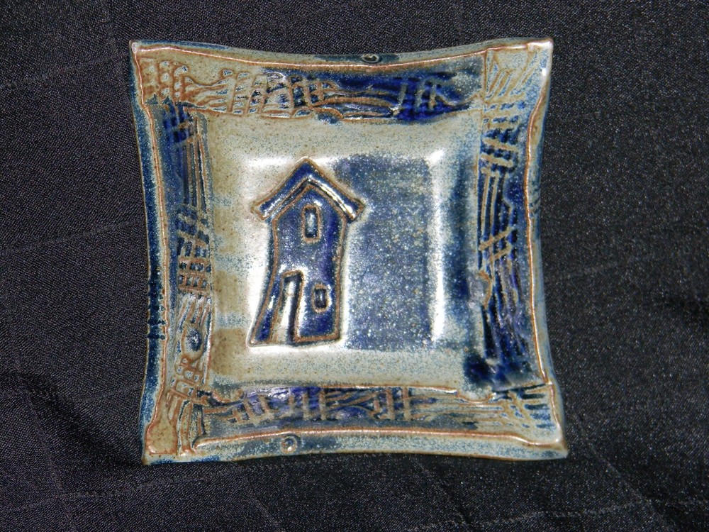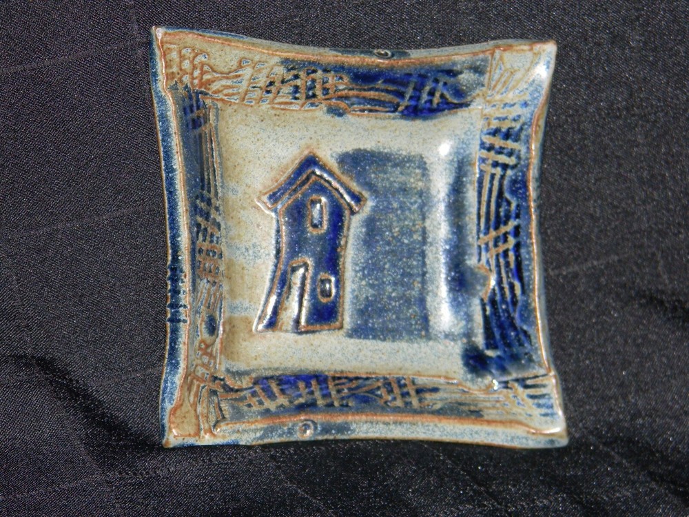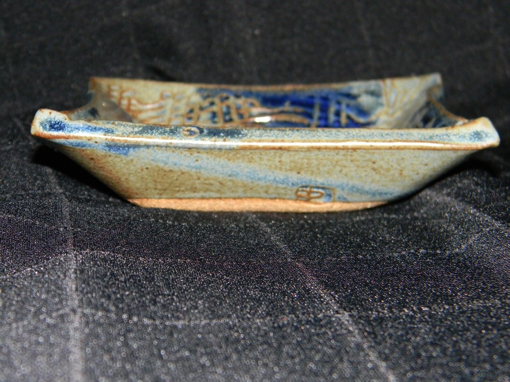 Blue & Brown Pottery Square Trinket Dish with Raised House Measures approximately 1 3/8" tall, 5 1/8" across Stamped on the back with an 'A' inside a square Excellent pre-owned condition. Please view pictures and utilize the enlarge feature for most accurate condition description.