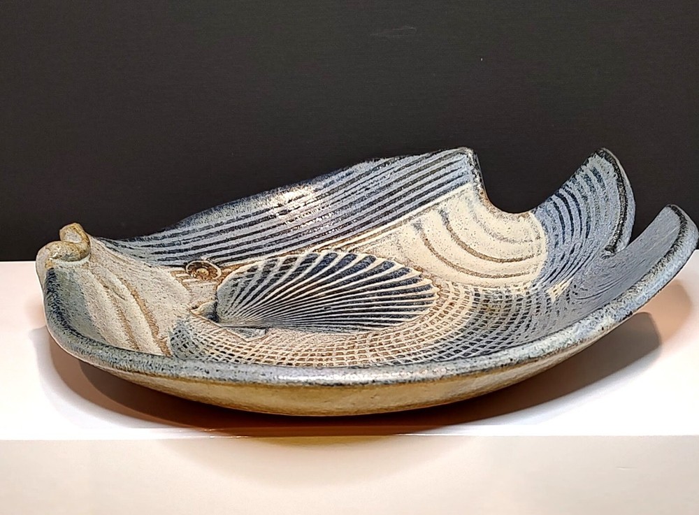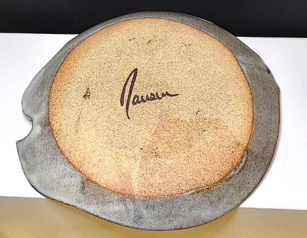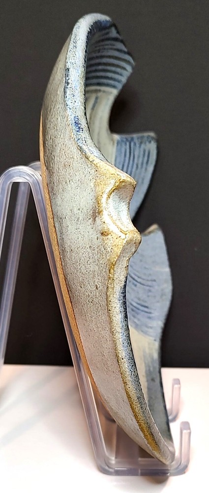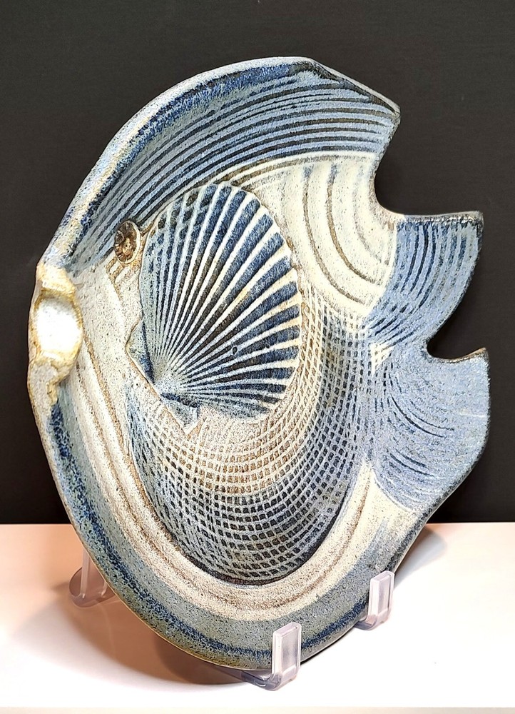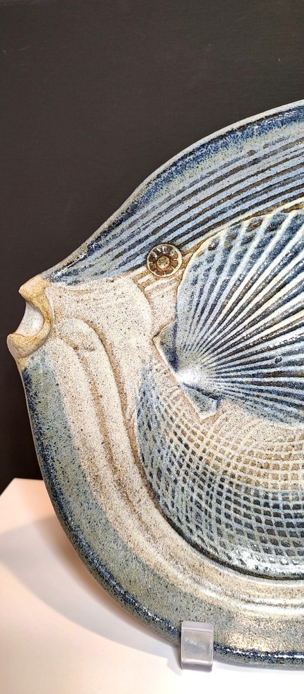 This decorative fish shaped plate features an embossed design of scales and a scallop shell, adding a unique touch to your tableware collection. The plate is made of stoneware and has a diameter of 9 inches. The matte blue and tan glaze has a finish reminiscent of vintage salt glazed pottery giving it a subtle and elegant look. Use it as a serving plate or display it as a decorative item. Perfect for those who appreciate handmade and artistic pottery pieces. Signed. No chips or cracks. Ships from smoke-free home.