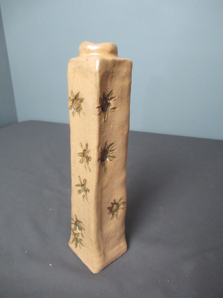 Studio Art Pottery Vase Hand Made - Tall Square - Sun Design Olive - Gold Approximately... 9'' tall x 2 1/8'' wide In good condition with no cracks or chips Made well with great color and detail Ready to use or just display We will be happy to combine items for shipping. Please feel free to keep shopping and we will send you an updated invoice with combine shipping rates. FROM A SMOKE FREE HOME WE DO OUR BEST TO DESCRIBE THE ITEMS AS ACCURATELY AS POSSIBLE SHIPPING... All shipping costs are the calculated rate as determined by the United States Post Office. We do not inflate shipping cost. We refund any overpaid shipping cost once the label is printed. We will ship your item within 3 business days after payment is received. We ship on business days only: Saturday, Sunday and Holidays are not considered business days. We have no control over how the US Post Office handles the package. You will receive a Delivery Confirmation by email so you can track your package. INTERNATIONAL PACKAGES … Import duties, taxes, and custom charges are not included in the item price or shipping cost. These charges are the buyer's responsibility. Please check with your country's customs office to determine what these additional costs will be prior to bidding or buying. Please be aware some international packages could take up to 6 weeks to receive.