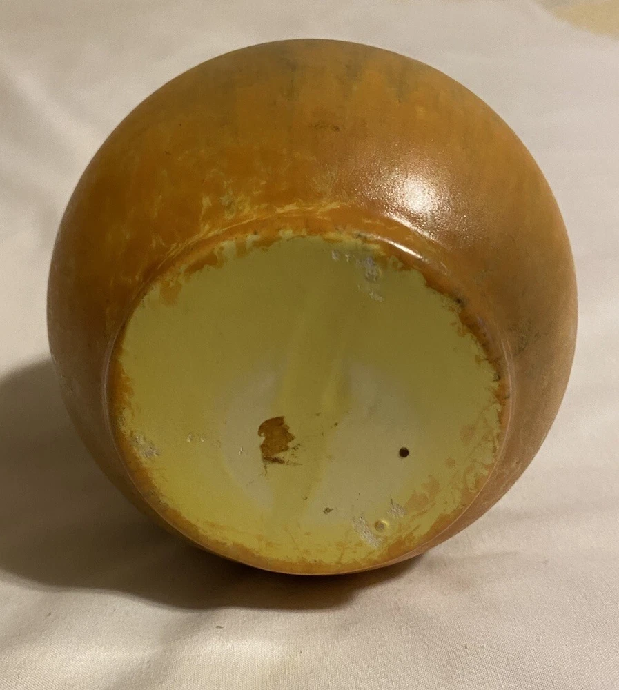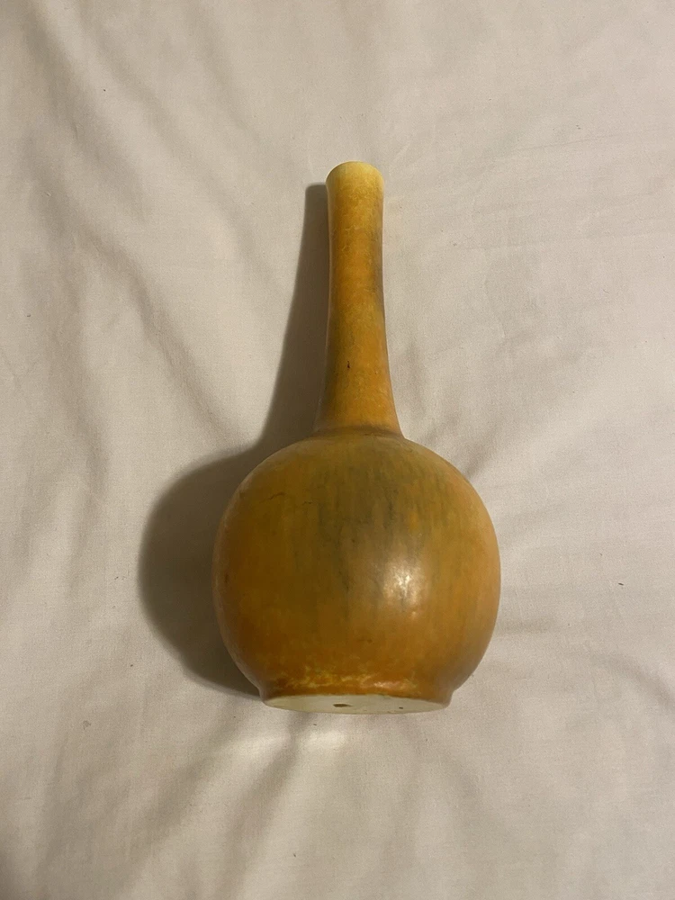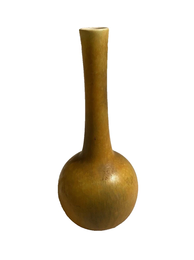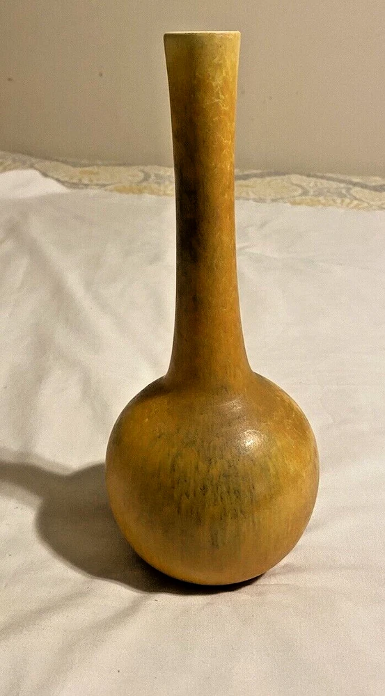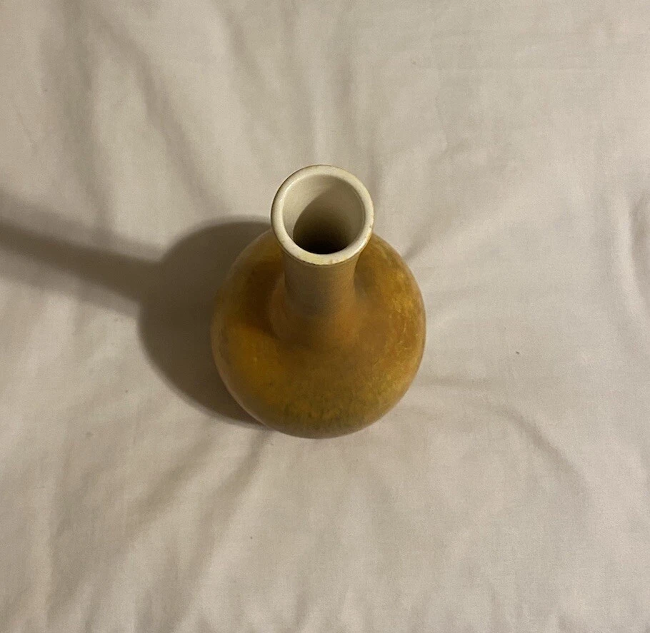 This Studio Art Pottery Vase is a vintage piece originating from North America. It features a bulbous shape with a yellow, gold, and green mix color pattern, making it a unique and decorative addition to any room. Made of porcelain, this 11-inch vase has a smooth texture and is ideal for displaying small flower arrangements or single stems. With a retro style, this bud vase is a one-of-a-kind piece perfect for collectors or those who appreciate artisanal pottery. Great vintage condition!