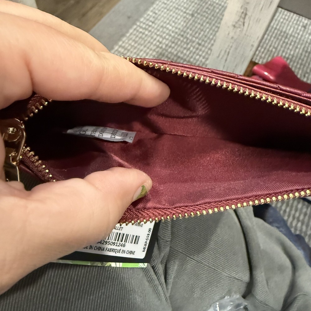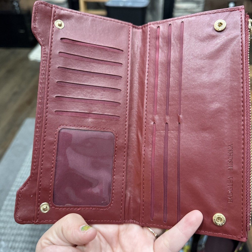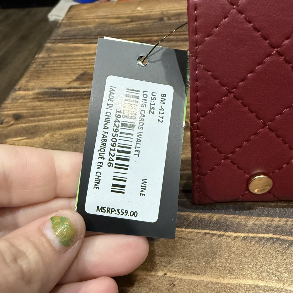 This Studio Badgley Mischka Wine Long Cards Wallet is a must-have for any fashionable woman. With a diamond pattern and accents like studded details, a zipper, and a logo, this wallet is both stylish and functional. It is made of faux leather and has a wine exterior color that is sure to turn heads. The wallet has a L size, measuring 4 inches in height and 7.5 inches in width, and it features credit card slots, zippered compartment folding compartments, even has a slot big enough for a cell phone! It is not only vegan, but also comes with an MSRP of $59. This wallet is perfect for women who want to stay organized and stylish on the go.