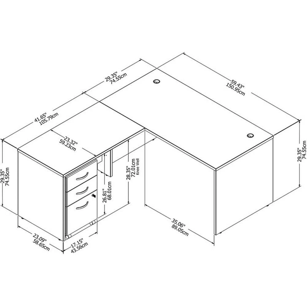 Choose this Bush Business Furniture Studio C L Shaped Desk for a comfortable design that works with you for years and a fresh finish that looks great anywhere. The thermally fused laminate finish, durable edge banding and sturdy end panels resist scratches, stains and dents while standing up to the rigors of a 40-plus hour work week. Keep pesky computer cords out of your way with the cable management system for an organized work surface. The 42W Return attaches to either side of the 60W Desk to form a left or right handed L Shaped layout, while the 3 Drawer Mobile File Cabinet rolls throughout your office or remains in place as needed. One file drawer accepts legal, letter and A4-size paperwork while two box drawers organize office supplies. This desk with storage set comes with a 10 Year Warranty and meets ANSI/BIFMA quality test standards. American made with U.S. and imported parts. Features: Bundle includes: 60W x 30D Office Desk, 42W Desk Return, 3 Drawer Mobile File Cabinet Thermally fused laminate finish fends off scratches and stains to protect the office furniture set L Shaped Desk surface offers space to spread out and integrated cable management to conceal computer cords Return attaches to either side of the Desk to form a right or left handed layout Mobile File Cabinet locks to secure your letter, legal and A4 size paperwork with a file drawer gliding on smooth full-extension ball bearing slides Filing cabinet includes 2 box drawers with 1 file drawer and rolls wherever you need it Available in your choice of several contemporary and traditional finishes to fit any work environment Tested to meet ANSI/BIFMA quality standards for safety and performance Backed by the Bush Business Furniture 10 Year Manufacturer's Warranty Specifications: Product Dimensions: 60W x 30D Desk Shell: 59.45"L x 29.37"W x 29.84"H Product Dimensions: 16W 3 Drawer Mobile Pedestal - Assembled: 15.71"L x 20.16"W x 27.87"H Product Dimensions: 42W Return/Bridge: 41.65"L x 23.35"W x 29.84"H Product Weight: 247 lbs Material: Engineered Wood Product Color: Platinum Gray