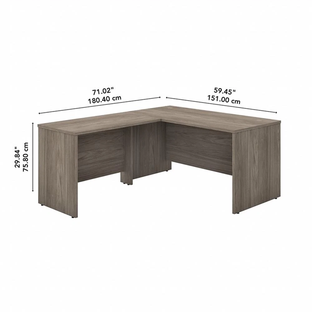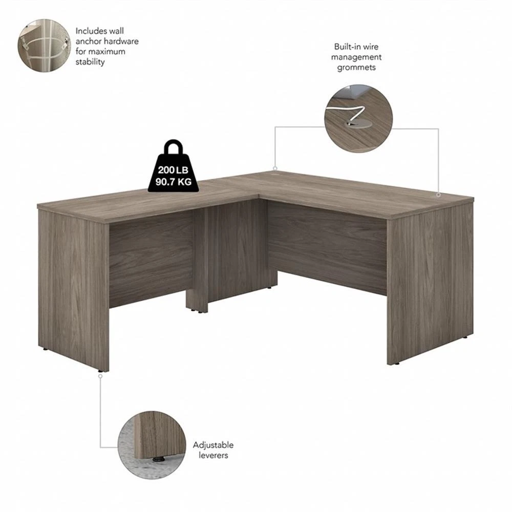 Highlighted by its contemporary style and commercial quality design, the Bush Business Furniture Studio C 60W L Shaped Desk with 42W Return presents an ideal workspace for the modern professional. Take advantage of the spacious surface to spread out with a computer, paperwork and more as you tackle your next big project. The L shaped desktop easily accommodates multiple monitors and other materials with a 200 lb. weight capacity and built-in wire management grommets. Position the L Desk in a corner to save space in a small private office, or make use of the finished back to face outward in an open-plan environment. The Return can be installed on either side of the main work surface for a right or left-handed configuration. This corner desk is tested to meet ANSI/BIFMA standards for safety and performance and is backed by a 10 Year Warranty. American made with U.S. and imported parts. Materials: Engineered wood and Laminates. Features: Bundle includes: 60W x 30D Office Desk, 42W x 24D Desk Return Durable thermally fused laminate surface and sturdy end panels protect the Corner Desk from scratches, stains, dings and dents L Shaped Desk supports multiple monitors and other materials with a weight capacity of 200 pounds Desktop includes built-in wire management grommets to keep cords and cables out of the way while you work Return attaches to either side for a right or left-handed configuration, and the L Desk is finished on all sides to look great facing any direction Available in your choice of several contemporary and traditional finishes Add under desk storage with Studio C's coordinating 2 and 3 Drawer Mobile File Cabinets (sold separately) Tested to meet ANSI/BIFMA quality standards for safety and performance Backed by the Bush Business Furniture 10 Year Manufacturer's Warranty Specifications: Product Dimensions: 42W Return/Bridge: 41.65"W x 23.35"D x 29.84"H Product Dimensions: 60W x 30D Desk Shell: 59.45"W x 29.37"D x 29.84"H Product Color: Modern Hickory Assembly Required: Yes