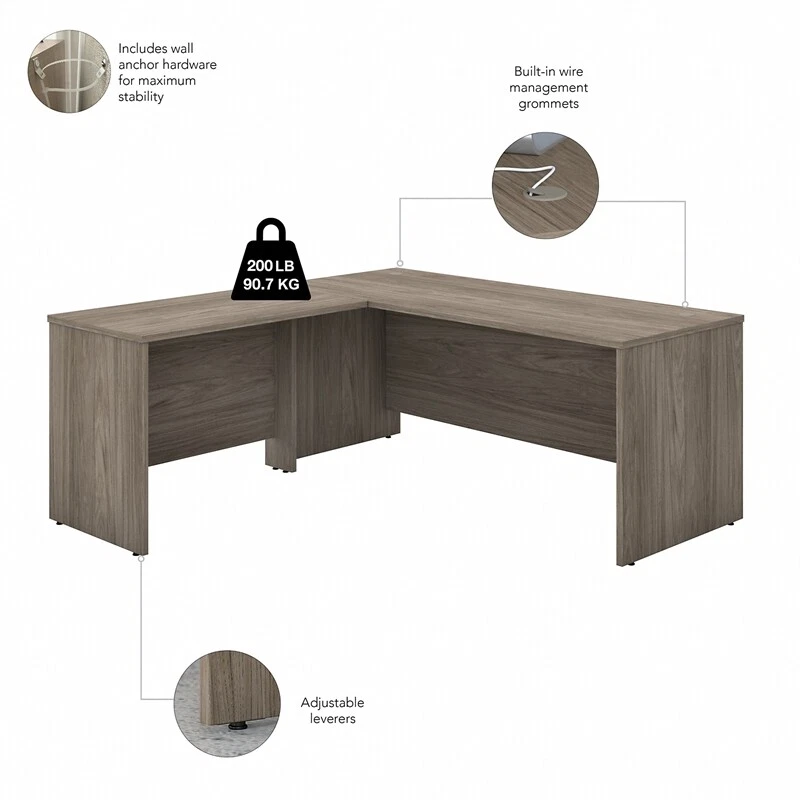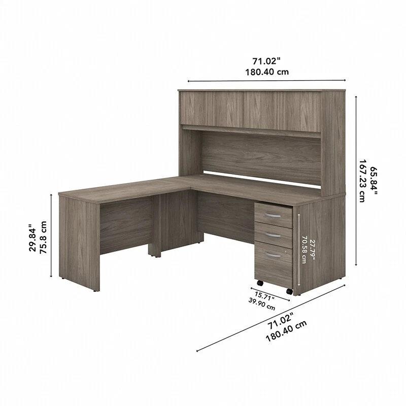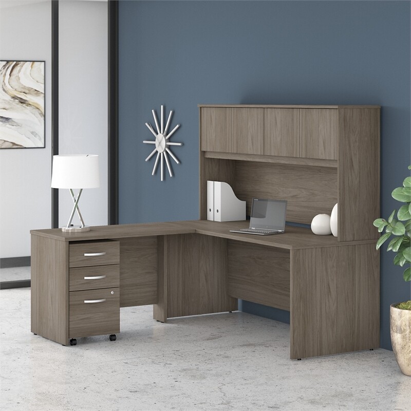 Choose this Bush Business Furniture Studio C L Shaped Desk with Hutch and Mobile File Cabinet for a comfortable design that works with you for years. The thermally fused laminate finish, durable edge banding and sturdy end panels resist scratches, stains and dents while standing up to the rigors of a 40-plus hour work week. The 42W Return attaches to either side of the 72W Desk to form a left or right handed L Shaped layout. With 4 doors featuring self-closing Euro-style hinges, the Hutch conveniently stores office supplies, books and more. The 3 Drawer File Cabinet rolls throughout your office or remains in place as needed on any surface. One file drawer accepts legal, letter and A4-size paperwork while two box drawers organize supplies. This desk with storage set comes with a 10 Year Warranty and meets ANSI/BIFMA quality test standards. American made with U.S. and imported parts. Materials: Engineered wood and Laminates. Features: Bundle includes: 72W x 30D Office Desk, 42W Desk Return, 72W Hutch, 3 Drawer Mobile File Cabinet Thermally fused laminate finish fends off scratches and stains to protect the office furniture set L Shaped Desk surface offers space to spread out and integrated cable management to conceal computer cords Return attaches to either side of the Desk to form a right or left handed layout 4 Hutch doors provide plenty of storage room and include self-closing Euro-style hinges Mobile File Cabinet locks to secure your letter, legal and A4 size paperwork with a file drawer gliding on smooth full-extension ball bearing slides Filing cabinet includes 2 box drawers with 1 file drawer and rolls wherever you need it Tested to meet ANSI/BIFMA quality standards for safety and performance Backed by the Bush Business Furniture 10 Year Manufacturer's Warranty Specifications: Product Dimensions: 42W Return/Bridge: 41.65"W x 23.35"D x 29.84"H Product Dimensions: 72W x 30D Desk Shell: 71.02"W x 29.37"D x 29.84"H Product Dimensions: 16W 3 Drawer Mobile Pedestal - Assembled: 15.71"W x 20.20"D x 27.79"H Product Dimensions: 72W Hutch: 70.94"W x 14.53"D x 36.00"H Product Color: Modern Hickory Assembly Required: Yes