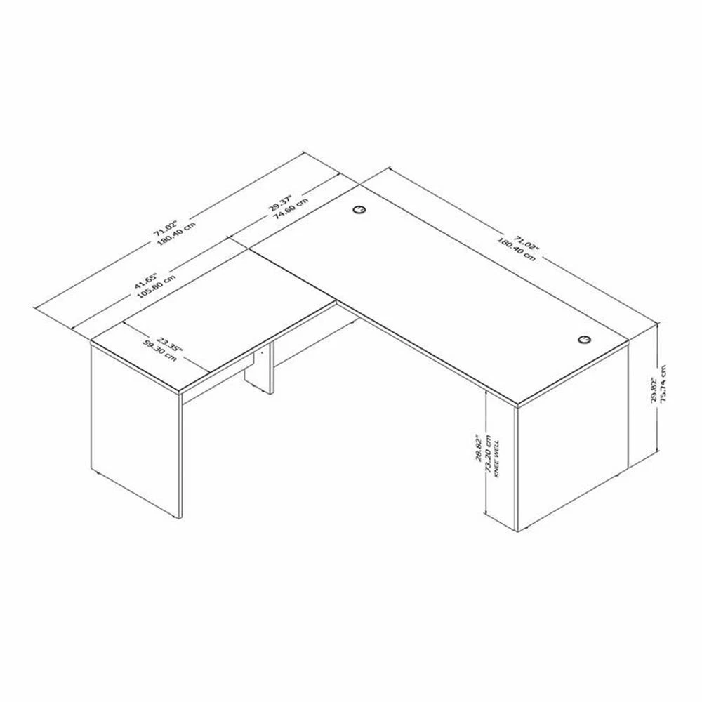 Highlighted by its contemporary style and commercial quality design, the Bush Business Furniture Studio C 72W L Shaped Desk with 42W Return presents an ideal workspace for the modern professional. Take advantage of the spacious surface to spread out with a computer, paperwork and more as you tackle your next big project. The L shaped desktop easily accommodates multiple monitors and other materials with a 200 lb. weight capacity and built-in wire management grommets. Position the L Desk in a corner to save space in a small private office, or make use of the finished back to face outward in an open-plan environment. The Return can be installed on either side of the main work surface for a right or left-handed configuration. This corner desk is tested to meet ANSI/BIFMA standards for safety and performance and is backed by a 10 Year Warranty. Features: Bundle includes: 72W x 30D Office Desk, 42W x 24D Desk Return Durable thermally fused laminate surface and sturdy end panels protect the Corner Desk from scratches, stains, dings and dents L Shaped Desk supports multiple monitors and other materials with a weight capacity of 200 pounds Desktop includes built-in wire management grommets to keep cords and cables out of the way while you work Return attaches to either side for a right or left-handed configuration, and the L Desk is finished on all sides to look great facing any direction Available in your choice of White, Storm Gray, Platinum Gray, Sand Oak, Harvest Cherry and Natural Maple finishes Add under desk storage with Studio C's 2 and 3 Drawer Mobile File Cabinets; also accepts coordinating 72W Hutch (sold separately) Tested to meet ANSI/BIFMA quality standards for safety and performance Backed by the Bush Business Furniture 10 Year Manufacturer's Warranty Material: Engineered Wood Specifications: Product Dimensions: 72W x 30D Desk Shell: 71.10"W x 29.37"D x 29.84"H Product Dimensions: 42W Return/Bridge: 41.65"W x 23.35"D x 29.84"H Product Weight: 196.65 lbs