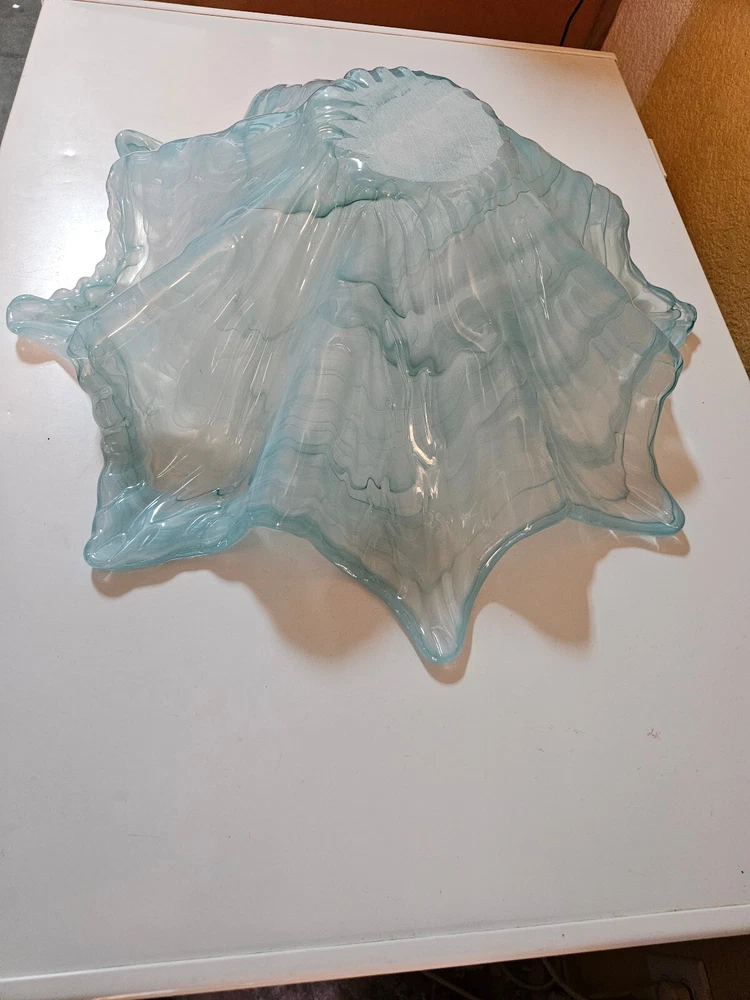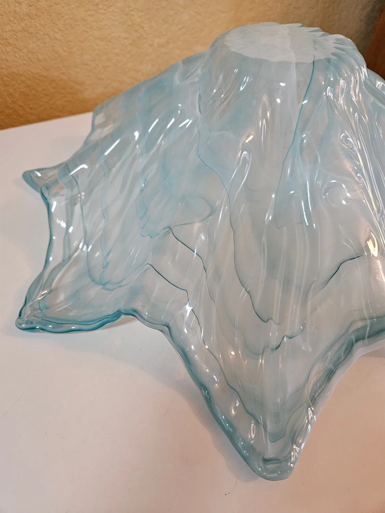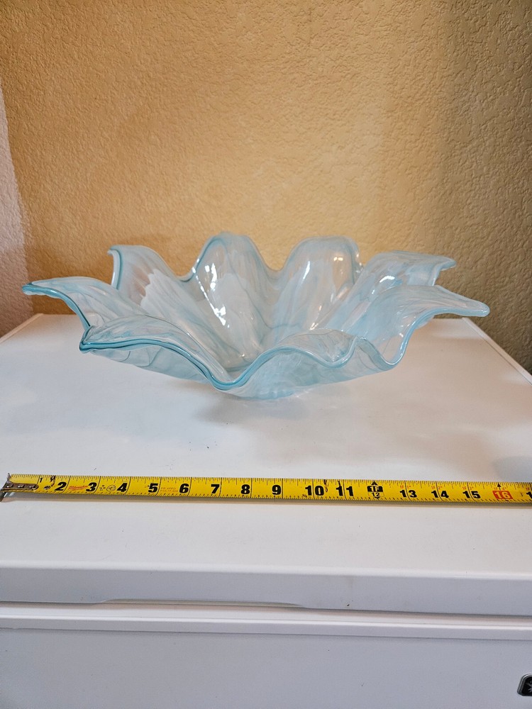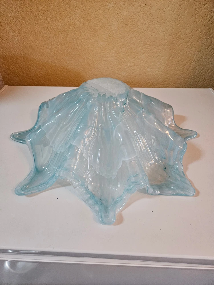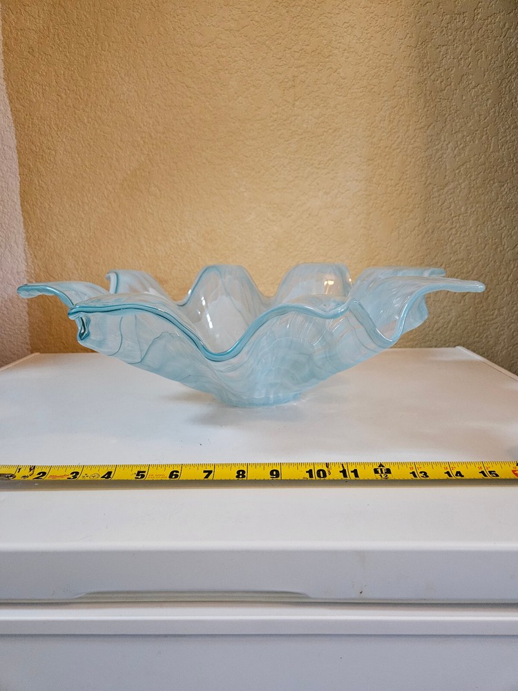 Very large decorative bowl. Studio art glass, cased glass, lotus shaped with several spikes going side way. Various shades of baby blue. Largest dimension across about 19" Height 6-6 1/2" Weight 7.9 Lbs The bowl is in excellent unused condition,without any damage. No chip or crack. No scratch, no flea bite that I could see or feel. Please, look at the pictures for detail not mentioned in the description and condition as well. If you have any question, please, do not hesitate to contact me before purchase. Cost of shipping with insurance for lower 48 states. If shipping cost gets lower difference will be refunded POLICY Please, take few minutes to read our policy. We ship USPS or Fedex with insurance and/or full coverage to confirmed address ONLY and within 1 business day of cleared payment from e-bay. All items are packed very safely with lots of bubble wrap to insure safe delivery. We usually do not accept returns, but if an item is grossly misrepresented in the description or there is a problem with your order, please, contact us as soon as possible and we'll work with you. If a buyer still wish to return an item bought from us, the buyer must contact us in the 3 days following the confirmed delivery and is responsible of return shipping cost. Refund will be made only if the item is received in the same condition it was shipped. For items sold "free shipping", refund minus original shipping cost will be made. We sell used and vintage items. We are no expert, but we try our best to describe and picture the condition of all items. Dimensions are approximate and true color may vary from one device to another. Please, ask all and any question you may think of before purchase. We usually respond the same day. When you'll receive your order, if there's any problem, please, contact us before leaving negative feedback. We'll work with you. Our main goal is your satisfaction. Thank you for looking. CLO