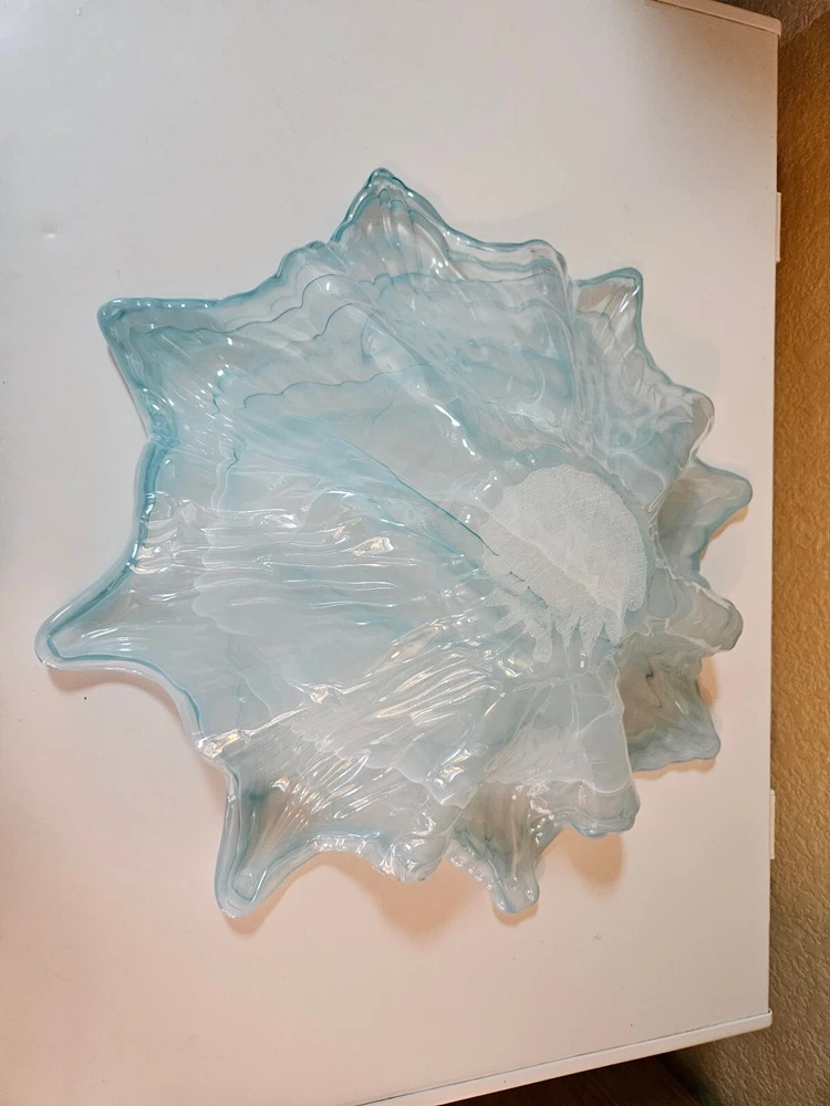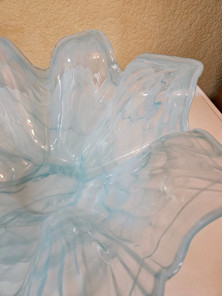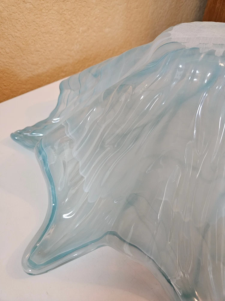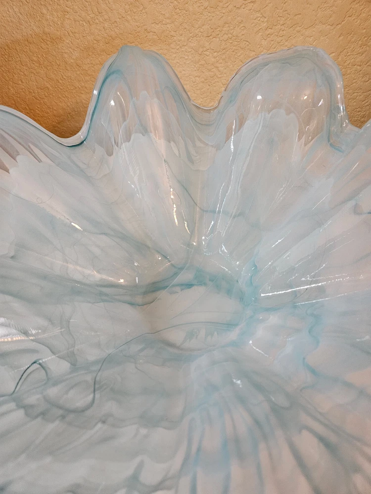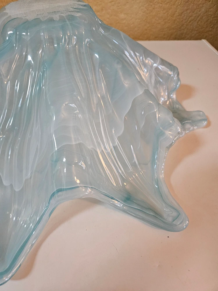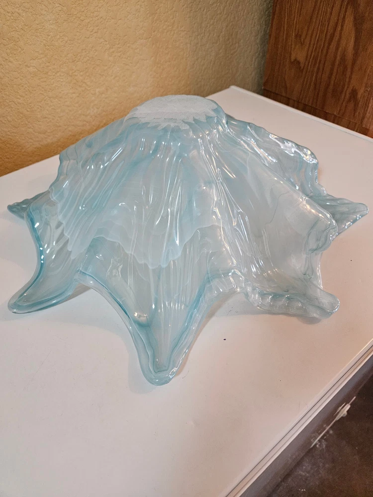Very large decorative bowl. Studio art glass, cased glass, lotus shaped with several spikes going side way. Various shades of baby blue. Largest dimension across about 19" Height 6-6 1/2" Weight 7.9 Lbs The bowl is in excellent unused condition,without any damage. No chip or crack. No scratch, no flea bite that I could see or feel. Please, look at the pictures for detail not mentioned in the description and condition as well. If you have any question, please, do not hesitate to contact me before purchase. Cost of shipping with insurance for lower 48 states. If shipping cost gets lower difference will be refunded POLICY Please, take few minutes to read our policy. We ship USPS or Fedex with insurance and/or full coverage to confirmed address ONLY and within 1 business day of cleared payment from e-bay. All items are packed very safely with lots of bubble wrap to insure safe delivery. We usually do not accept returns, but if an item is grossly misrepresented in the description or there is a problem with your order, please, contact us as soon as possible and we'll work with you. If a buyer still wish to return an item bought from us, the buyer must contact us in the 3 days following the confirmed delivery and is responsible of return shipping cost. Refund will be made only if the item is received in the same condition it was shipped. For items sold "free shipping", refund minus original shipping cost will be made. We sell used and vintage items. We are no expert, but we try our best to describe and picture the condition of all items. Dimensions are approximate and true color may vary from one device to another. Please, ask all and any question you may think of before purchase. We usually respond the same day. When you'll receive your order, if there's any problem, please, contact us before leaving negative feedback. We'll work with you. Our main goal is your satisfaction. Thank you for looking. CLO