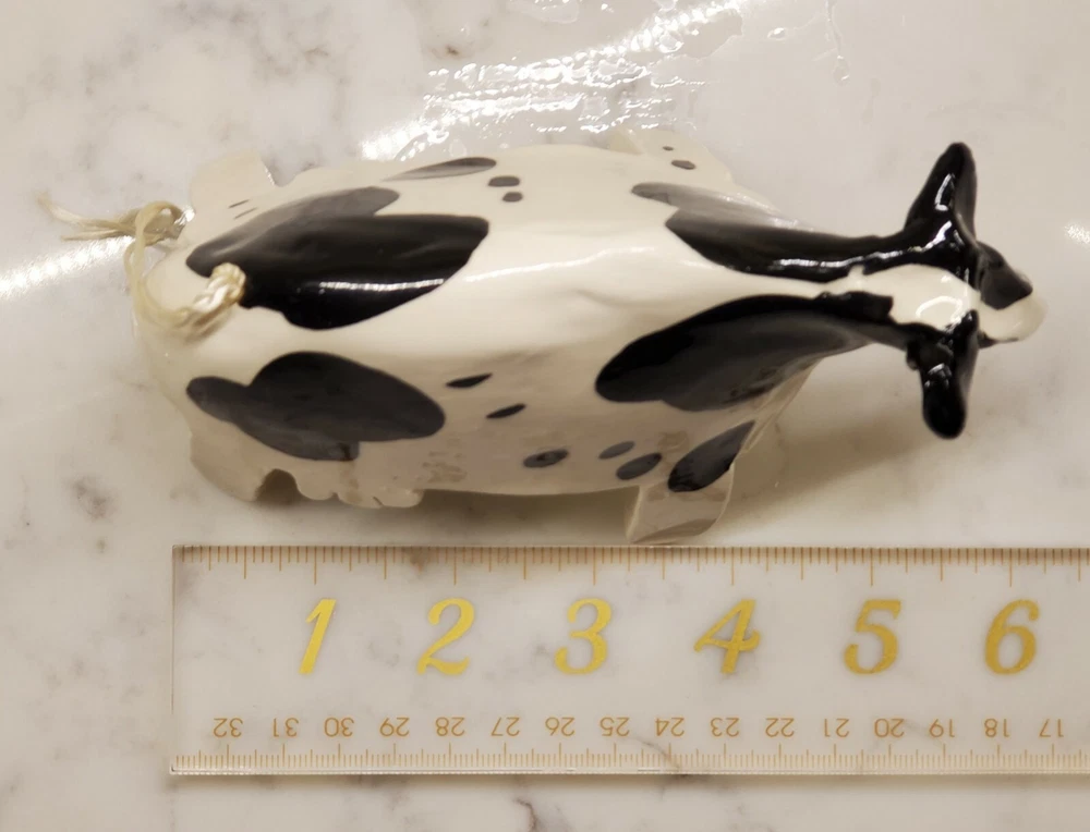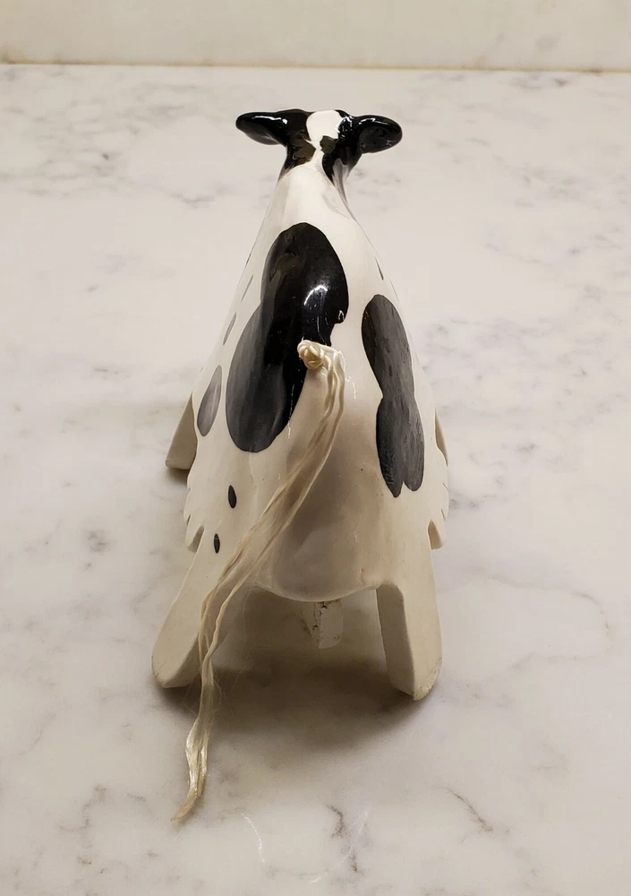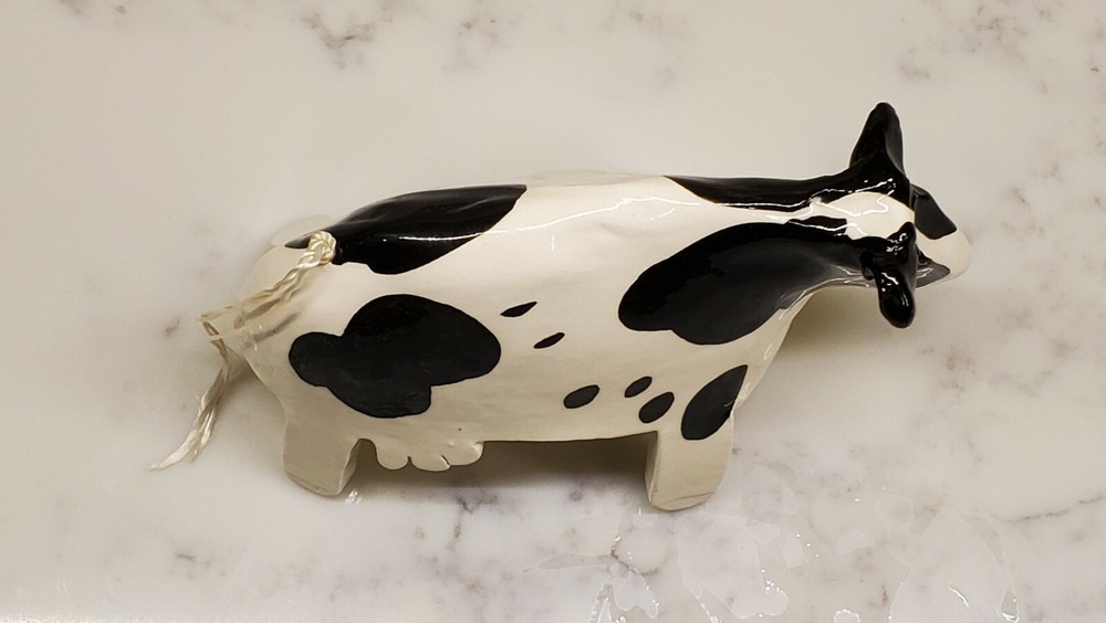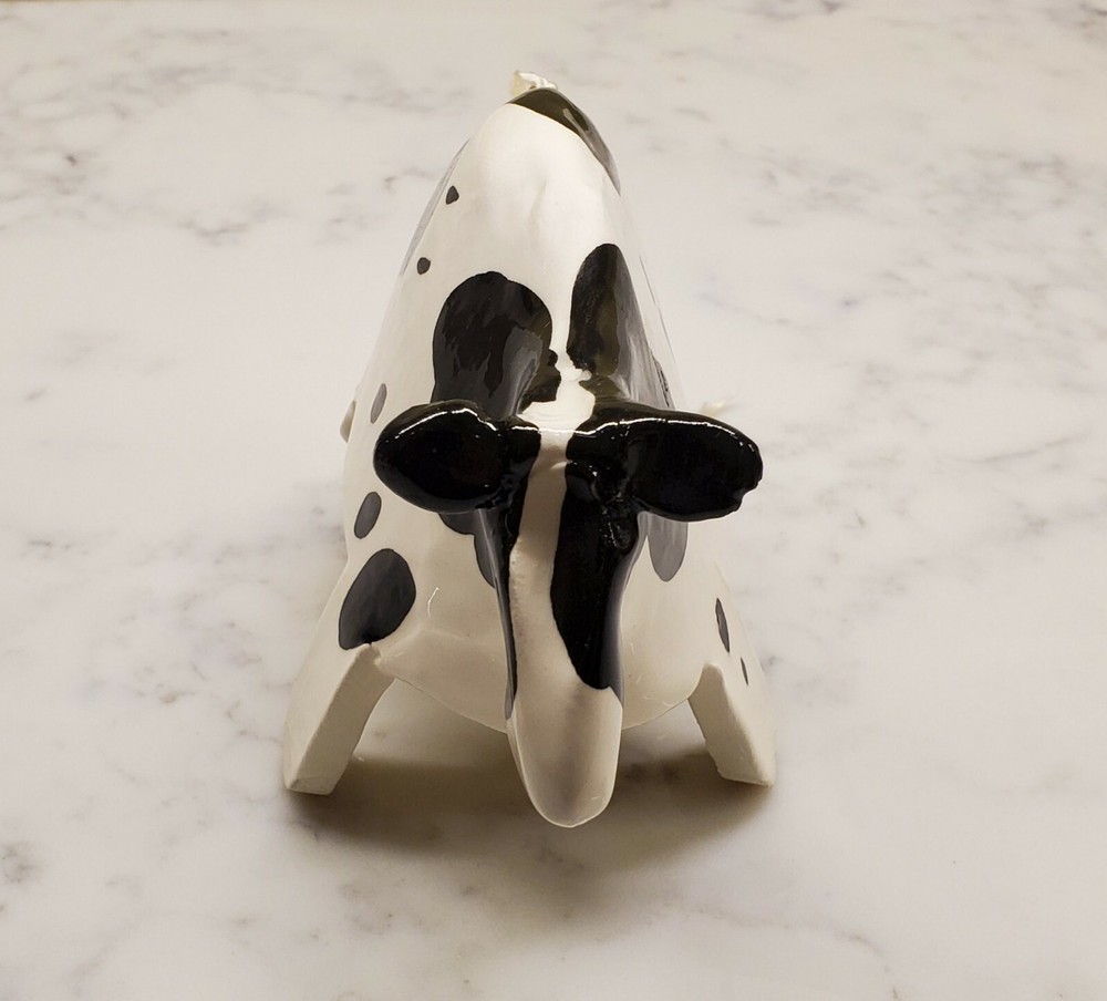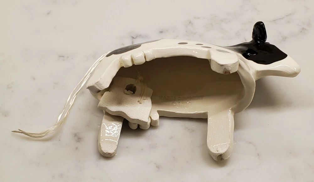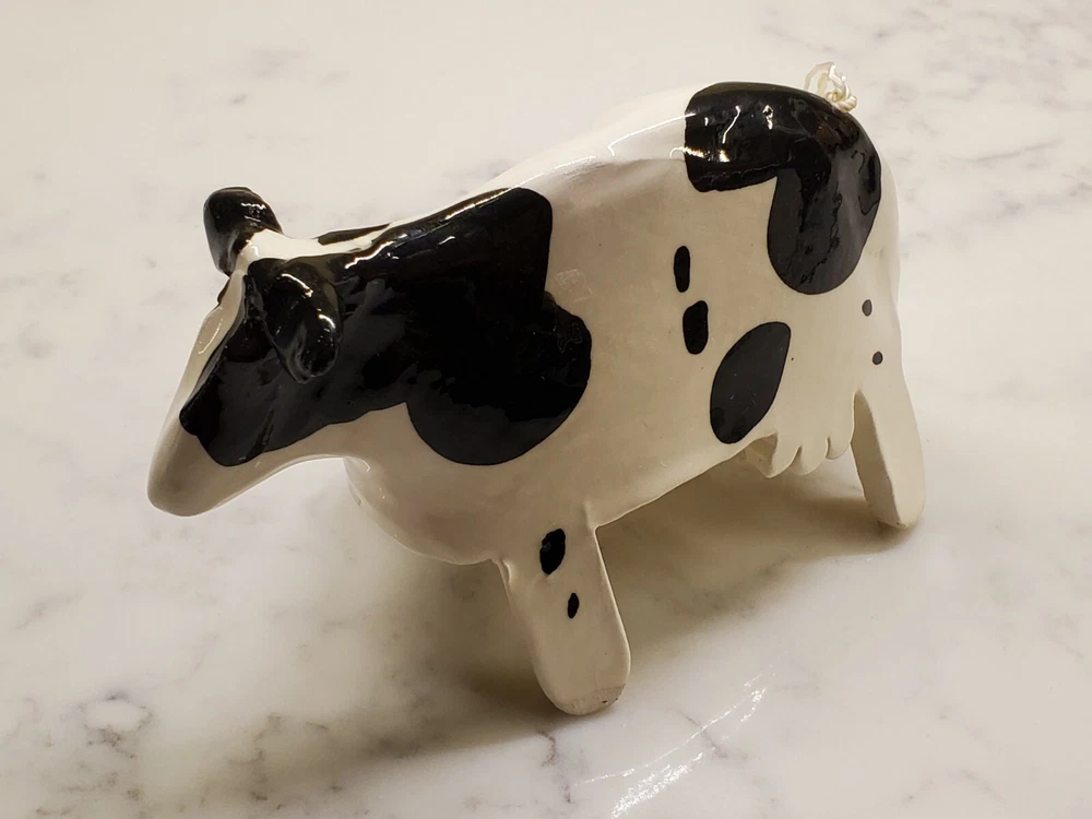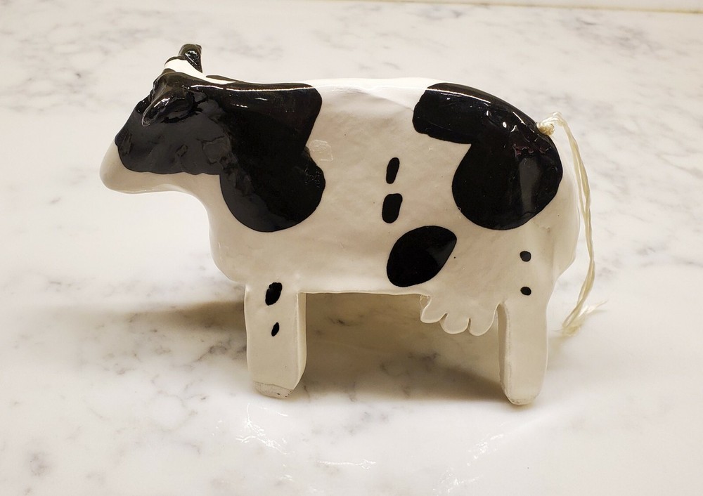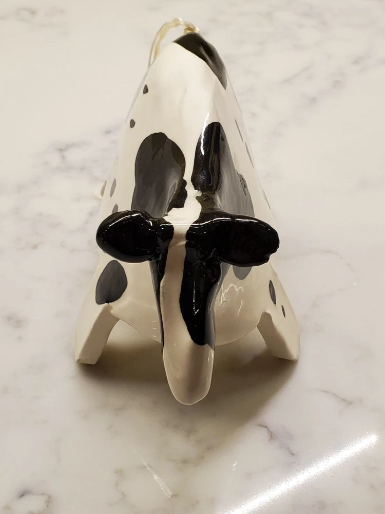 Studio Ceramic "Cow" Bell Handcrafted Cow Shaped Bell Stamp Signed Karen Reichert 1985 One Of A Kind Sweet "COW" Bell. Handmade Ceramic Cow Shaped Bell. Handpainted Cow with pull string Tail attached to a ceramic clapper. Like New Pre-owned Condition. Approximately 6" Tall 3" Wide