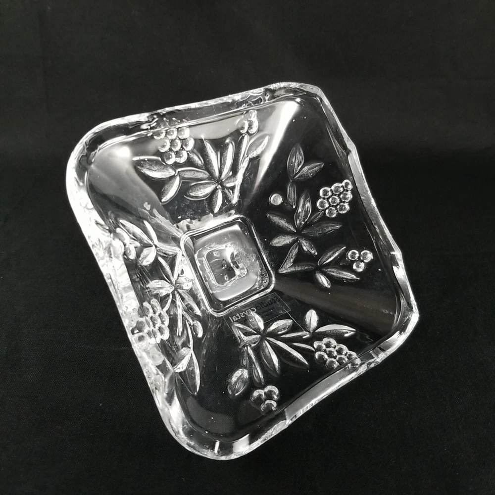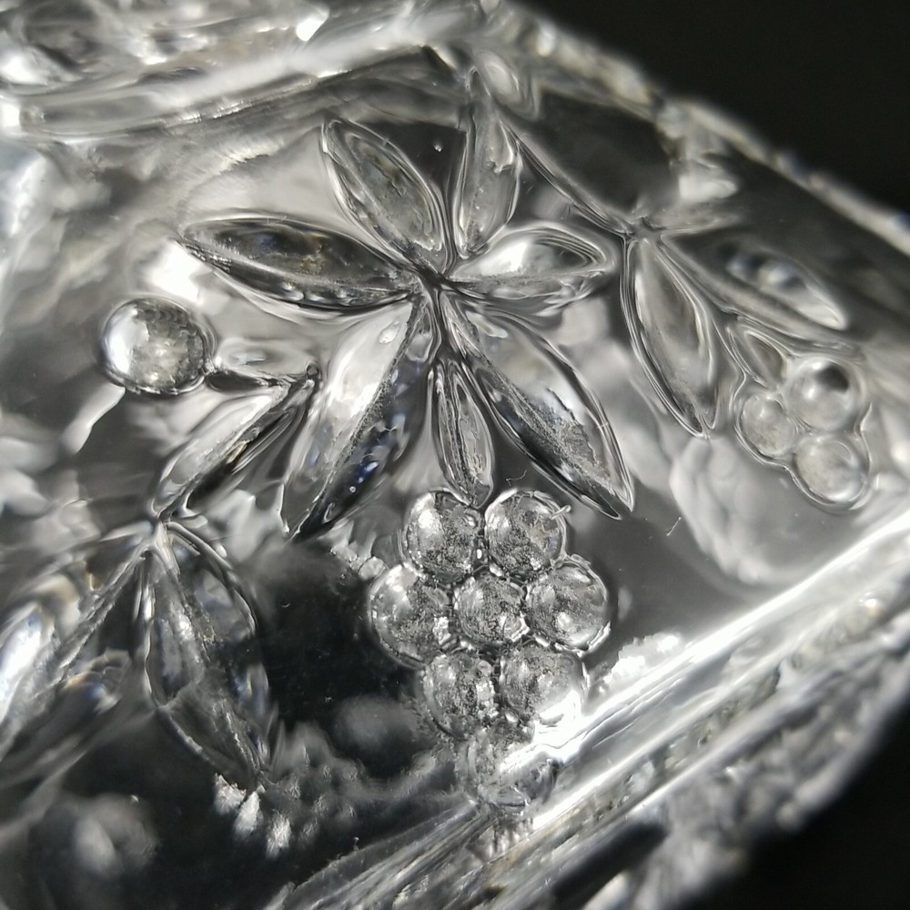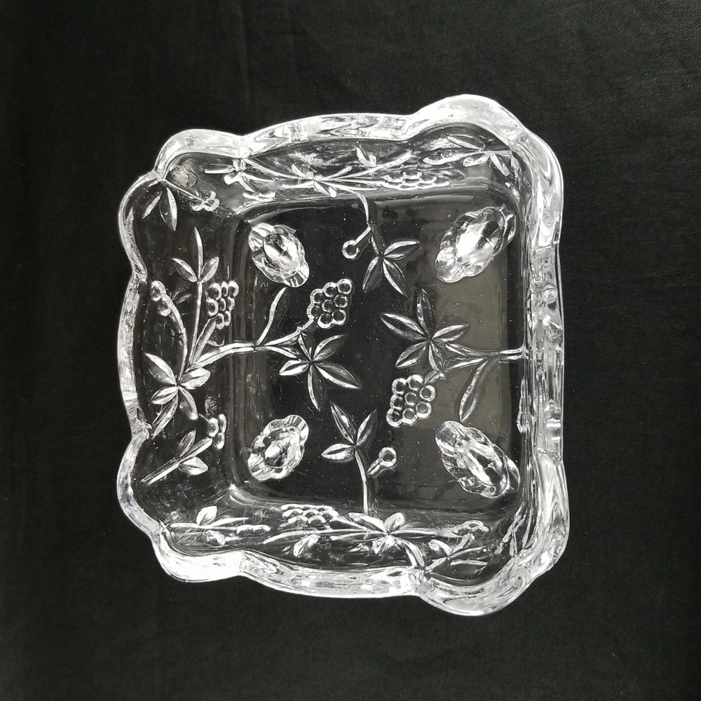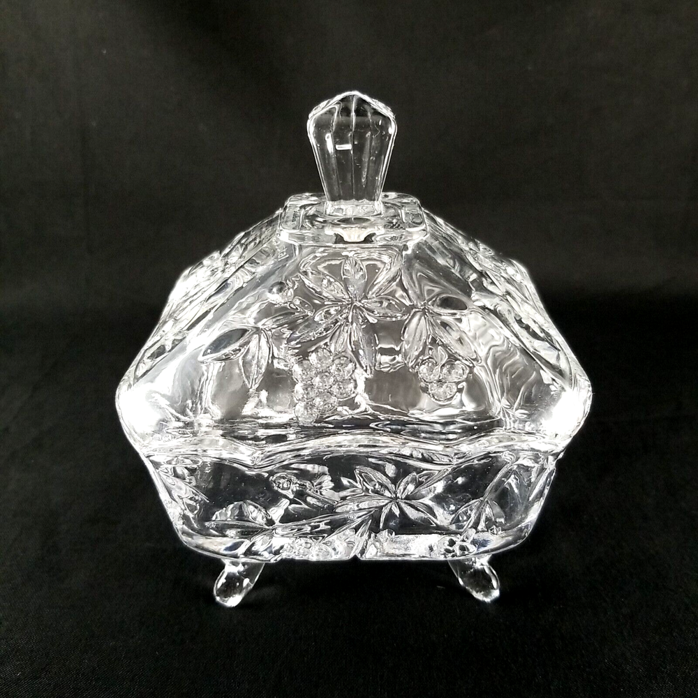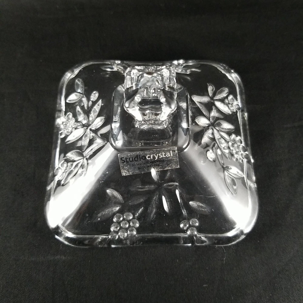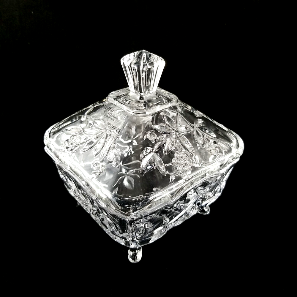 Studio Crystal Clear Pressed Glass Footed Candy Dish & Lid Grape Vine Design measure w/lid on approx. 5" tall and 4" sq. See Photos as they are part of description. Very Good Condition! Don't forget to leave positive feedback . Thanks Please Note: You must pay through Paypal within 3 days. Happy to combine shipping on multiple purchases. Sorry, no combined shipping on international purchases. *********** We have 3 day handling reason lot of order, need 3 days to keep up If needed soon pls email me or live note to seller so that we can accommodate *****Return Policy***** If you are not happy with your purchase for any reason, ship item back within 30 days of receiving item for an exchange or refund. Item must be received in same condition as sold . It is Very poor etiquette to leave a bad or nasty feedback without contacting me first, to give me a chance to resolve the issue. Thank you for being a considerate buyer Good Luck and Happy Bidding! Please check out my other auctions! Thank you