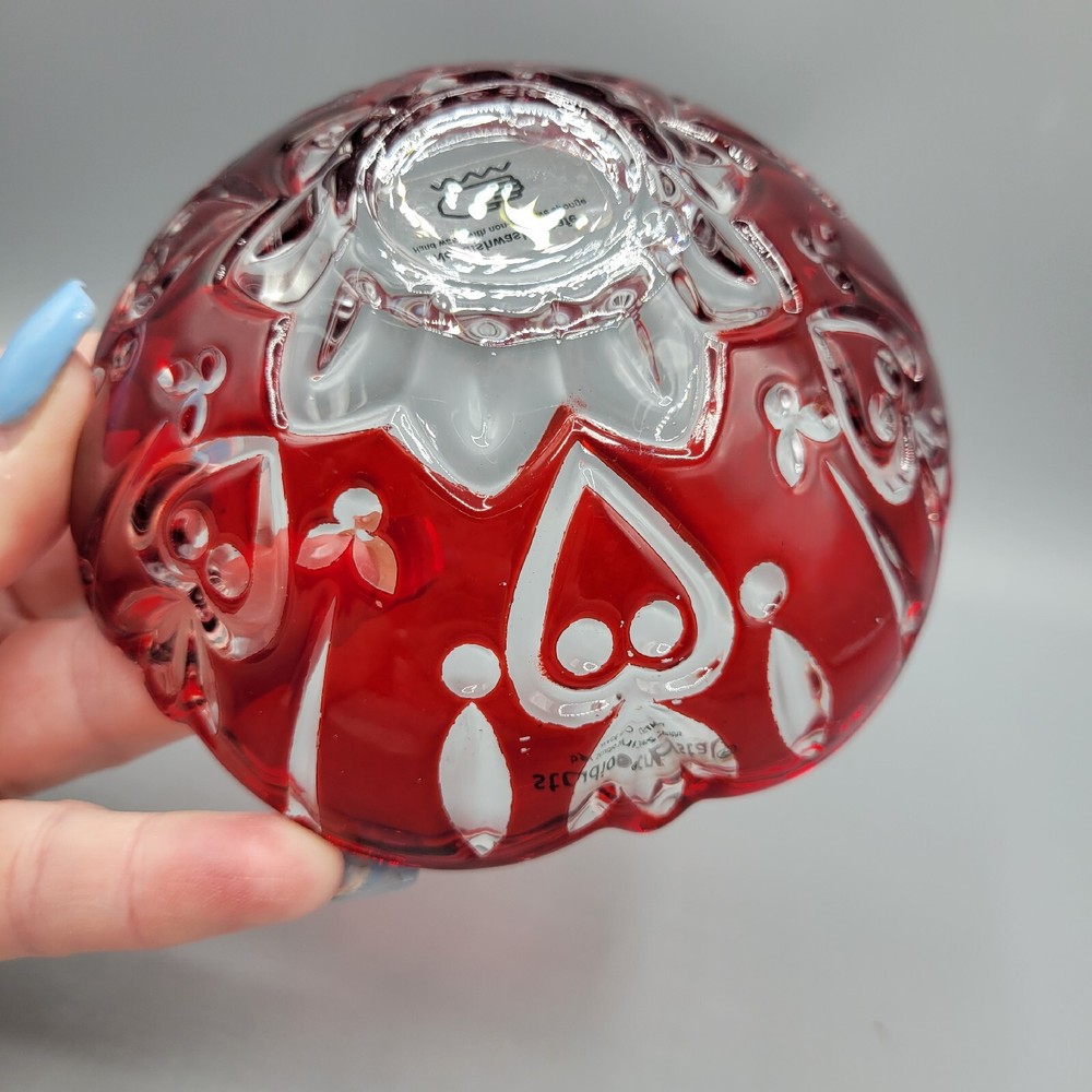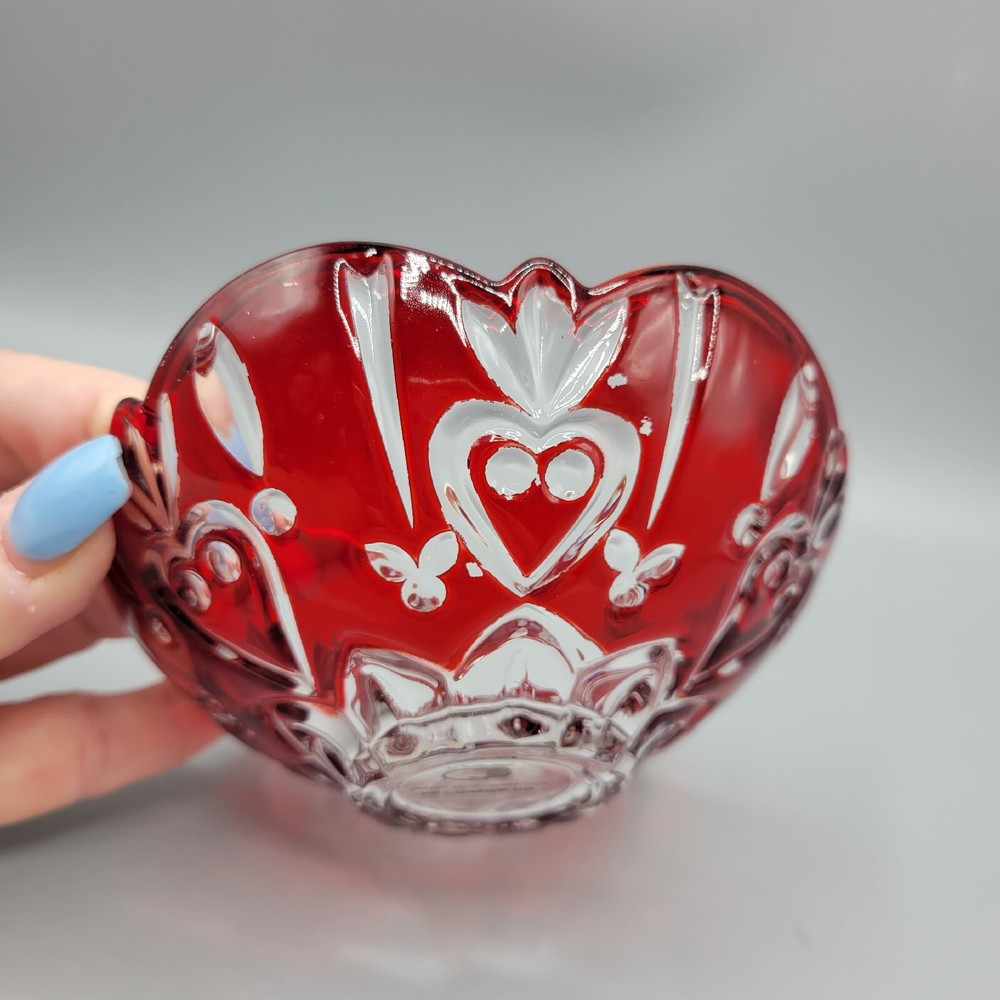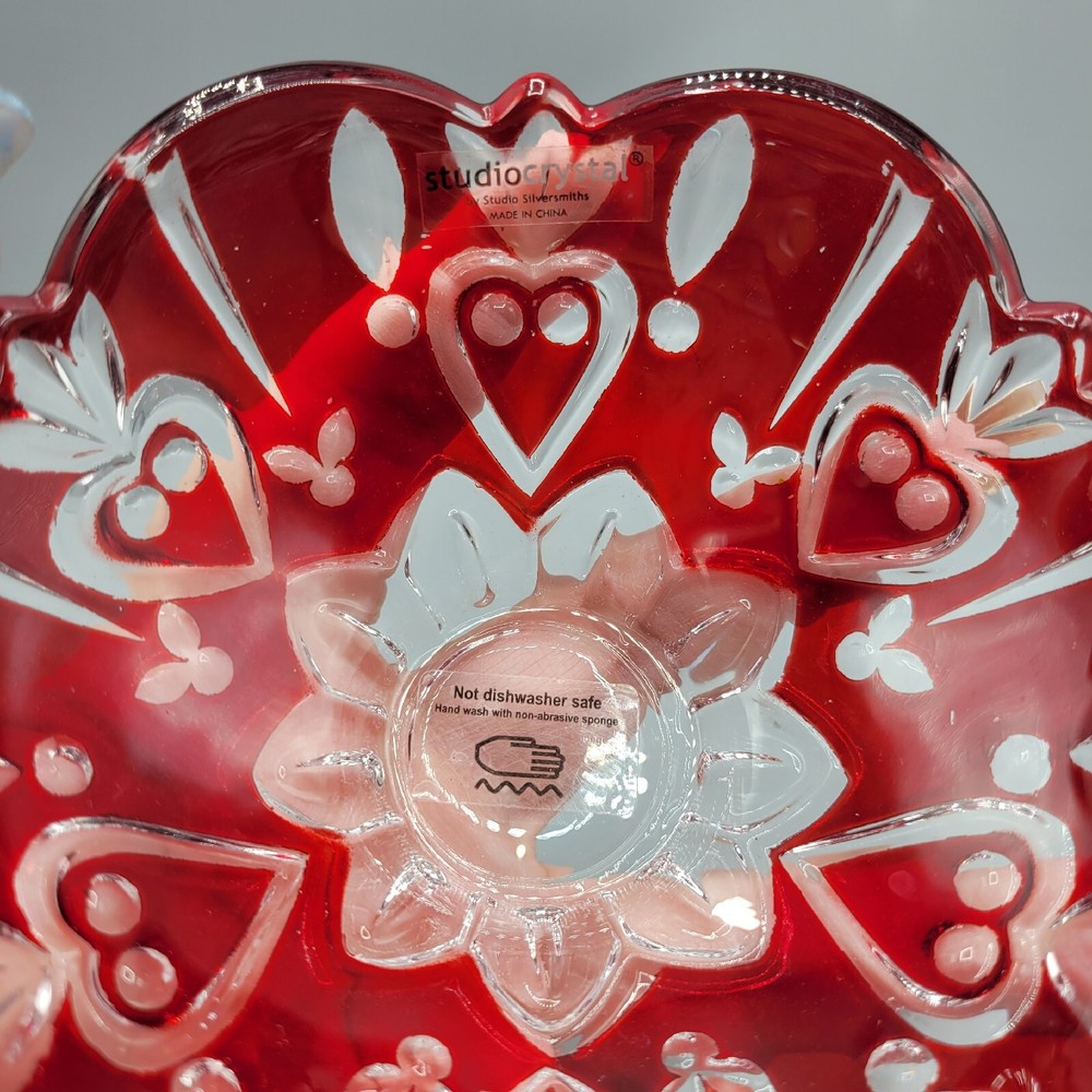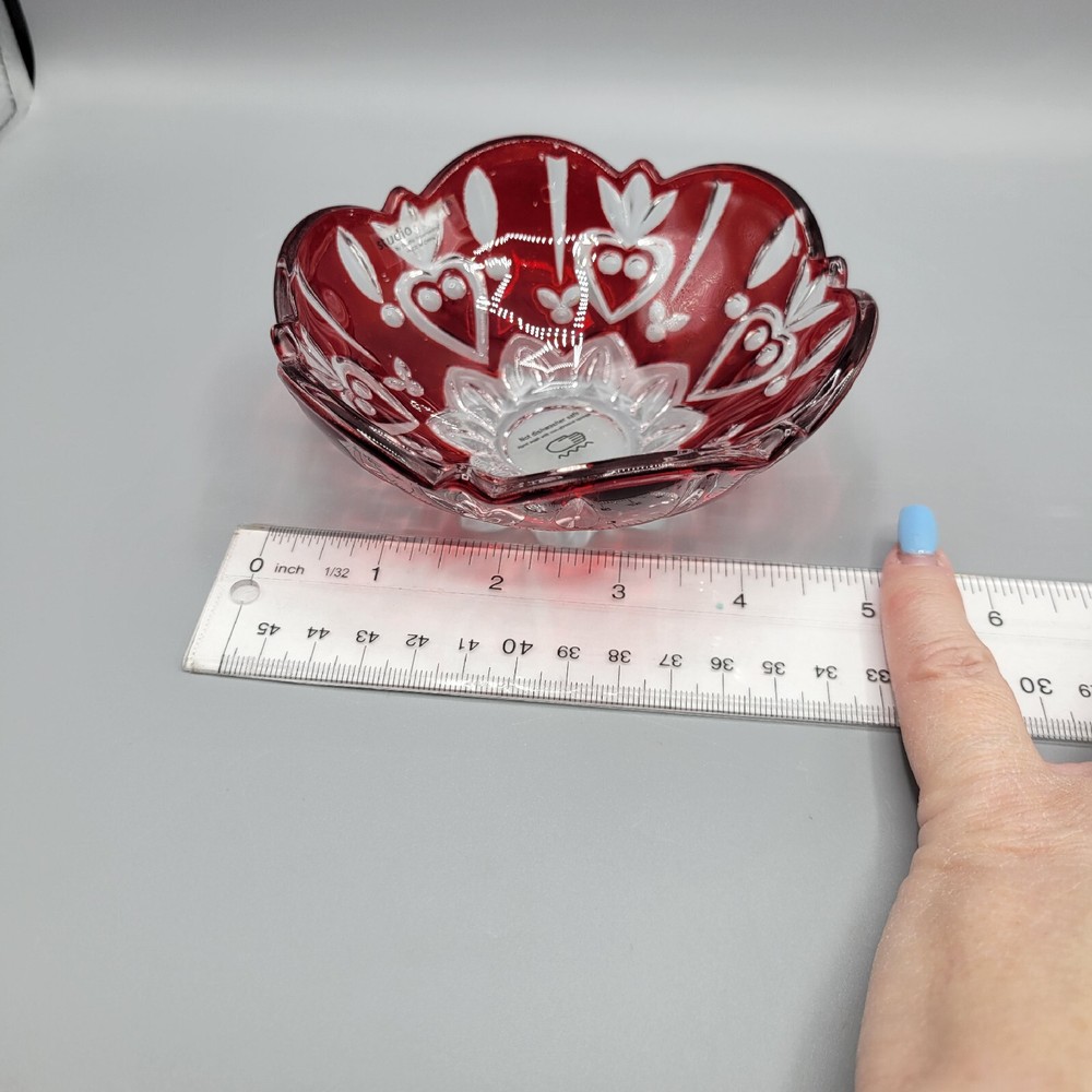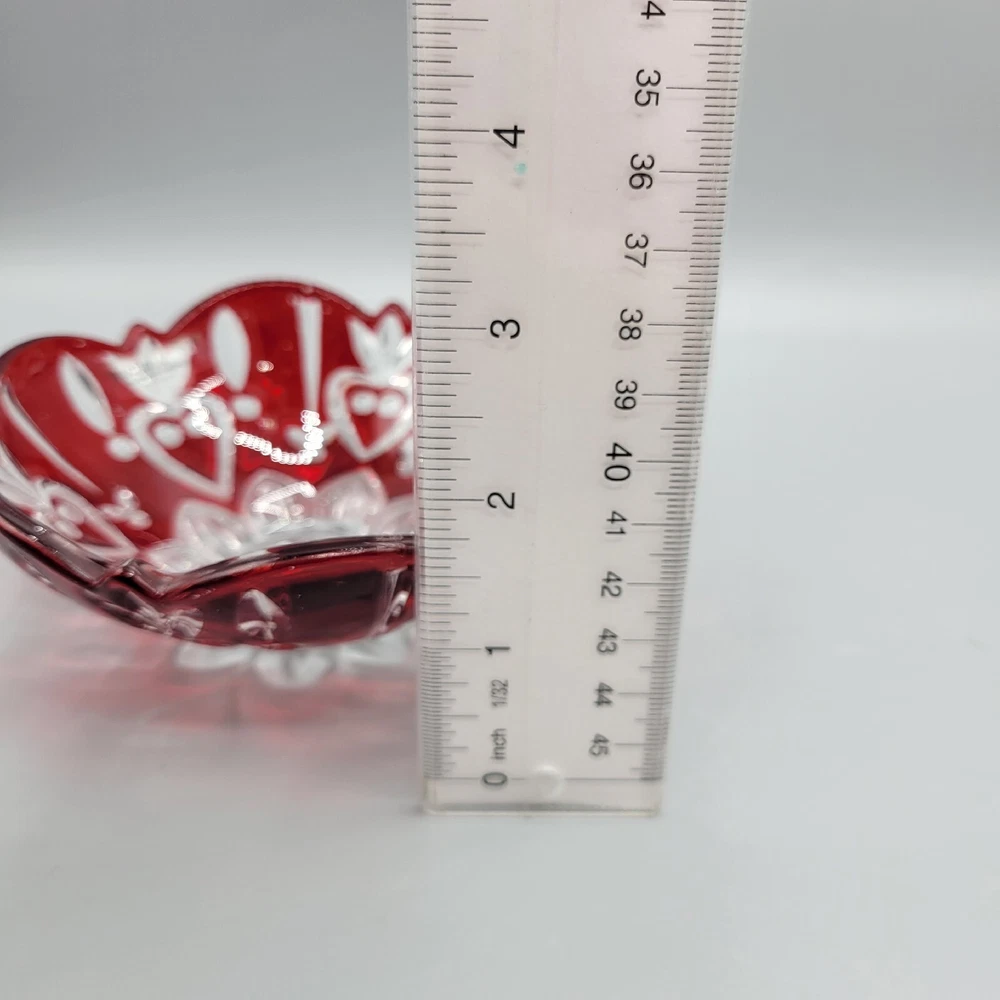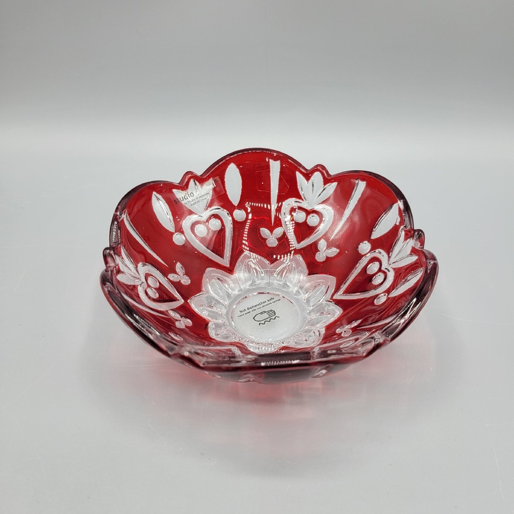 Studio Crystal Red Flash Glass Bowl With Hearts, Candy Dish. Measures 5"x1.75", red is flash painted on and in very good condition, gently hand wash and enjoy your piece, great as a candy or nut dish/...