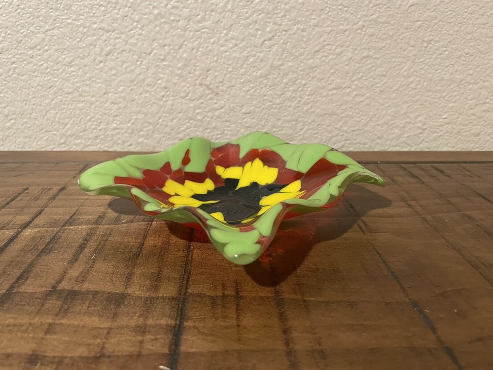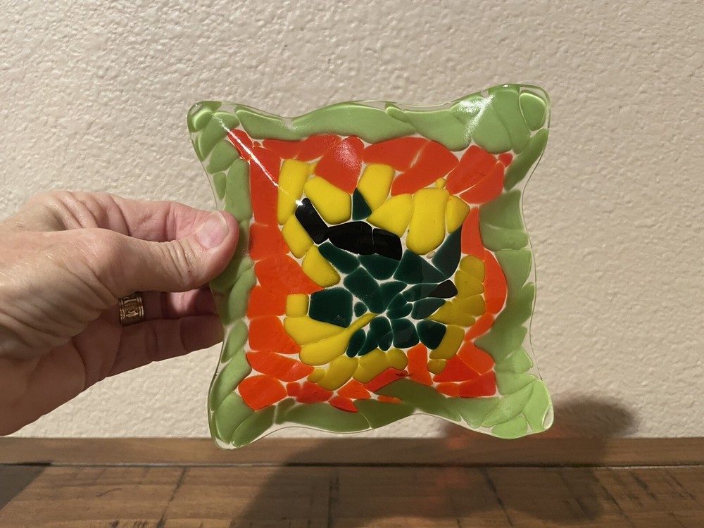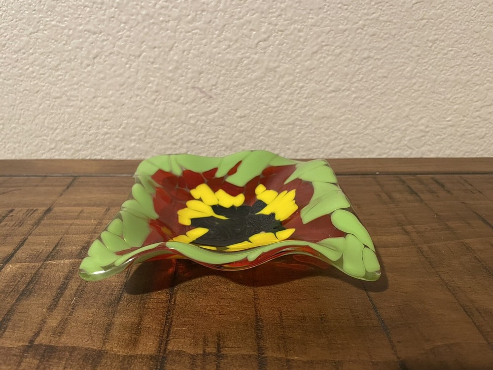 For sale is a handcrafted studio fused glass trinket dish. It is 5” x 5” square and has a ruffled edge. The color combination is striking. The artist used lime green, orange, yellow, deep emerald green and black, and it is cased in clear. This is a stunning piece and it is in excellent condition with no chips, cracks or scratches.
