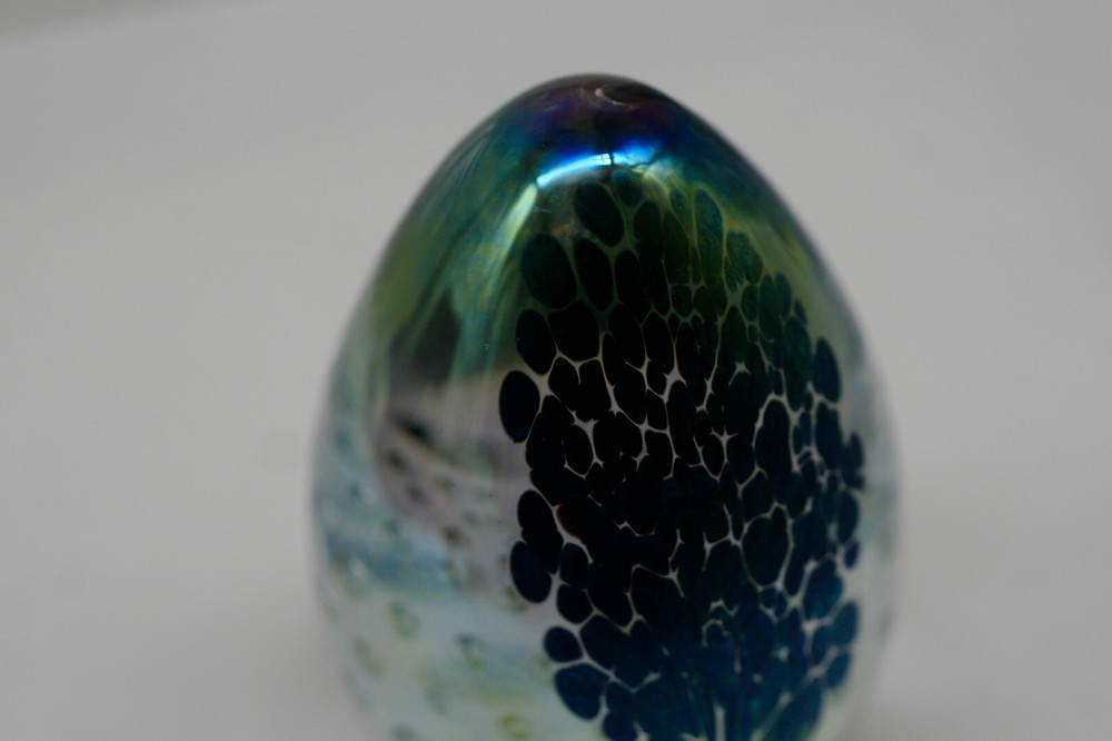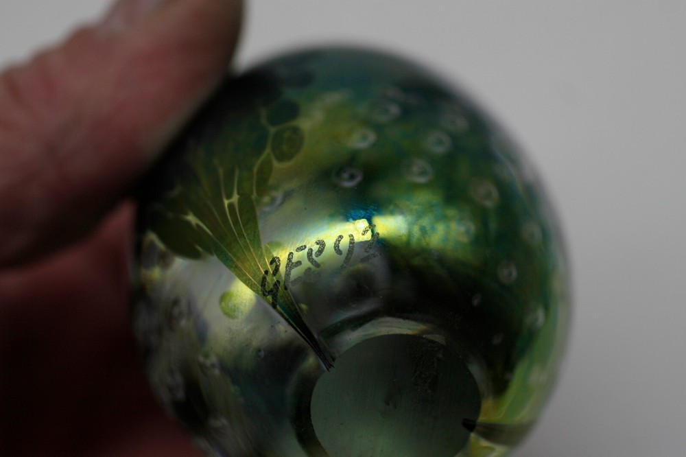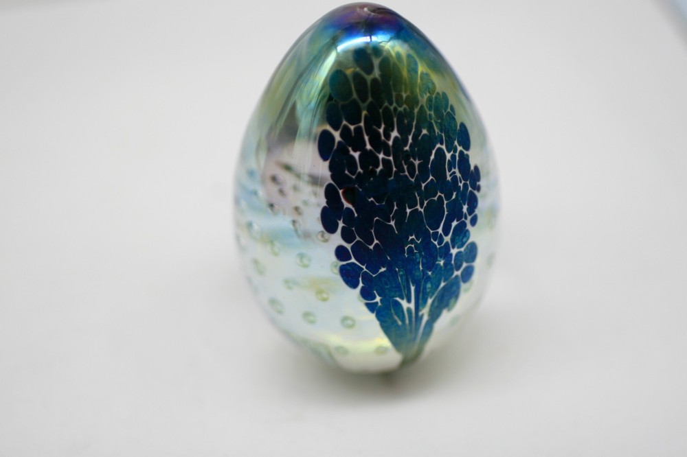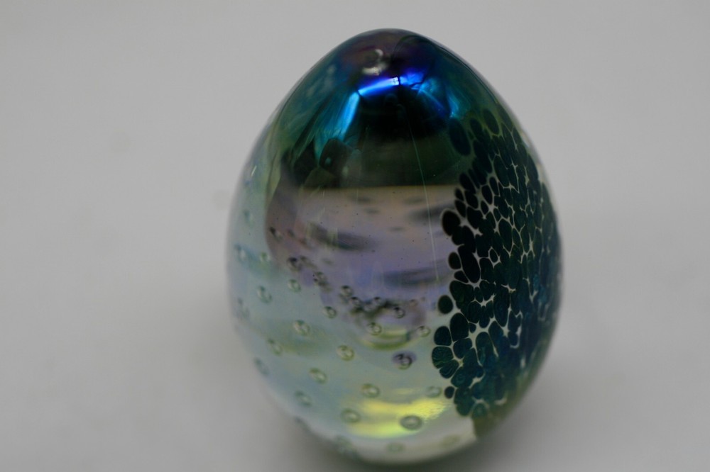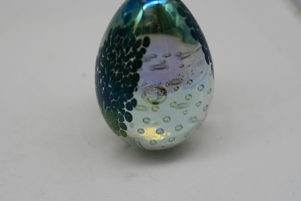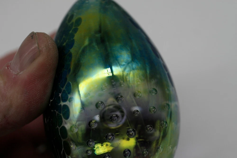 Has a nice iridescent look with interior bubbles. 3 1/4" tall...