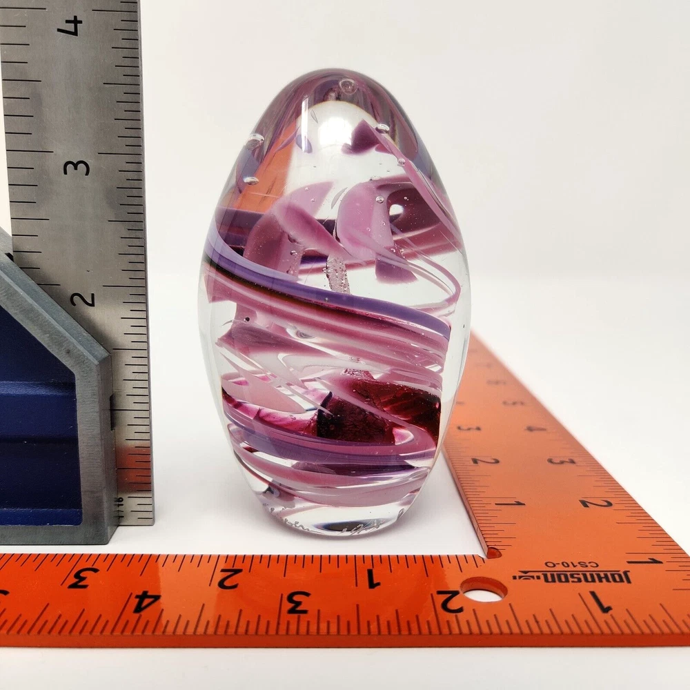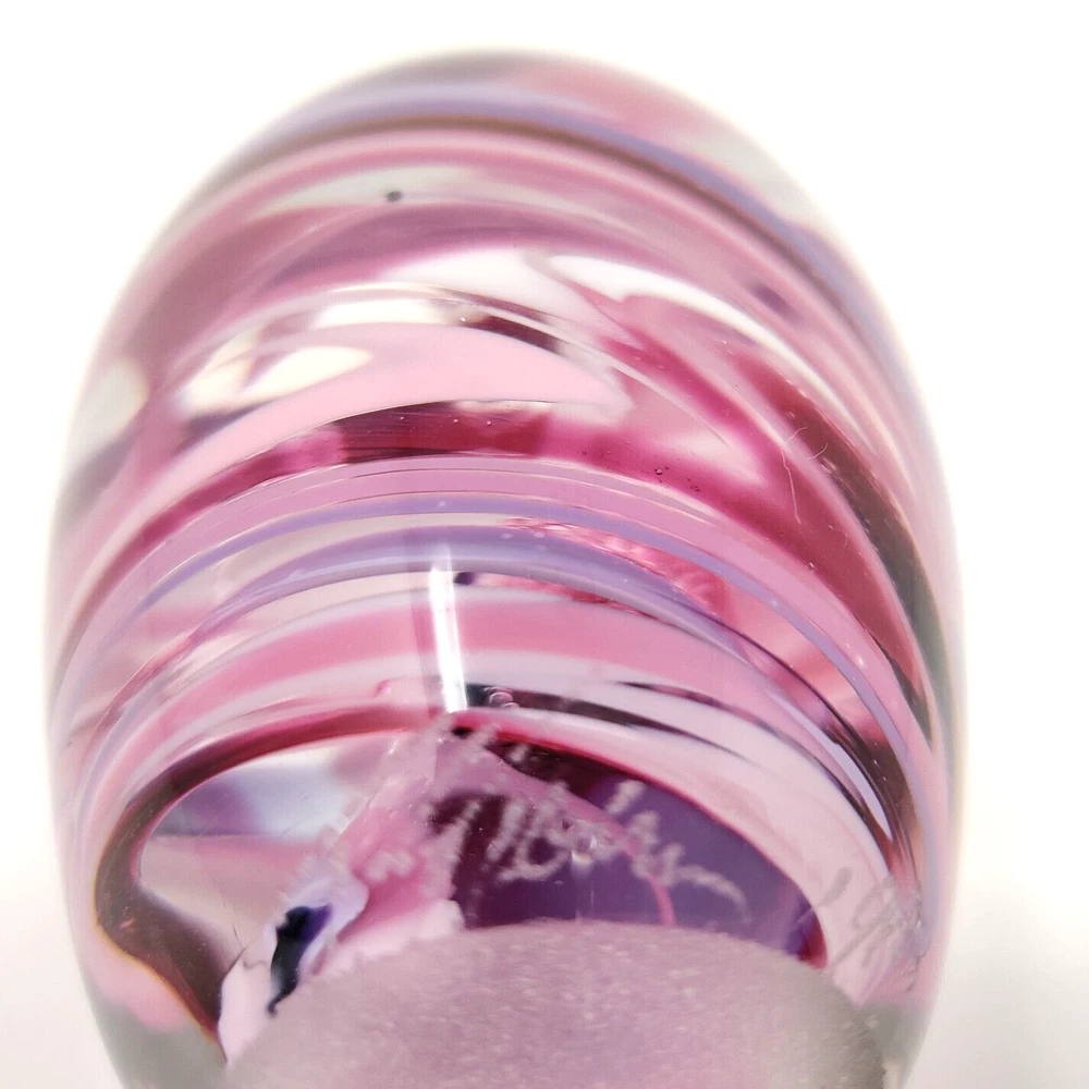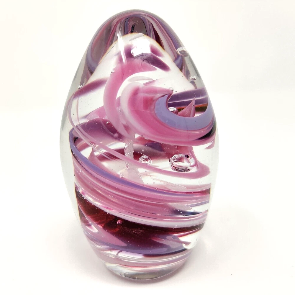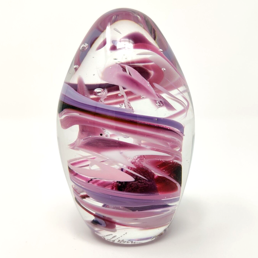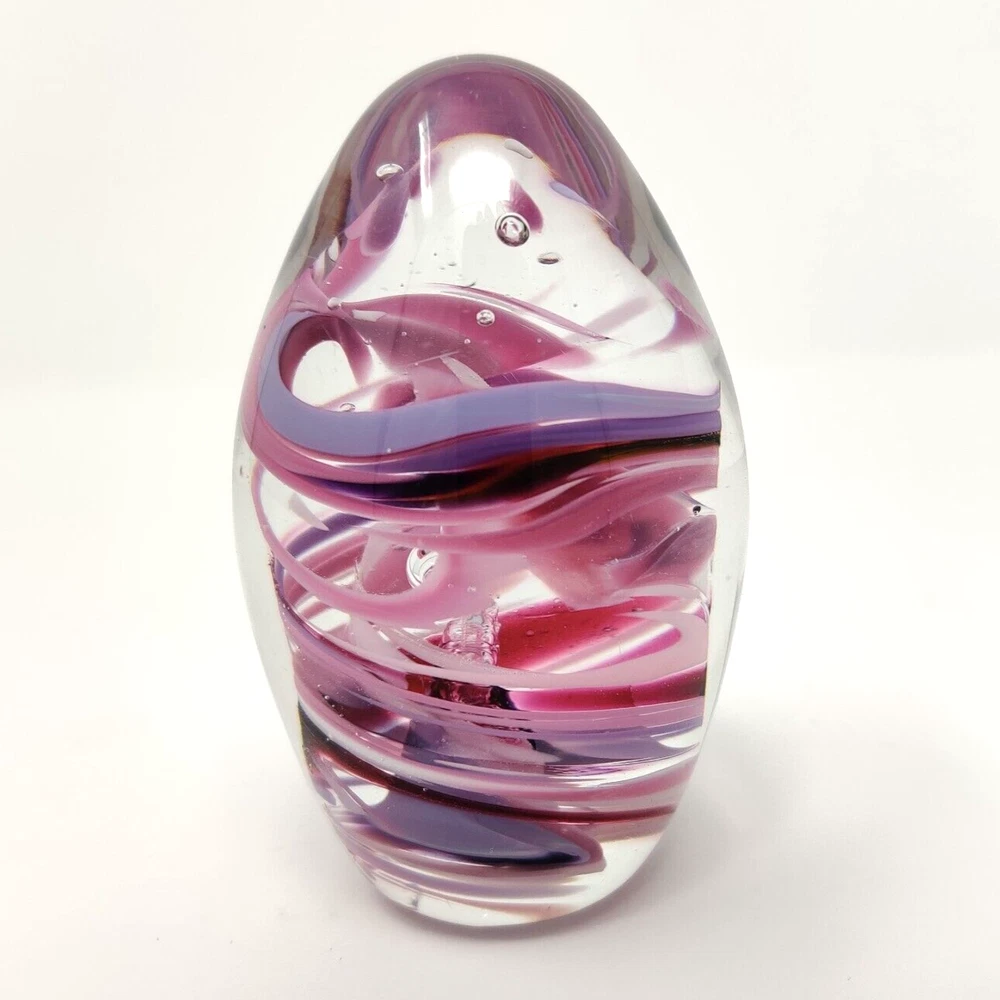 Studio Glass Art Glass Egg Shaped Paperweight Signed Dated 1998 Rose Pink Purple Paperweight is in excellent pre-owned condition with no chips or cracks. Please review photos carefully for details/condition, and feel free to send a message if you have any questions or want to see something closer or from another angle. Thank you for looking.
