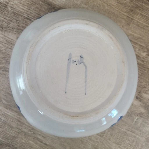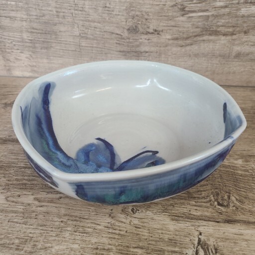 Studio Hand Made Artisan Signed Pottery Rounded Square Bowl Blue Butterfly Glaze Some crazing in glaze. Beautiful larger size bowl with rounded edges. Glaze takes the shape of a butterfly. I have two other pieces by this artist in my store (if they haven't sold). Please see all photos for details and measurements.