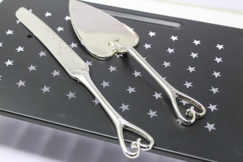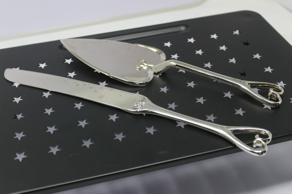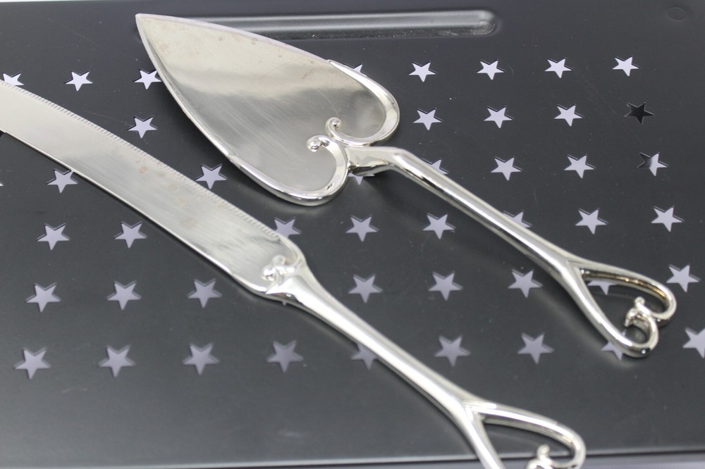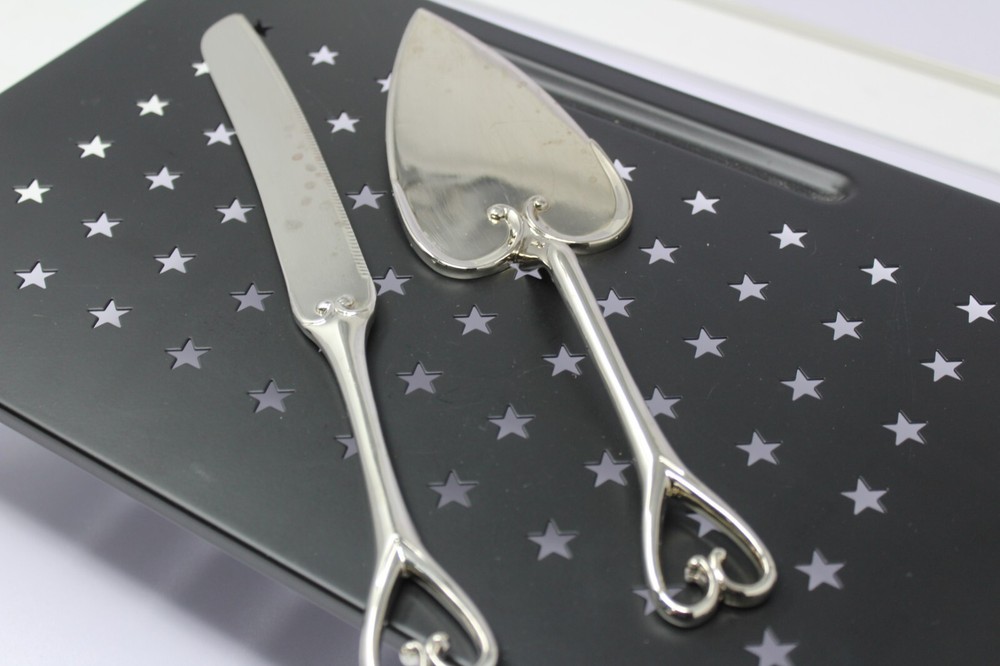 This Studio His & Hers Cake Server & Knife Set is the perfect addition to any wedding cake. The set includes a two-piece set with a knife and server, both made of silver-plated metal with a heart-shaped handle pattern. The knife measures 16 inches in length and weighs 9 ounces, while the server measures 11 1/2 inches in length. The set is perfect for anyone looking to add a touch of elegance to their wedding cake. The silver-plated material and heart-shaped handle pattern make this set a beautiful addition to any wedding. This cake knife and server set is a must-have for any wedding planner or couple looking to make their special day even more memorable. This Item Is In Excellent Condition This Item Has No Scratches