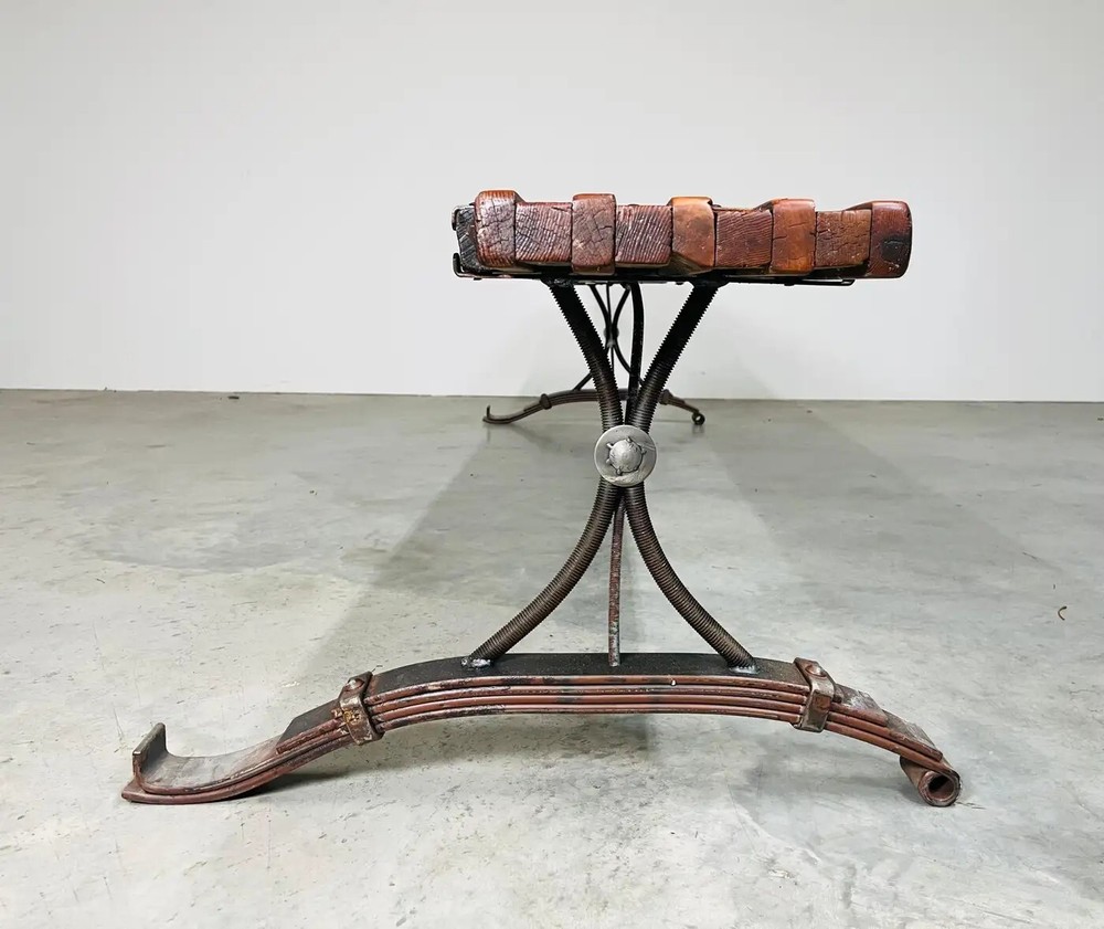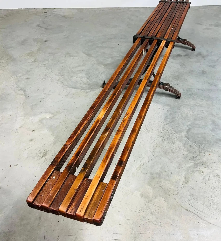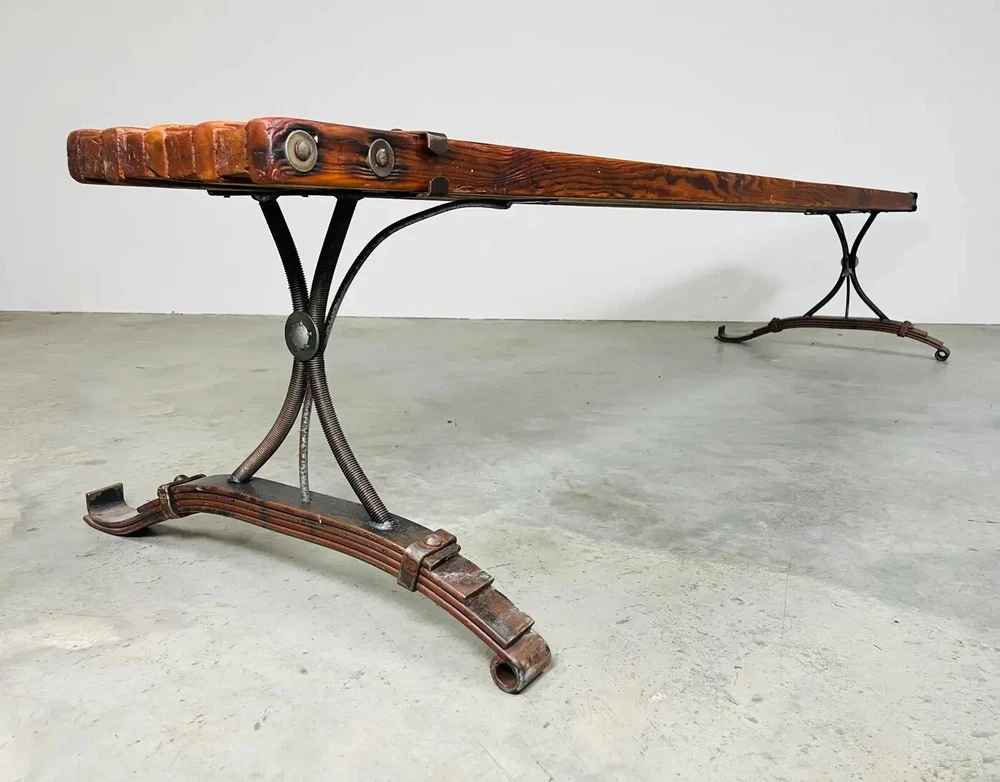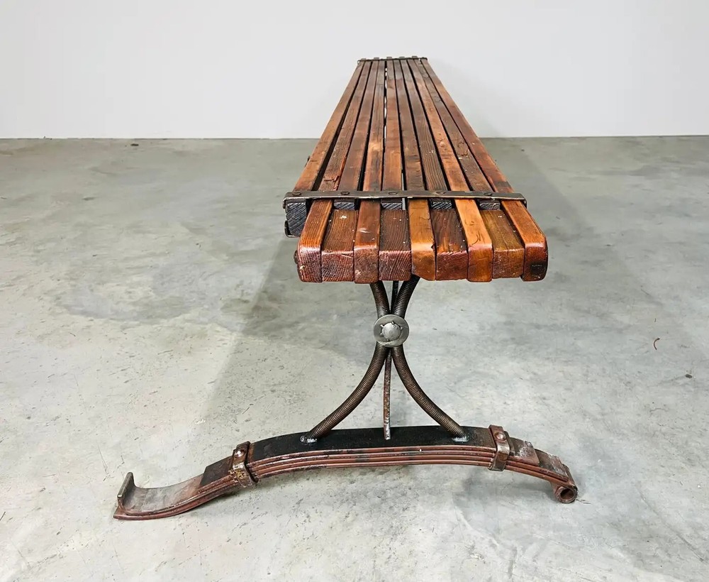 A masterfully designed studio slat bench constructed with an early 20th-century oak painters scaffold platform over steel leaf springs reinforced by welded all thread adding a brutalist texture to the overall design. The top seat expands up to 12’ in length and is incredibly strong and sturdy. In excellent vintage condition having stunning patina throughout. Dimensions: 19.5x100x28” HWD Width while expanded 149” Slat seat depth is 12”