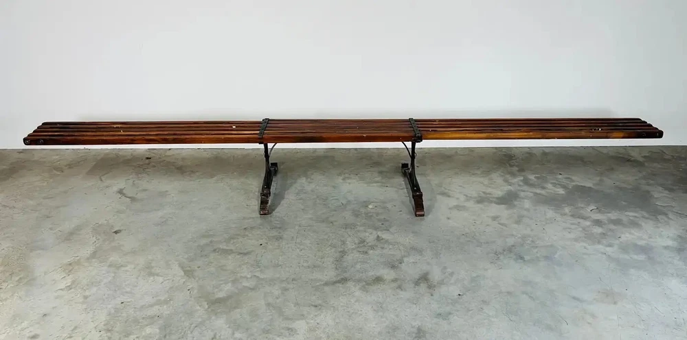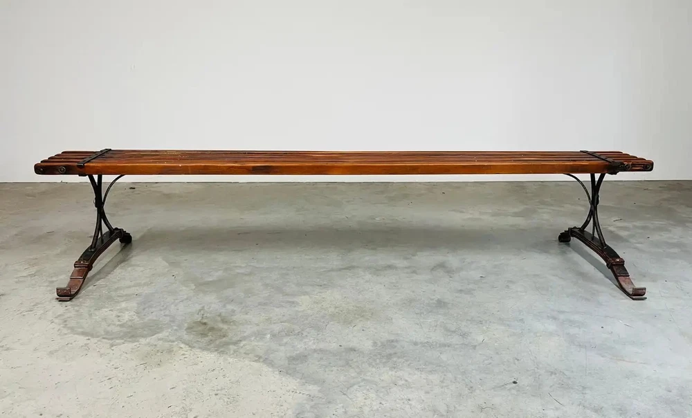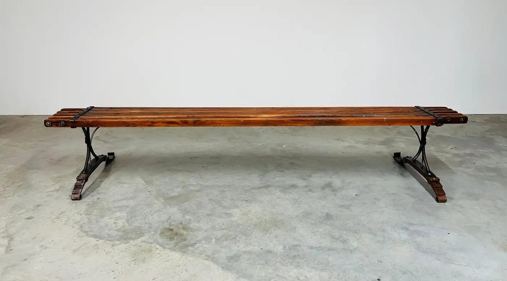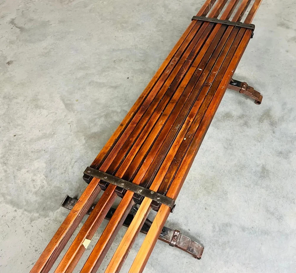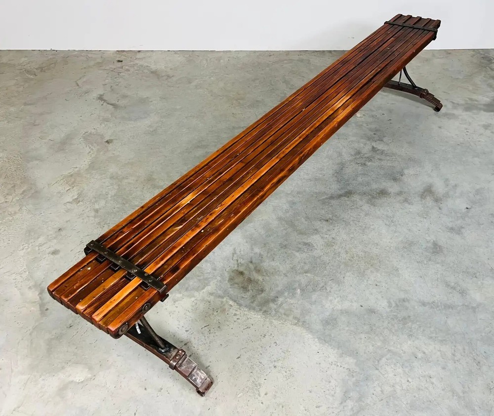 A masterfully designed studio slat bench constructed with an early 20th-century oak painters scaffold platform over steel leaf springs reinforced by welded all thread adding a brutalist texture to the overall design. The top seat expands up to 12’ in length and is incredibly strong and sturdy. In excellent vintage condition having stunning patina throughout. Dimensions: 19.5x100x28” HWD Width while expanded 149” Slat seat depth is 12”