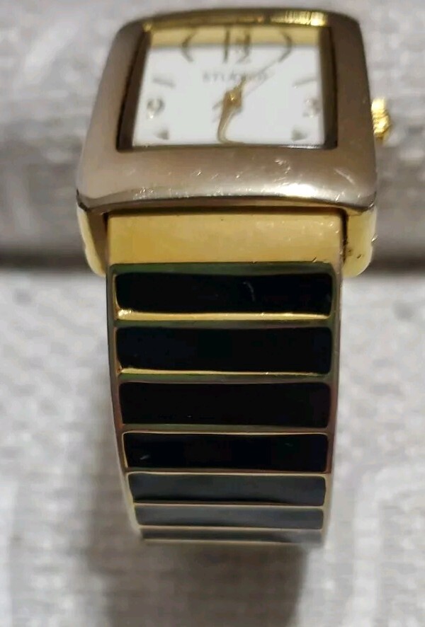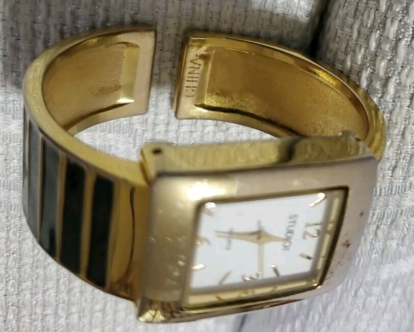 Stunning Studio ladies cuff watch featuring a sleek black and gold design. The square face and goldtone bezel add a touch of elegance to any outfit. Perfect for women who appreciate fashion and functionality, this wristwatch is an essential addition to your jewelry collection. The black and gold color scheme effortlessly complements any wardrobe, making it a versatile accessory for everyday wear and special occasions. Whether you're dressing up or keeping it casual, this Studio cuff watch is sure to make a statement.