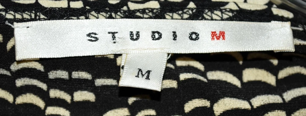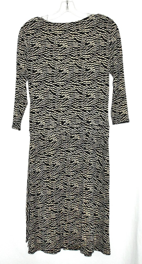 This listing is for a Studio M black and white V-neck, with spandex dress that is in a size medium.* There is a crisscross overlapping front, with an elastic waistband and a tie belt. The dress simply slips over a person's head, without any closure. The dress is in great preowned condition. Please check out my pictures for details and condition. This dress comes from a smoke free and pet free home. I will combine shipping, with all my other items in my store. Please view my store for additional items. *Manufacturer's clothing sizes vary in size, so please check the measurements listed below to insure that it would fit you. Measurements: Chest / Bust: 38" Shoulder to Shoulder: 16" Waist: 32" Stretches to 36" Hips: 44" Collar: None Sleeve: 18" Three Quarter Length Top to Bottom: 44" Material: Polyester Shipping Cost: Use Shipping Calculator.