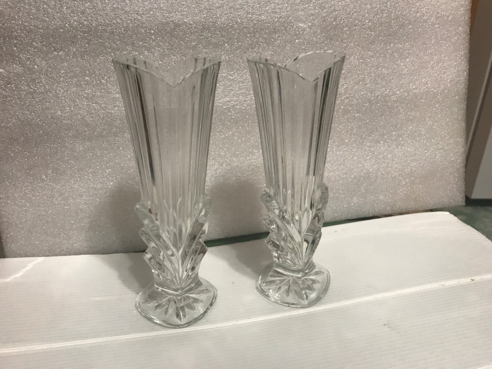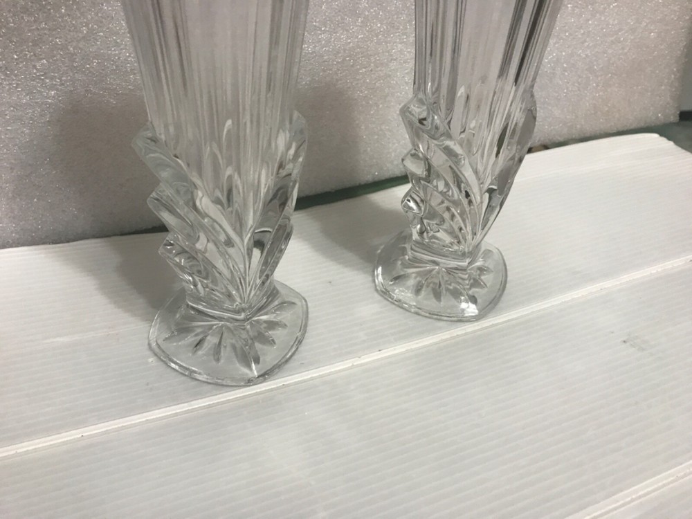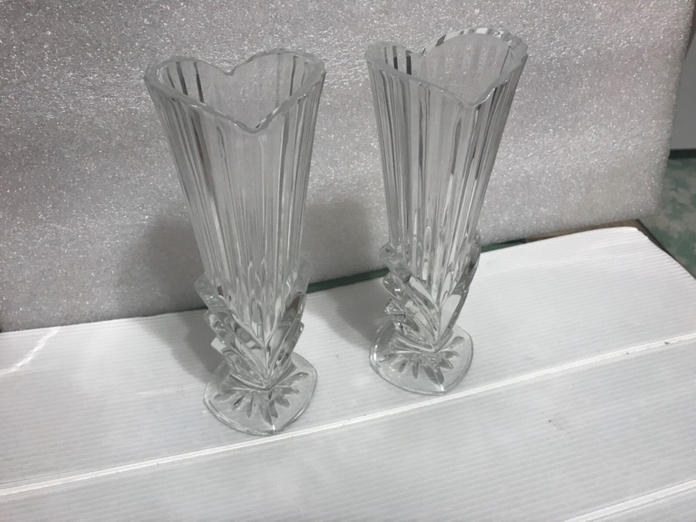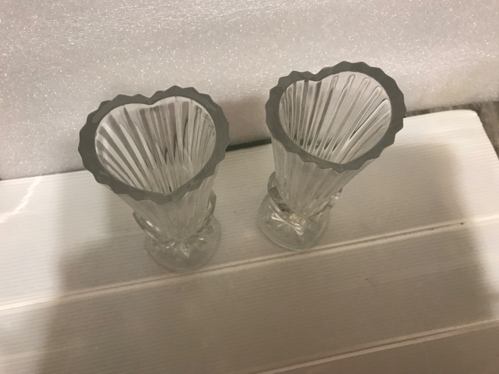 Pretty matching pair of Bud vases or small bouquets clear, heart shaped top, ribbed, Art Deco Studio Nova, I.25 inch tall, no chips...