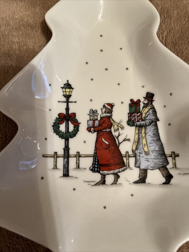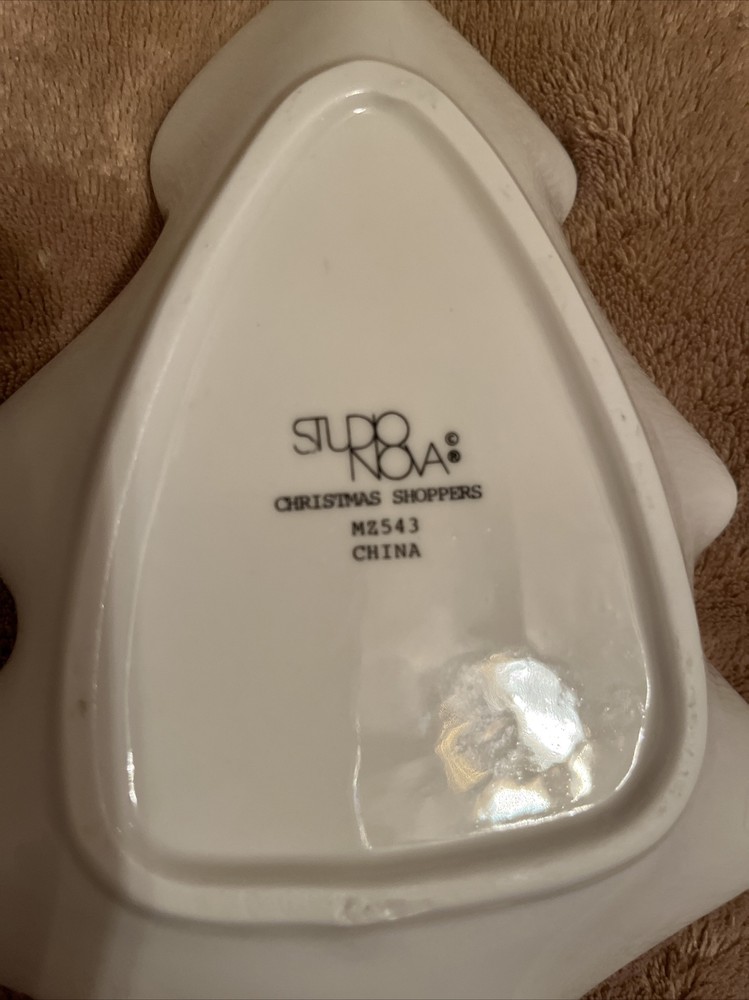 Studio Nova Christmas Shoppers, Tree Shaped Ceramic Candy/Nut Dish MZ543. Pre-owned in excellent condition. Measures 7.5” long by 6” wide. Beautiful detail. Great addition to your holiday table. Will ship within 3 days of payment received