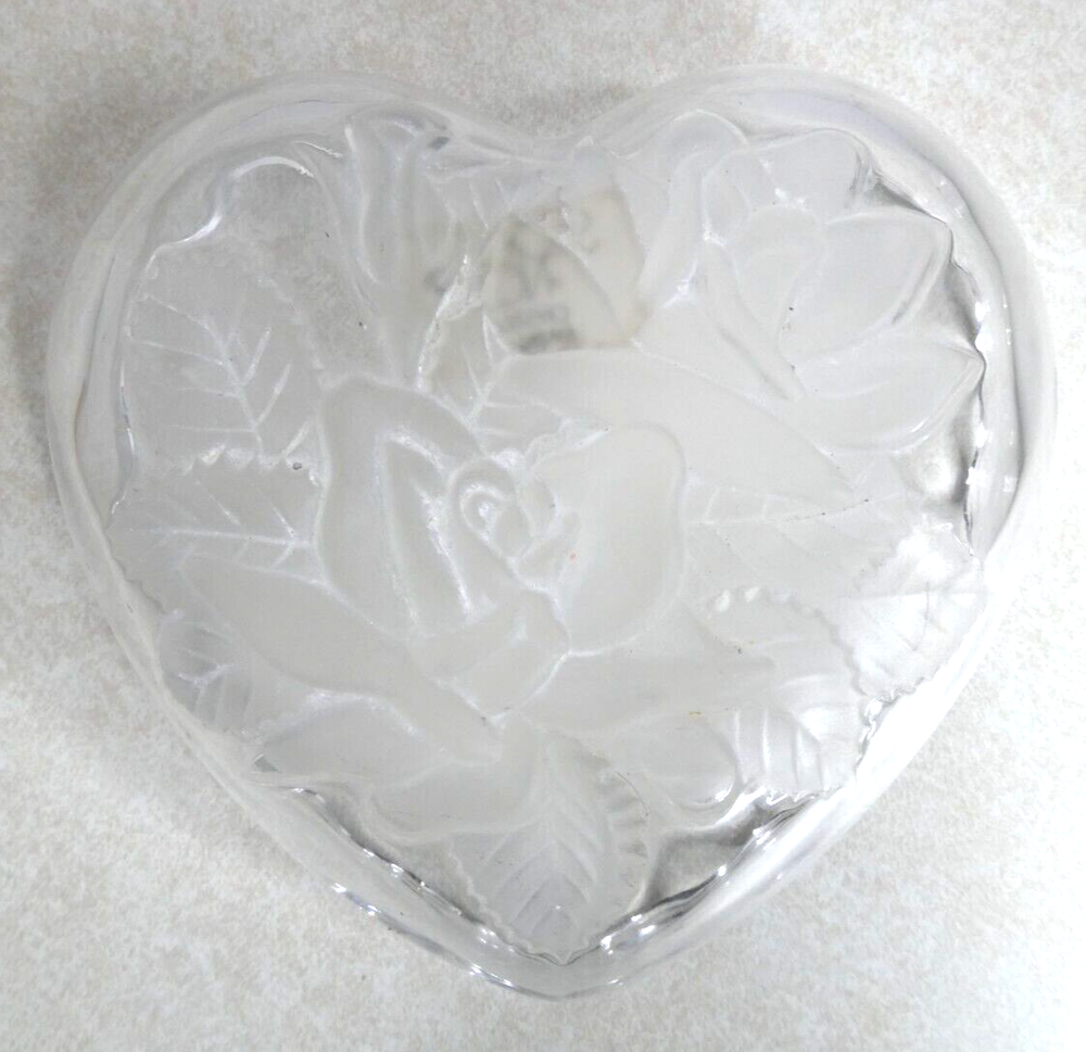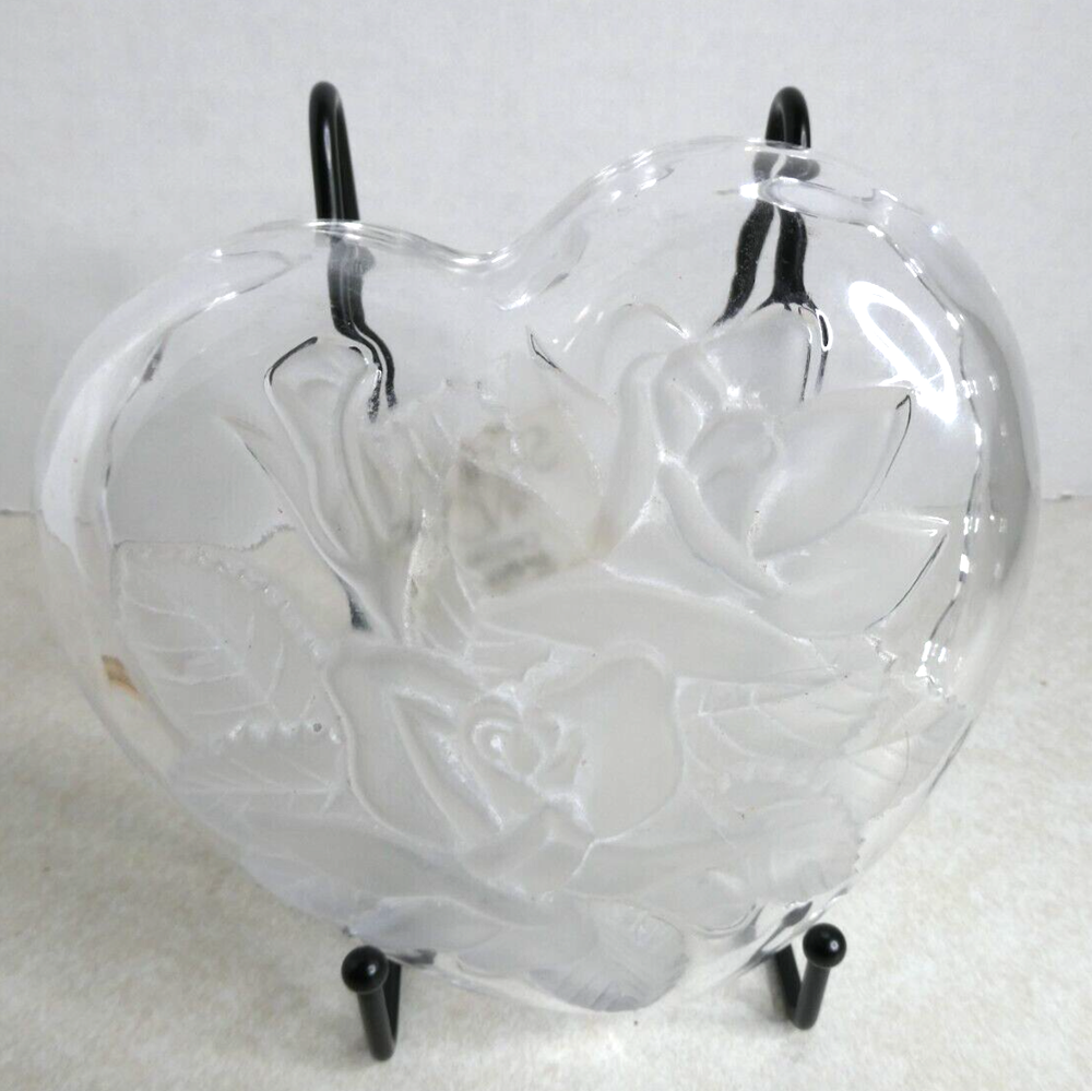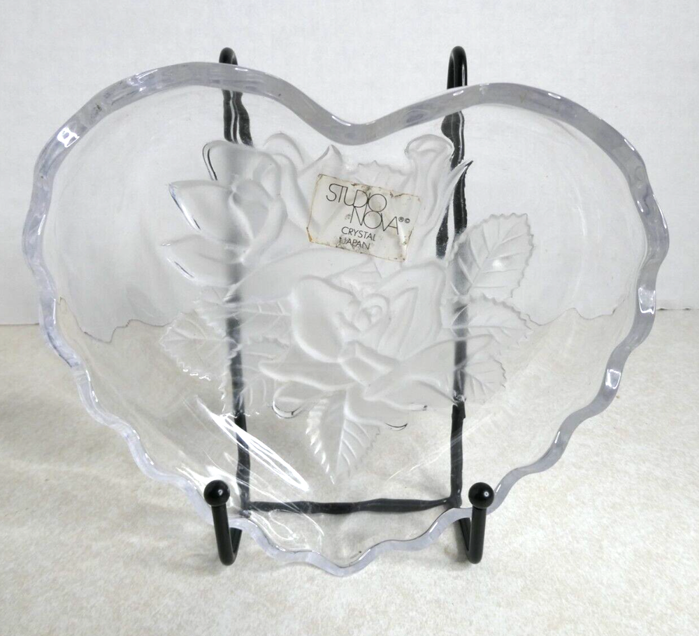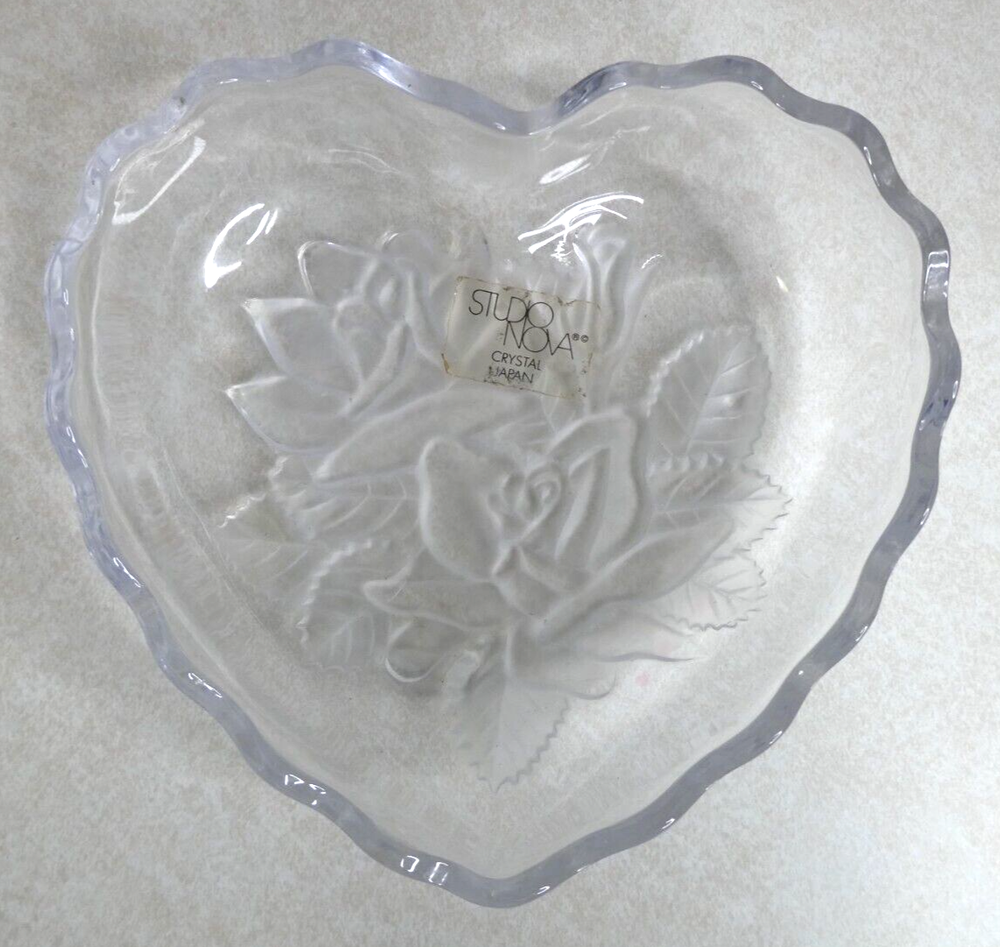 Add a touch of elegance to your home décor with this beautiful Studio Nova Crystal Heart Shaped Candy Dish. Crafted from high-quality etched frosted glass, this candy dish features delicate roses and leaves design, adding a charming vintage touch to your living space. Measuring 5.5 inches in length, width, and diameter, and 3 inches in height, this candy dish can hold your favorite treats, making it perfect for entertaining guests or just as a decorative piece. This heart-shaped candy dish is an original piece from Studio Nova, and it is made in Japan. It is easy to clean and maintain, just hand wash only. This candy dish is perfect for any occasion and is ideal for anyone who loves vintage items. Makes a great gift for friends and loved ones. Please see the item photos and title for description and condition. Smoke free home. Items ship well secured upon payment. Returns available unless otherwise denoted. Combined shipping available. Thank you for visiting our store!