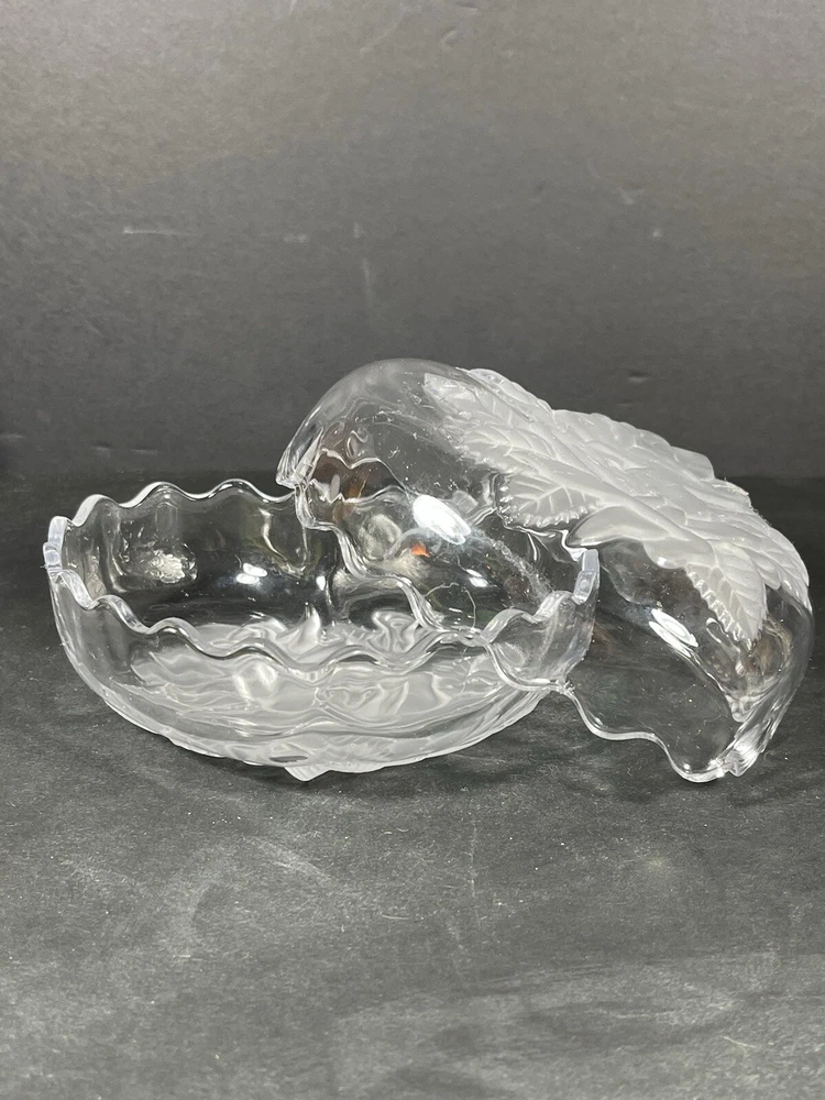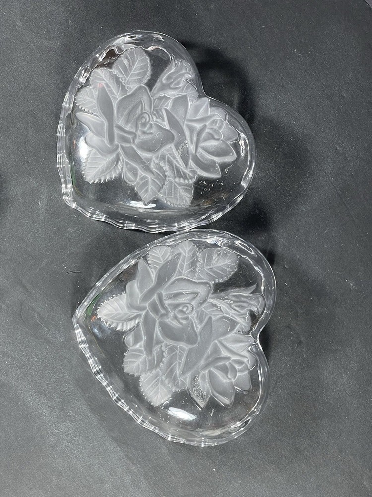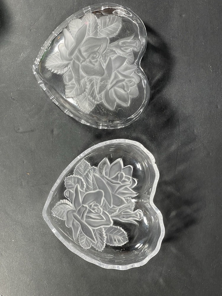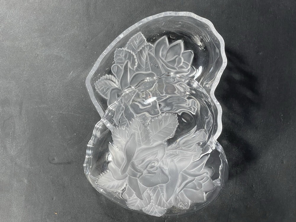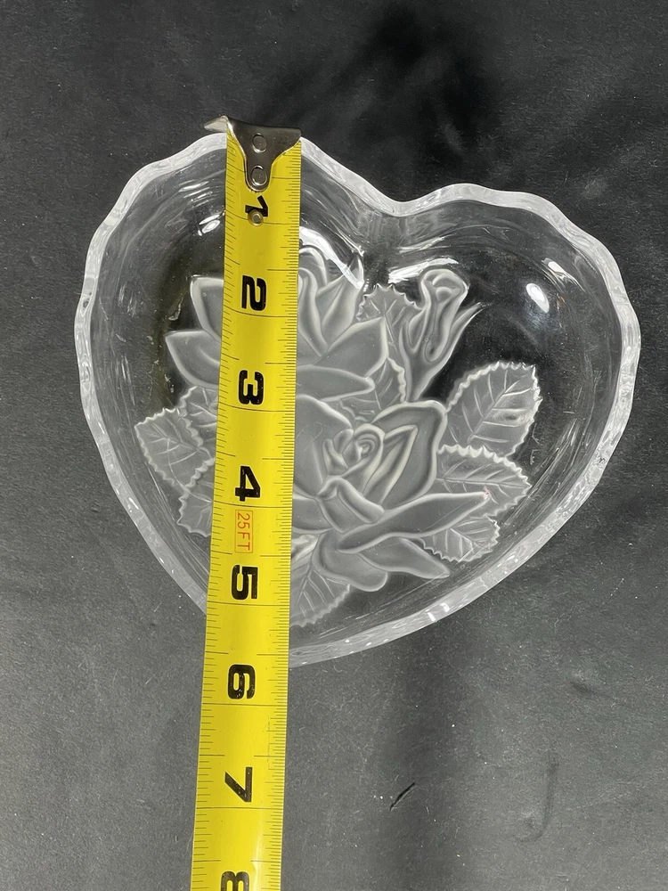 Studio Nova Crystal Heart Shaped Trinket/Candy Dish Etched Glass Frosted Roses. Condition is Used. Shipped with USPS Ground Advantage.