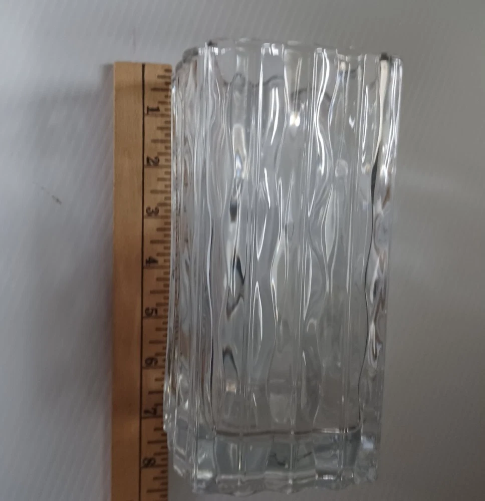 Studio Nova Crystal Pressed Glass Square Vase. Vertical Wave Pattern. Signed.