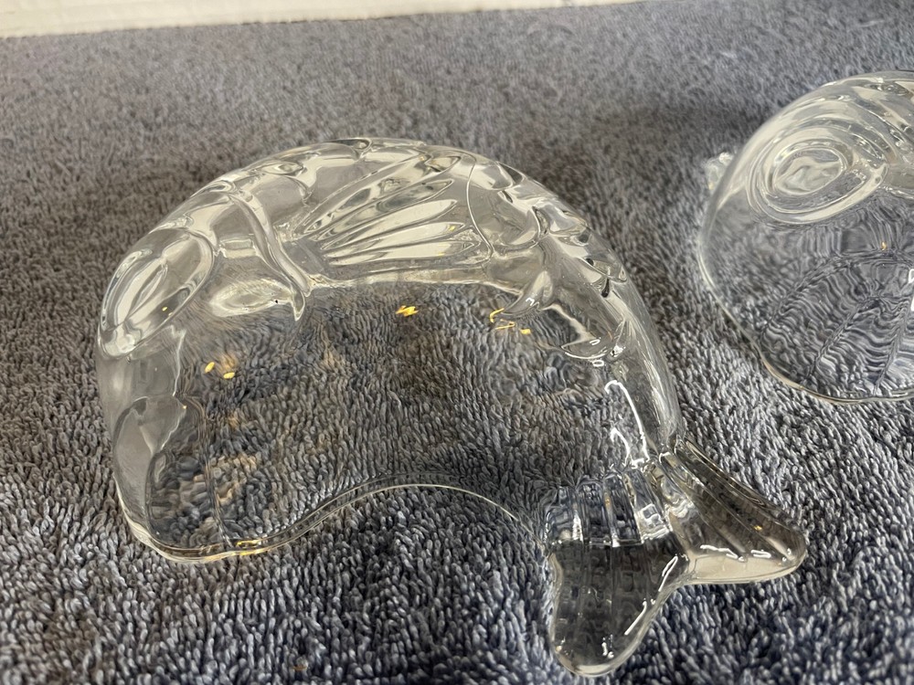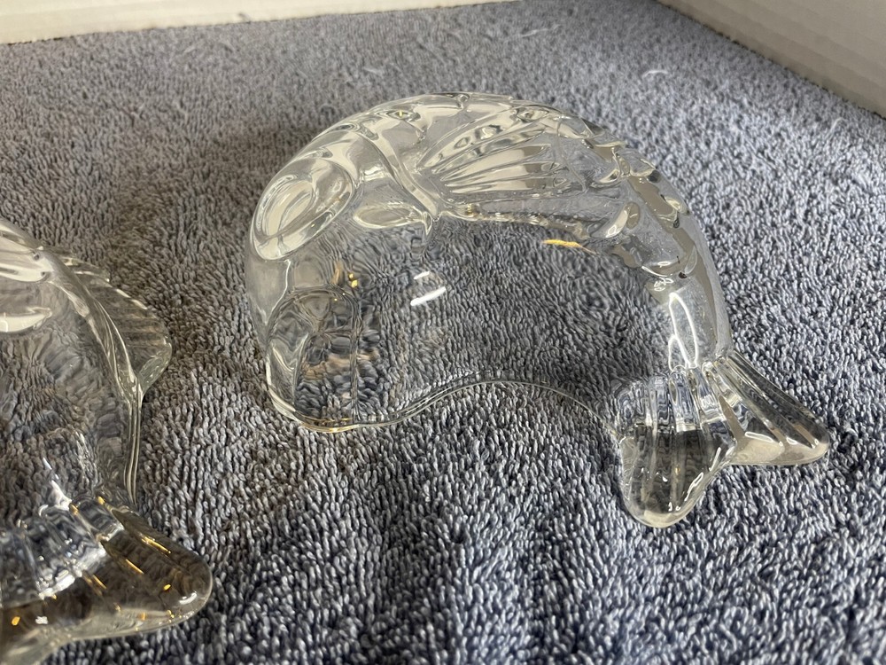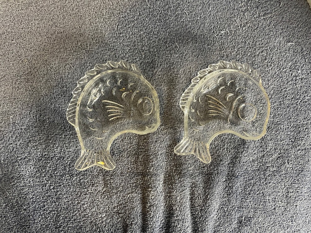 This is a set of two clear glass bowls from the brand Studio Nova. The bowls are shaped like fish and are 6 inches long. They are deep dish bowls that can be used for serving candy or nuts. The material of the bowls is glass and they are perfect for decorative purposes.