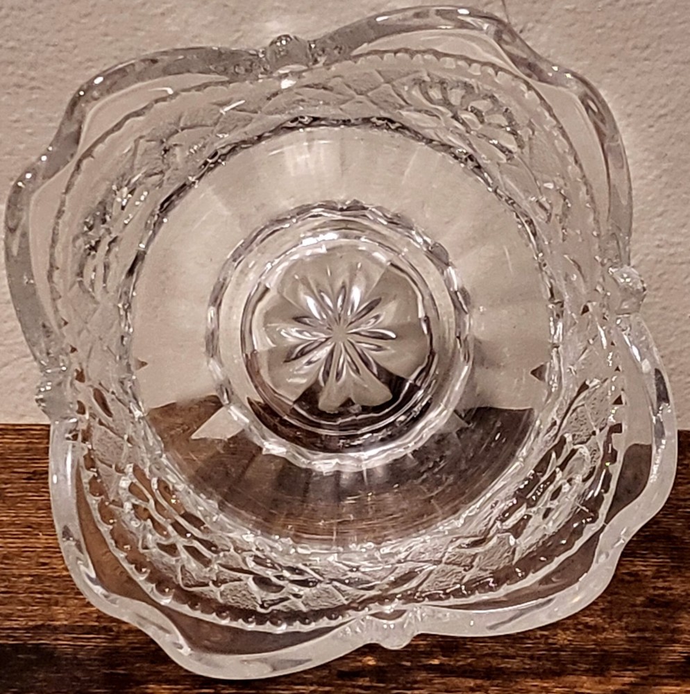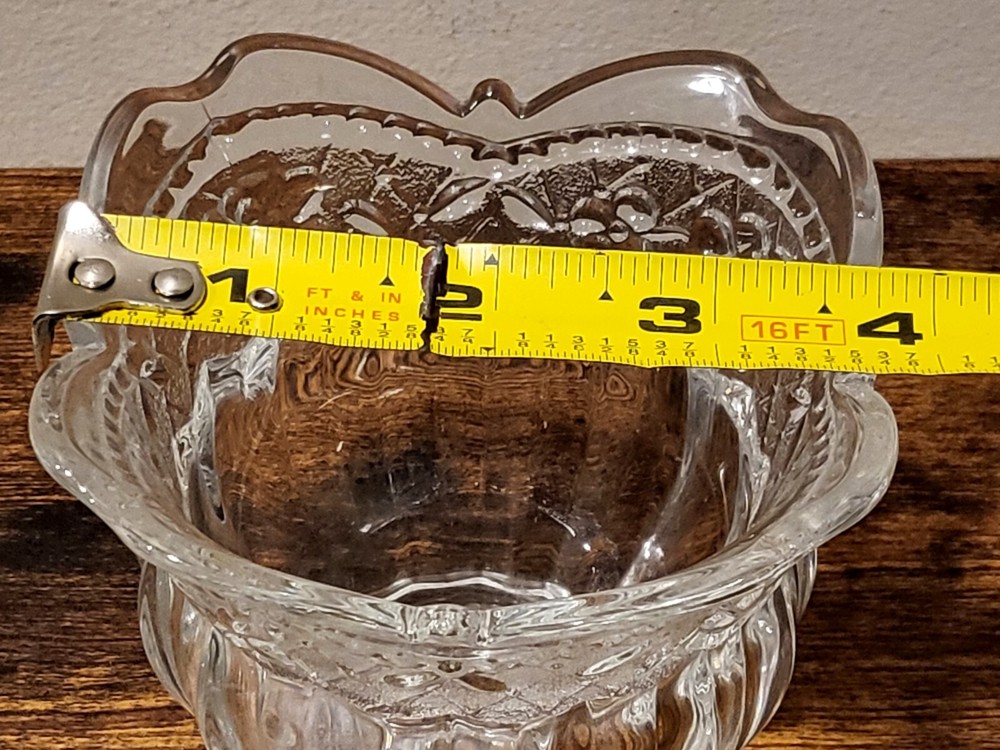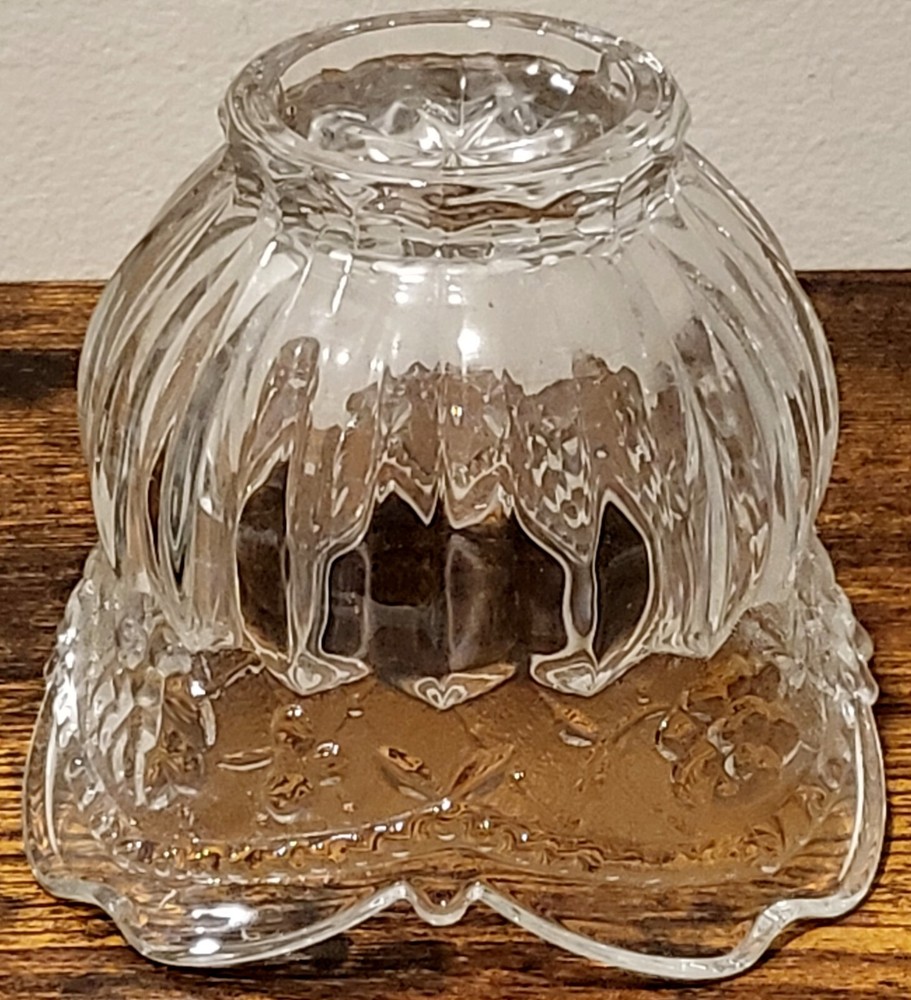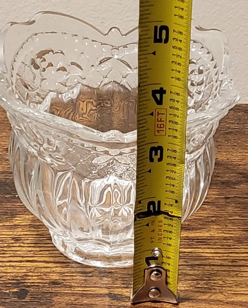 This delicate votive holder is absolutely stunning—the floral lace design and scalloped edges add such elegant charm. The clear cut glass catches the light beautifully, making it perfect for creating a cozy, romantic ambiance. Great condition, just as pictured! A lovely little piece that elevates any tablescape.