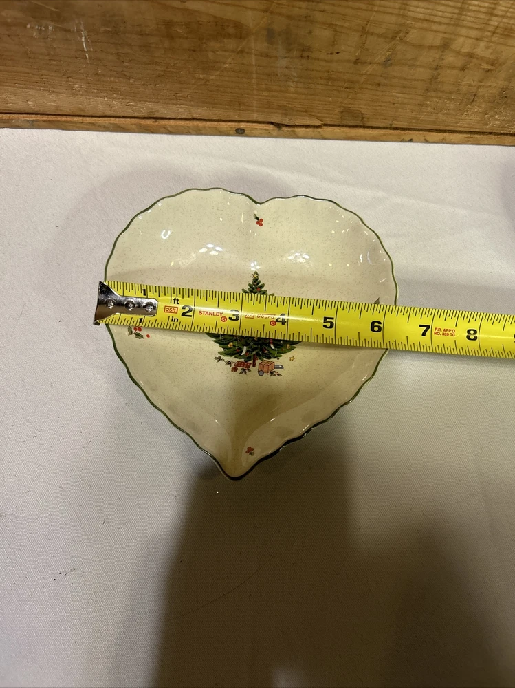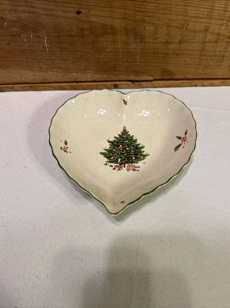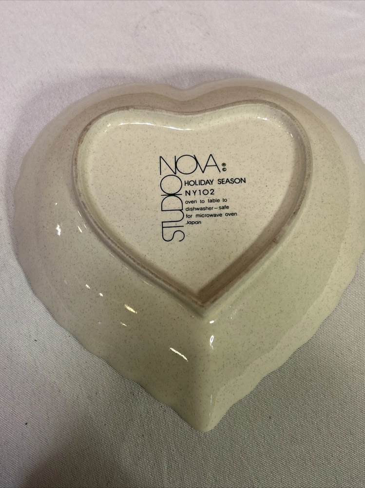 This Studio Nova plate is a beautiful addition to any collection. The Holiday Season pattern makes it a perfect choice for Christmas or any special occasion. Its heart shape and multi-color design add a unique touch to your table setting. At 6 inches in diameter and made of ceramic. It is a vintage original, made in Japan. Perfect for your favorite treats cookies snacks & appetizers It is oven to table and dishwasher safe, adding to its convenience. The Studio Nova brand is known for its quality and style. Add this heart shaped plate to your collection today and impress your guests. Studio Nova HOLIDAY SEASON PATTERN Heart Shaped Plate MADE IN JAPAN. Condition Pre- owned wear is consistent with vintage age. Please refer to pictures to determine condition. If you have any questions let me know. Item(s) are vintage and some are antique so they do show some signs of wear. Please refer to pictures for condition. All International buyers pay additional shipping costs. Fast Shipping!