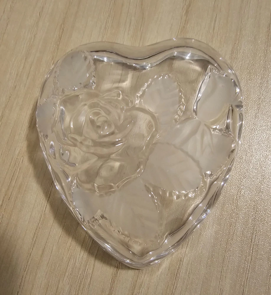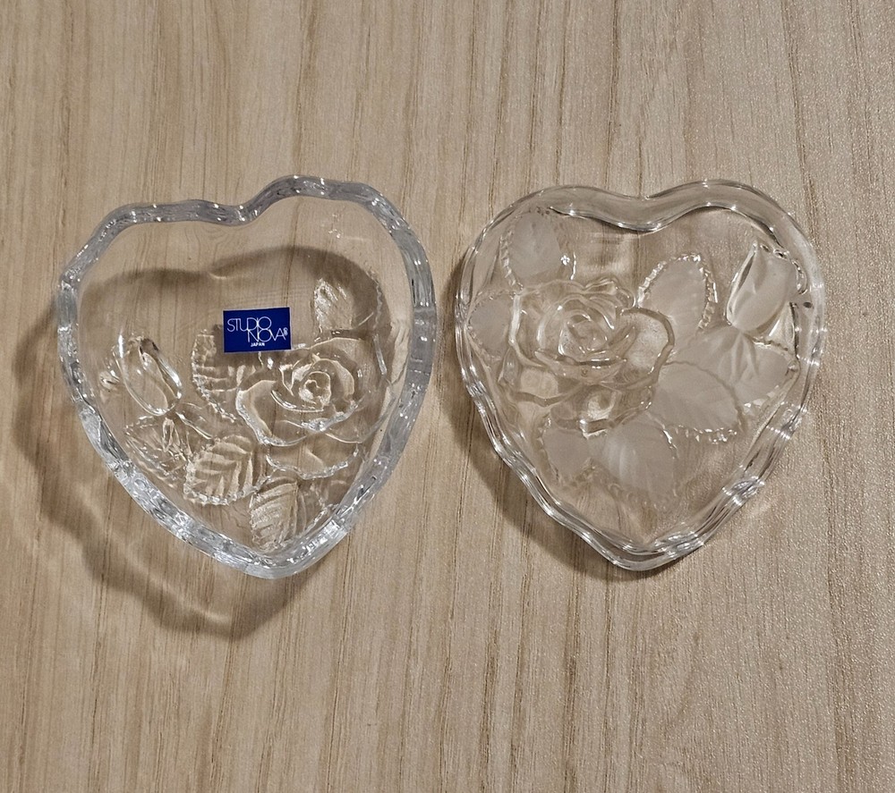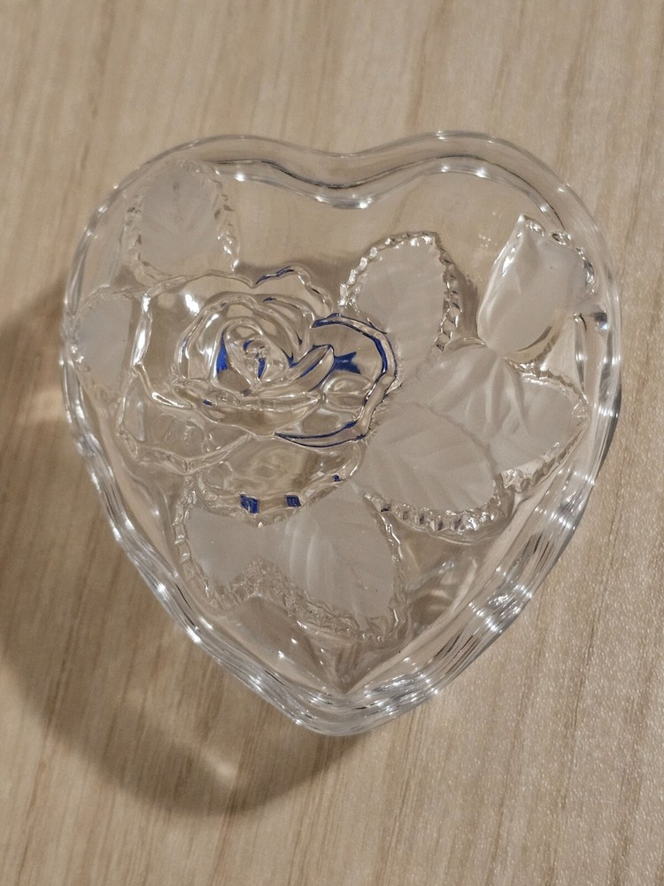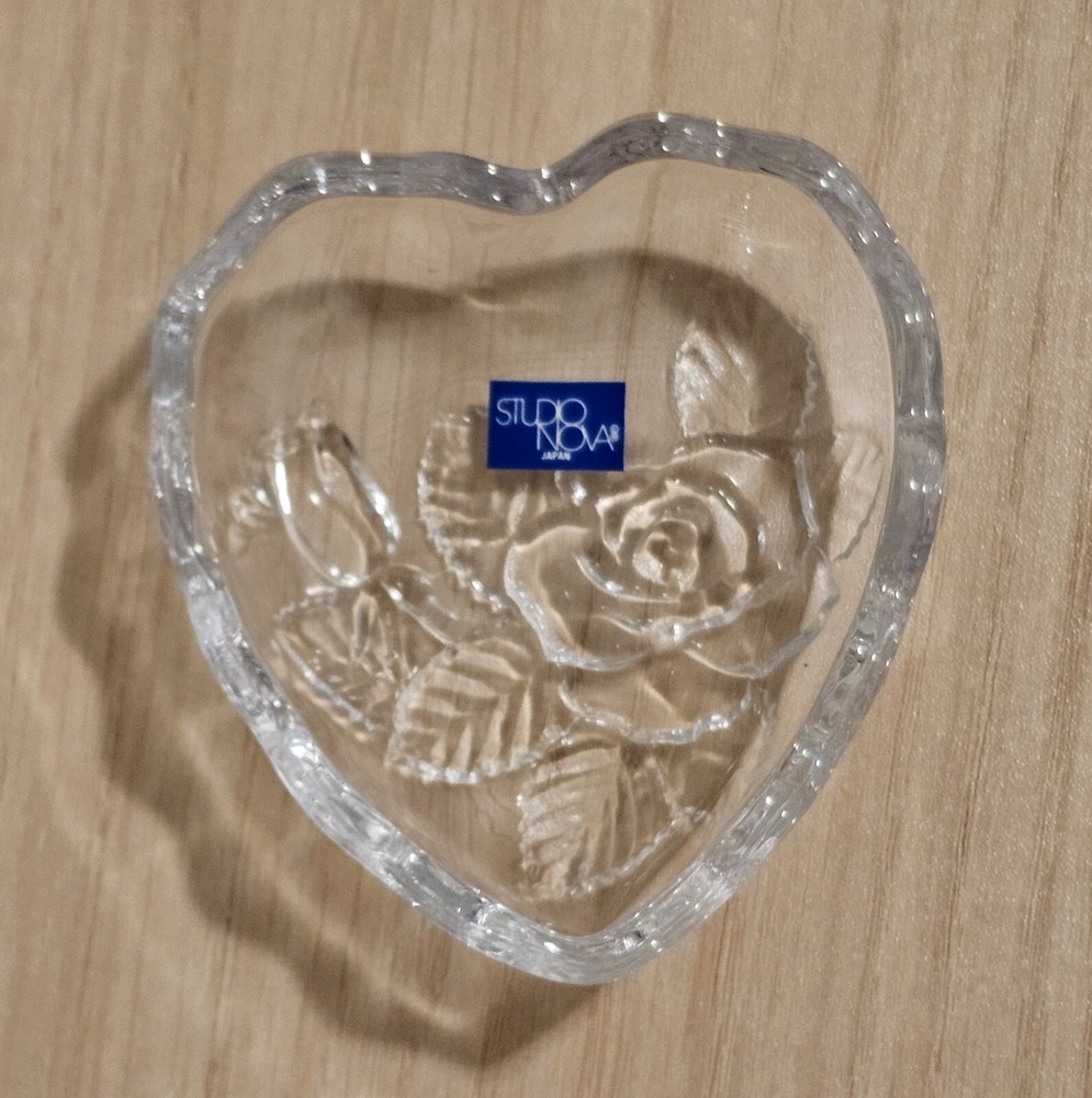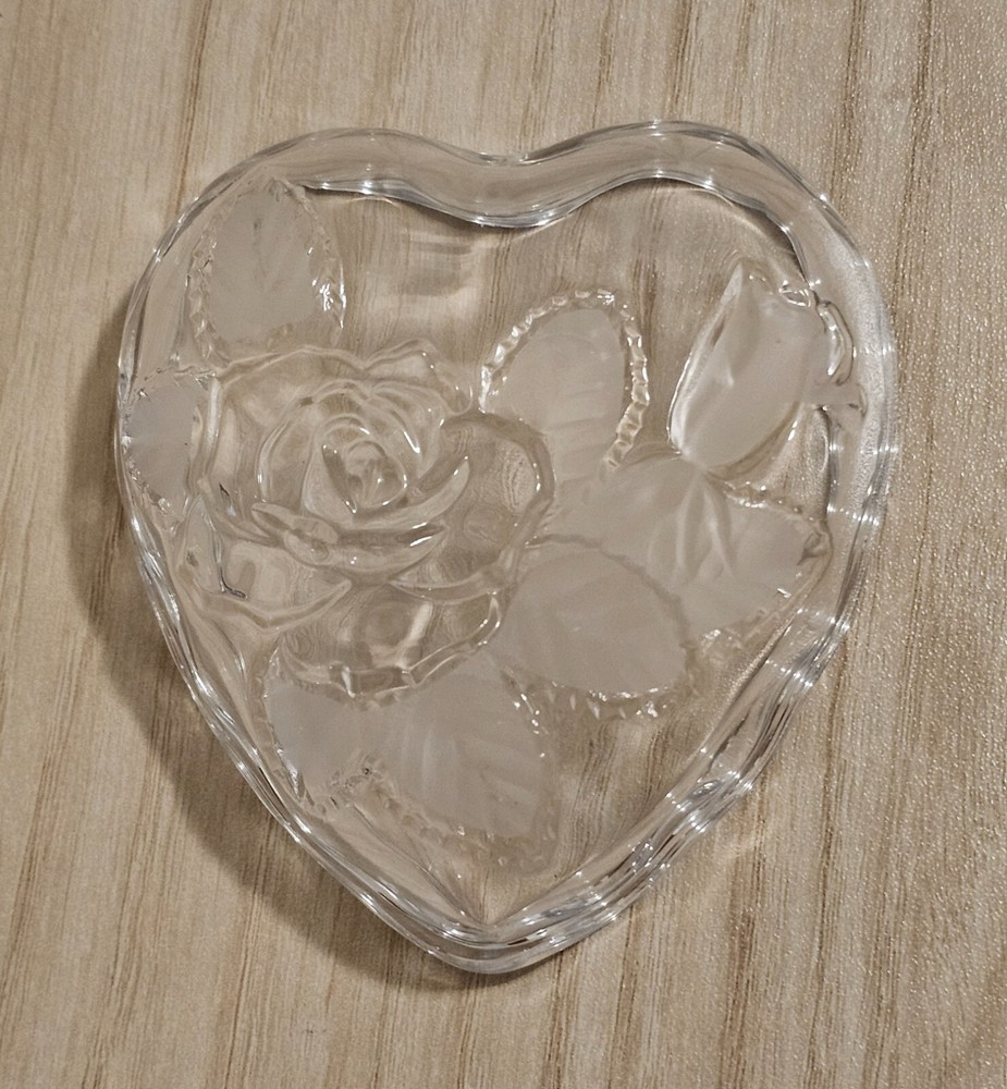 Studio Nova Heart Shaped Crystal Trinket Dish Etched Glass Rose & Frosted leaves About 3" X 3.5" No Chips or Cracks Good Condition