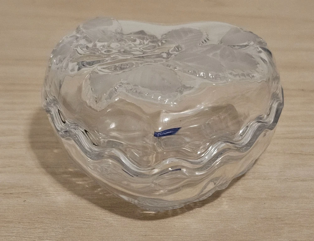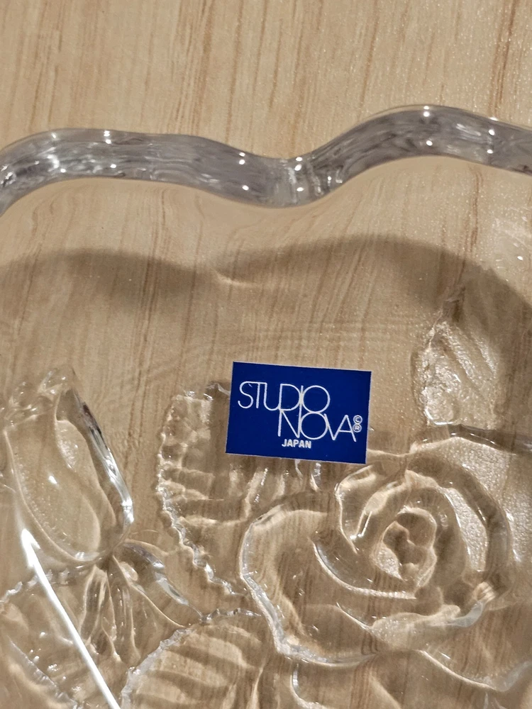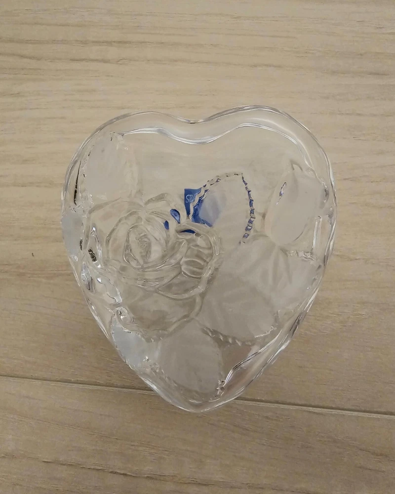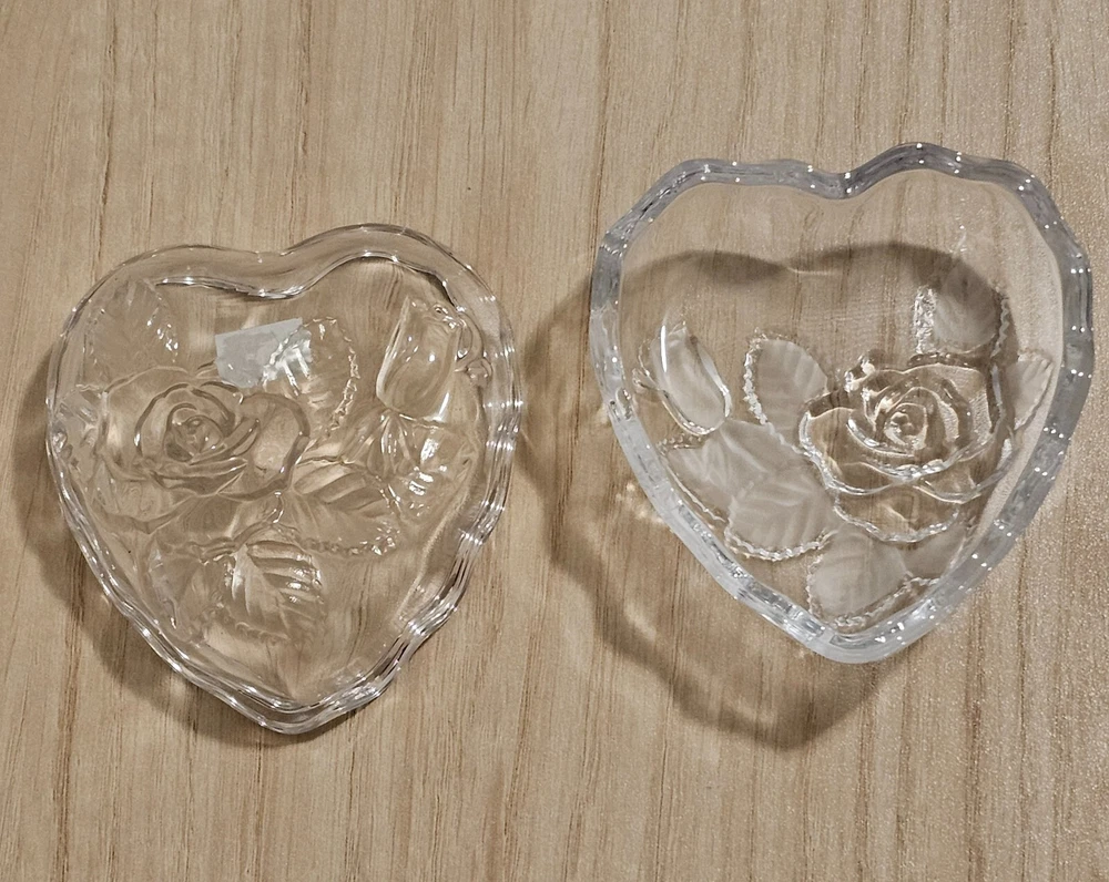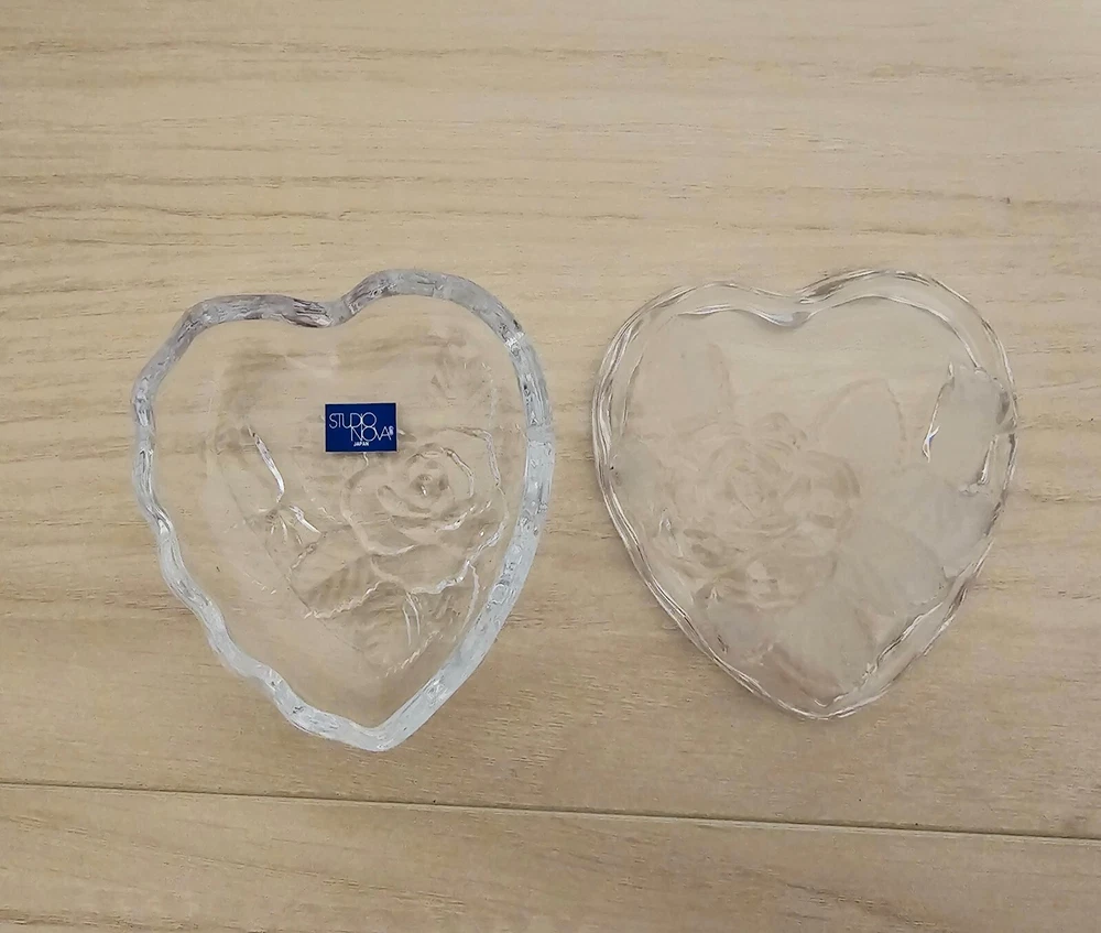 Studio Nova Heart Shaped Crystal Trinket Dish Etched Glass Rose & Frosted leaves About 3" X 3.5" No Chips or Cracks Good Condition
