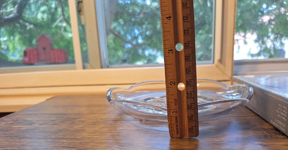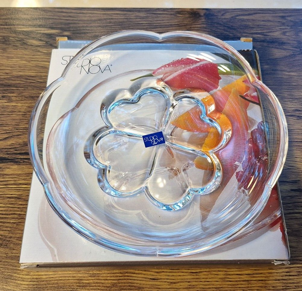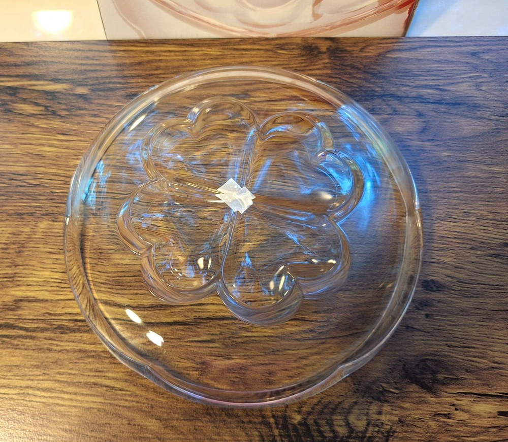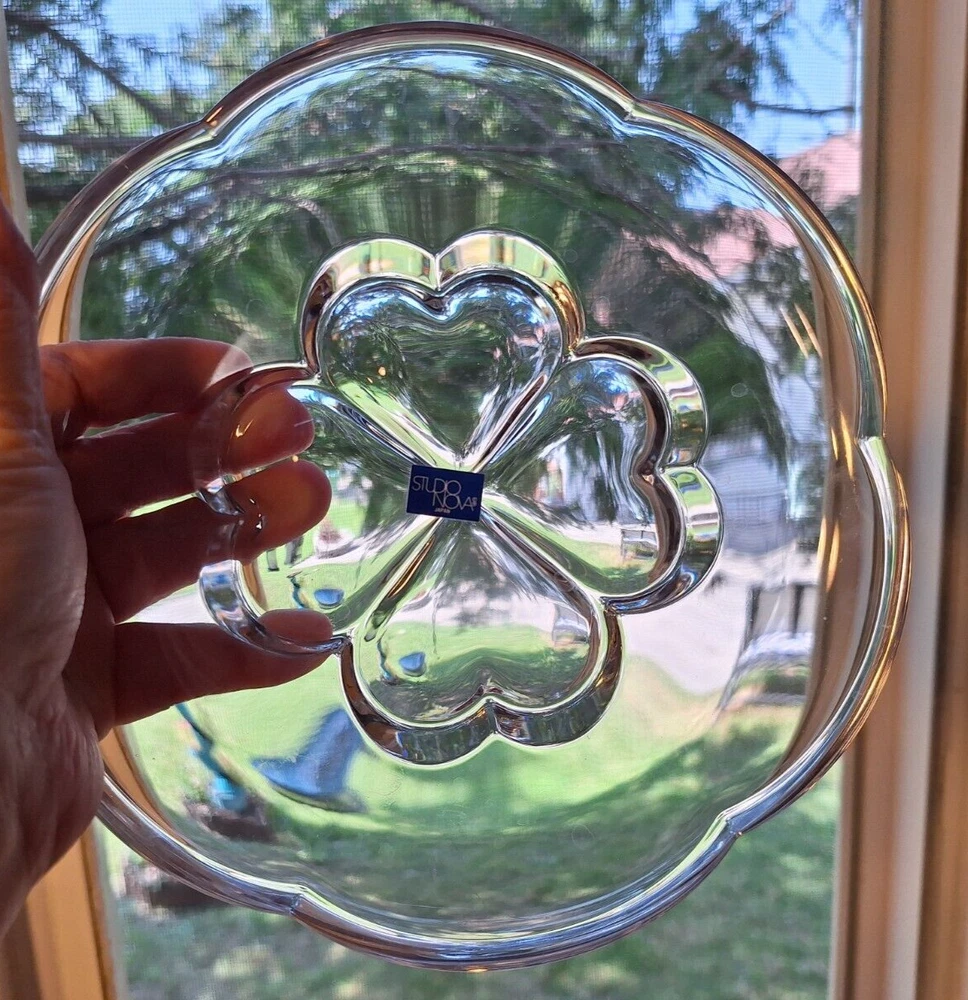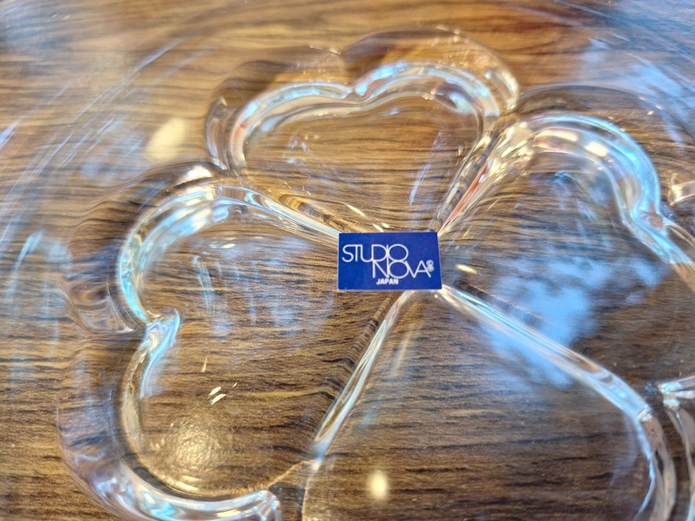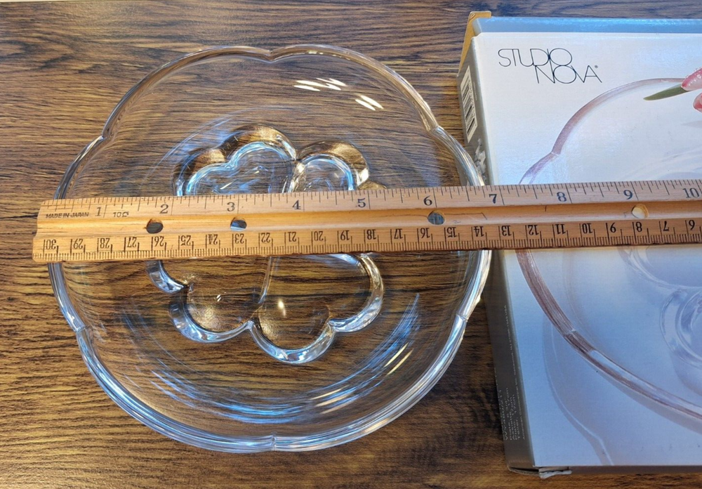 This Studio Nova Sweethearts Pink Edged Small Serving Plate is a lovely addition to any collection. Made in Japan, the plate features a beautiful heart pattern and is made of clear glass with a slight pink edge. Measuring 6 3/4 inches in diameter, this plate is perfect for serving small snacks or desserts. The plate is part of the Studio Nova product line and is sure to impress with its unique design and high-quality materials. Thank you for looking at my listing. I have many more unique and interesting items for sale, if you have the time take a look.