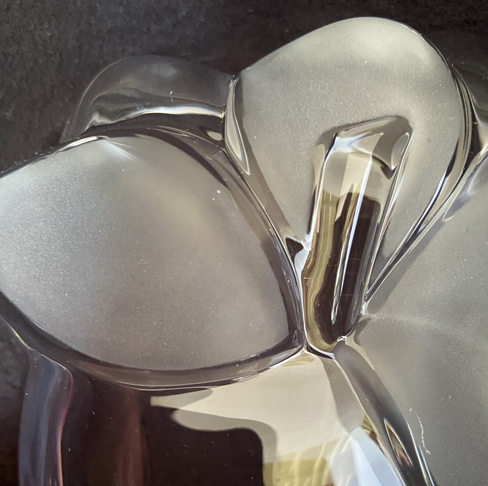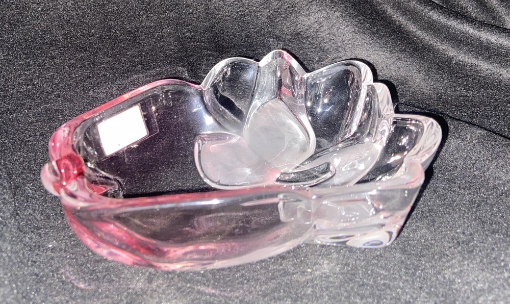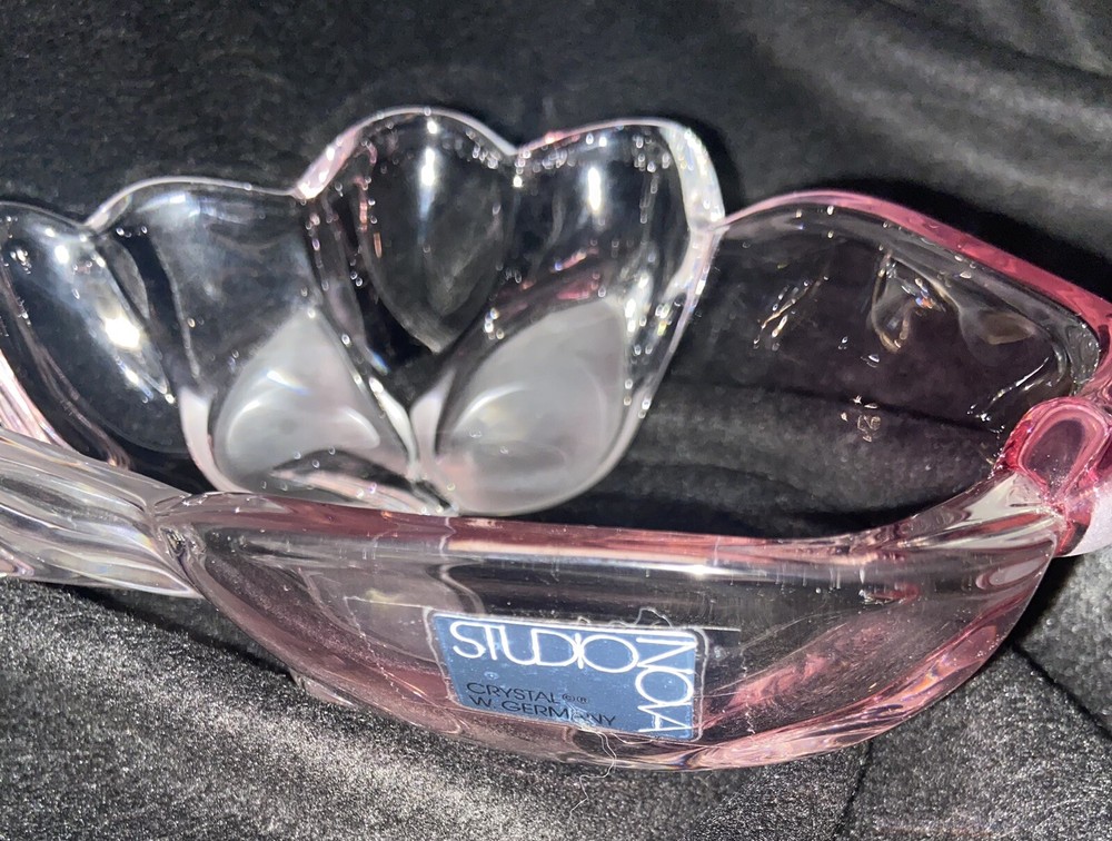 This beautiful Studio Nova crystal dish from W. Germany is the perfect addition to your collection. Its unique apple shape and frosted leaf design make it a stunning piece that is sure to impress. The dish is made from high-quality materials and is crafted with precision, ensuring that it will last for years to come. Measuring 6 7/8 inches in length and 5 3/4 inches in width, this candy dish is the perfect size for storing your favorite treats. The dish is pink and clear in color, making it an elegant and stylish addition to any table setting. This dish is in excellent, new condition, with label still intact. No chips or cracks. There is a small scratch on the underneath of one of the frosted leafs, see pic for details.