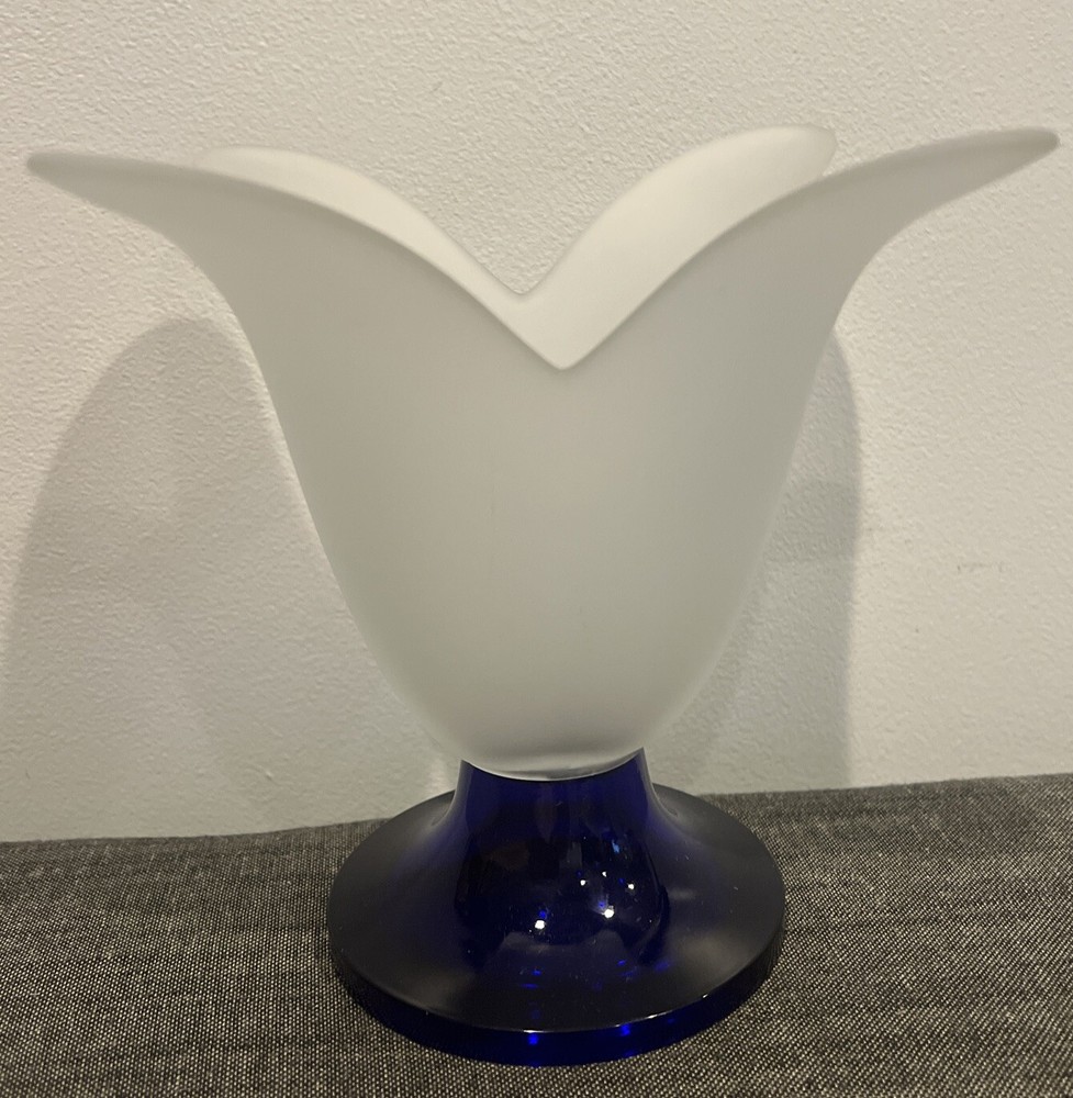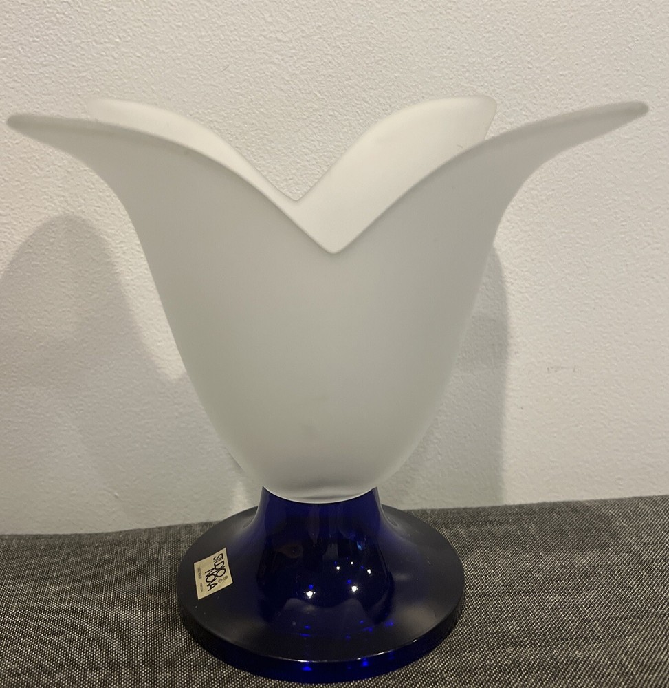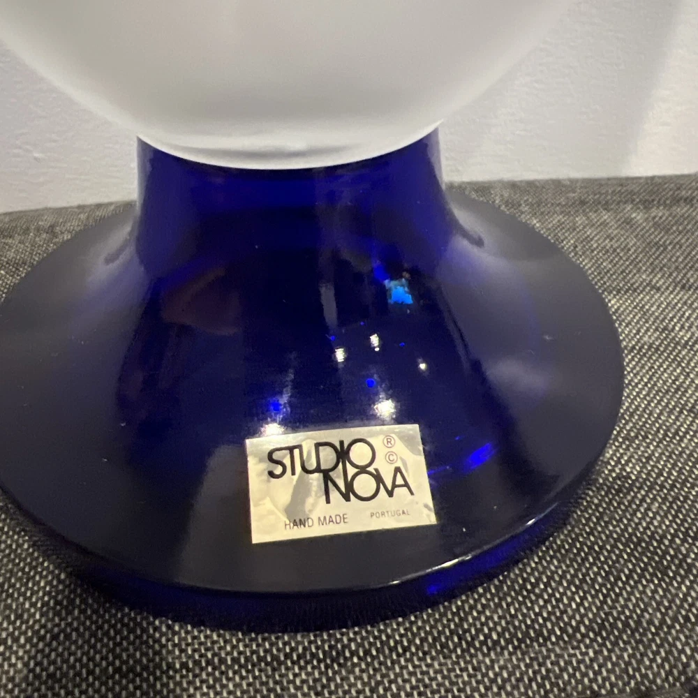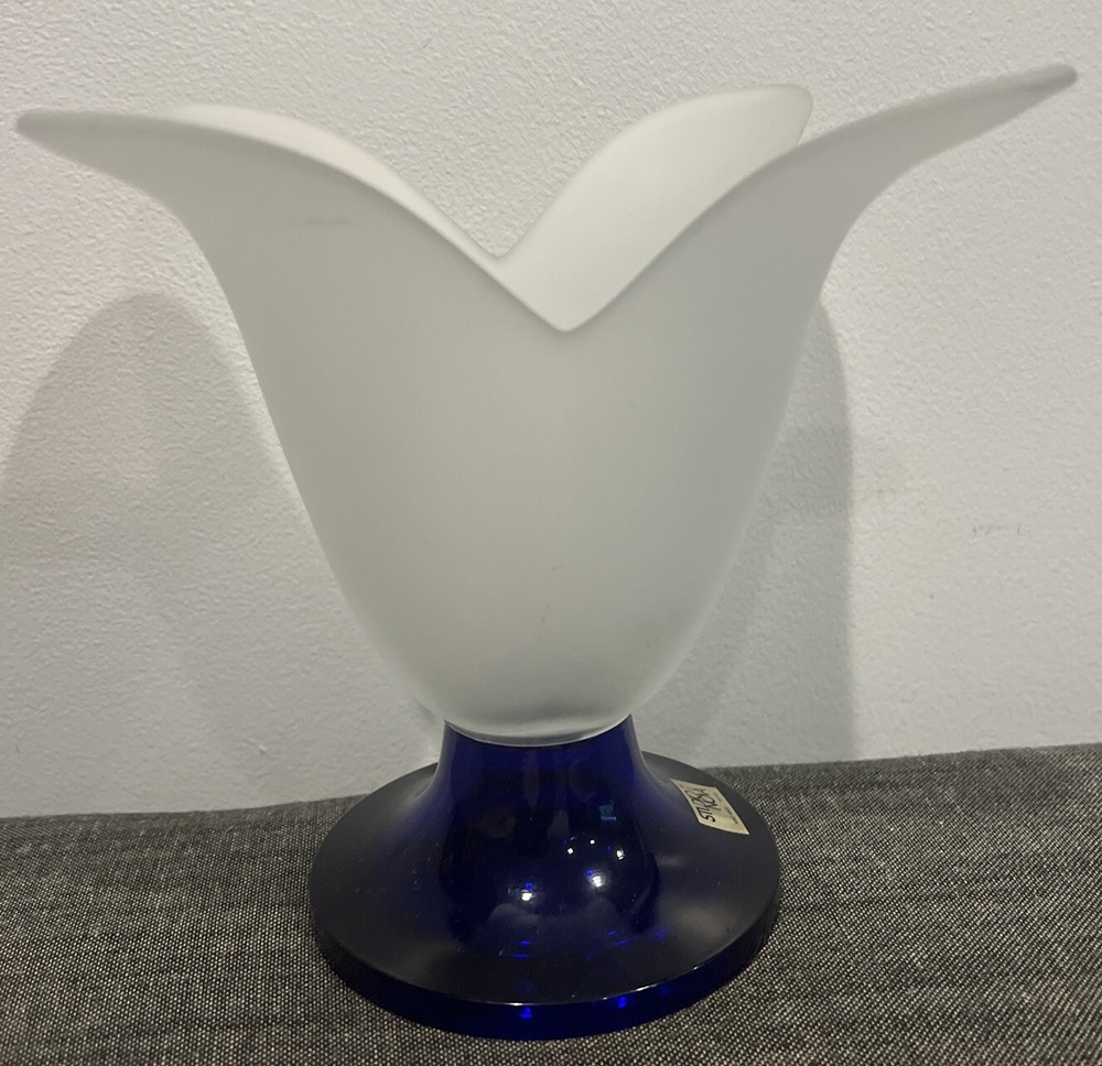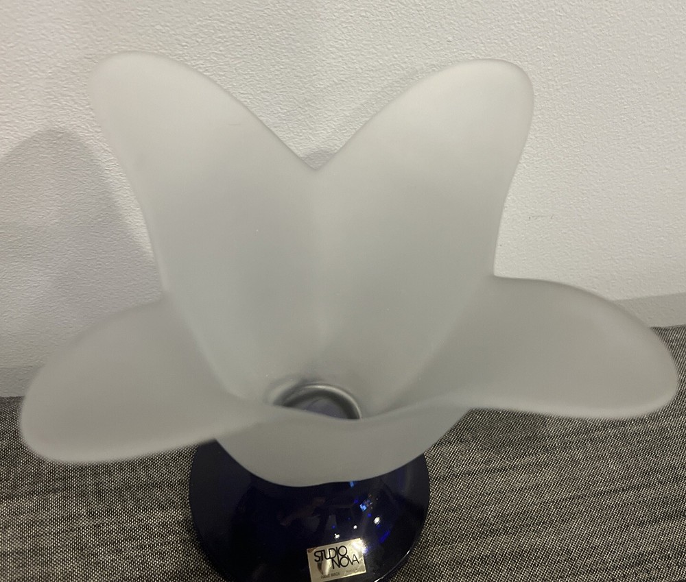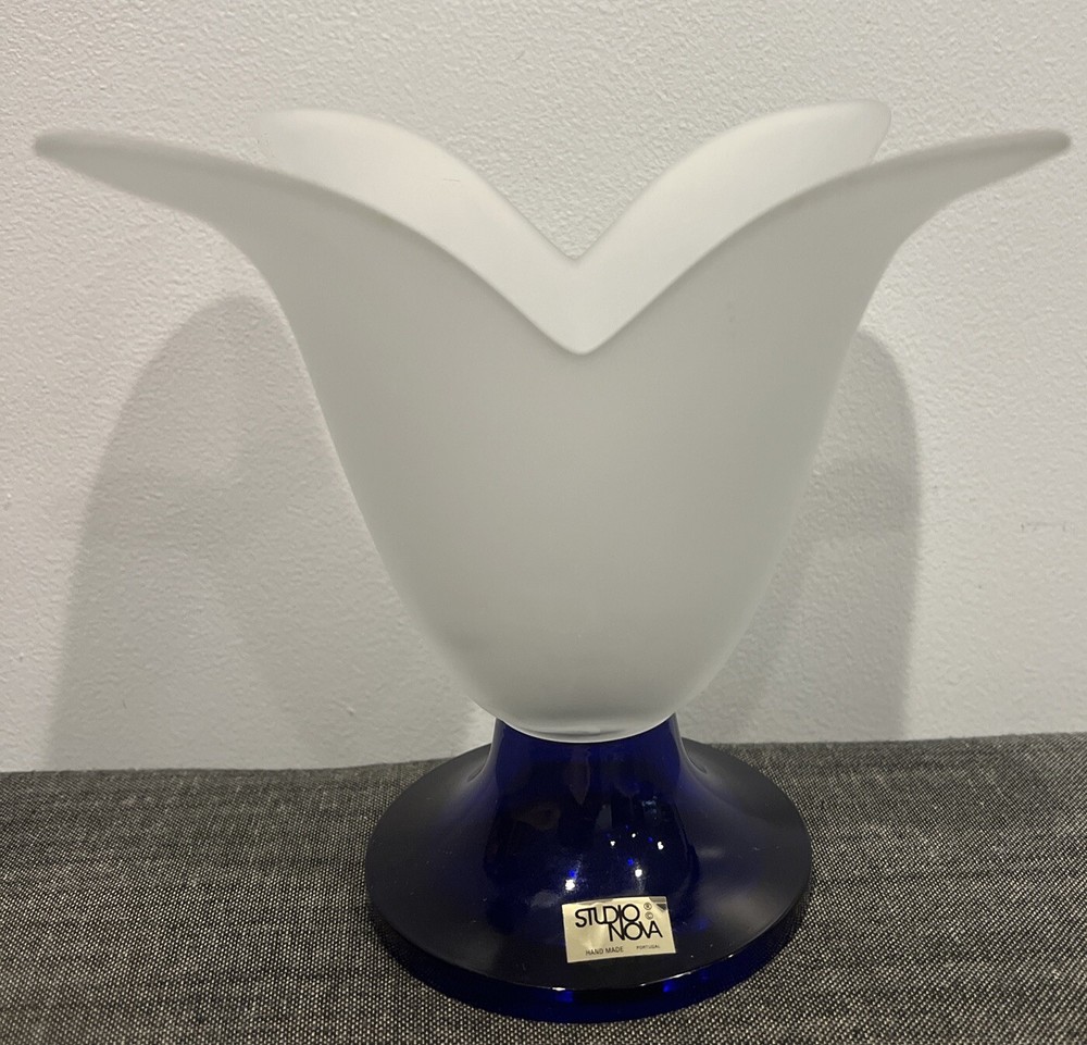 This beautiful Studio Nova art glass vase is the perfect addition to any home decor. The frosted finish and cobalt blue base create a stunning contrast that is sure to catch the eye of any guest. The vase has a tulip shape and is made of high-quality glass, making it a durable and long-lasting piece.The intricate tulip pattern and delicate artistry of the vase make it a great addition to any flower arrangement. This vase is perfect for displaying flowers of any color and is sure to elevate the aesthetic of any room. Add a touch of elegance to your decor with this beautiful Studio Nova art glass vase. The vase measures 7" in height and approximately 8" in diameter. Please review photos to understand condition, and feel free to send a message with any questions.