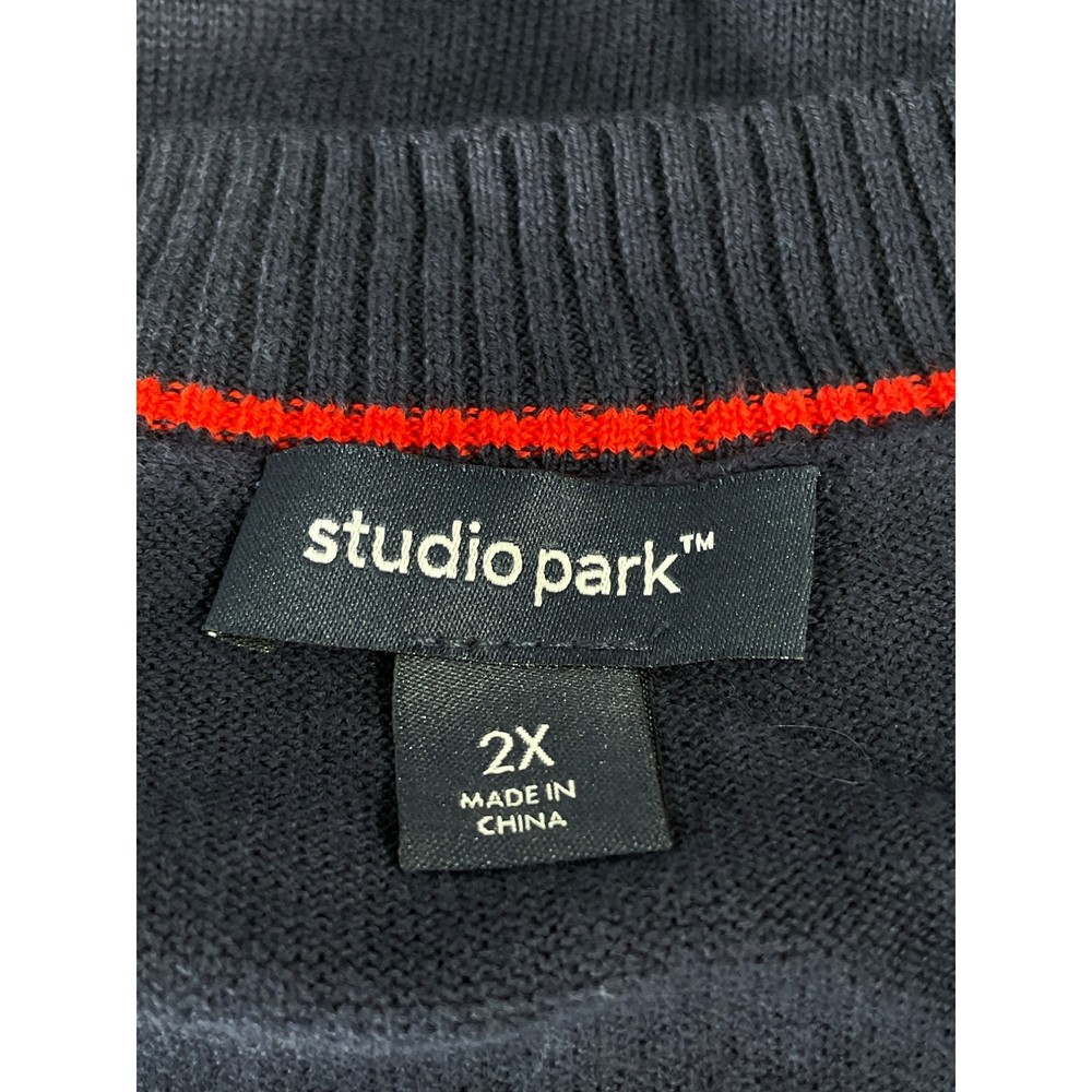 Studio Park x Amy Stran Galentine's V-Neck Heart Sleeve Navy Red Women Size 2X Features: • Contrast intarsia heart shape at elbows • Ribbed V-neckline with contrast stripe • Drop-shoulder long sleeves • Ribbed cuffs and hi-low hem • Side slits • Sweater knit • Fit: relaxed fit; generously cut with maximum wearing ease • Length: missy length 25-1/4" to 27-5/8"; plus length 28" to 31-1/2" Size: Womens 2X Condition: New Without Tags casual classic comfortable relaxed fall winter warm knit cozy comfy loungewear everyday closet staple modern essentials daily