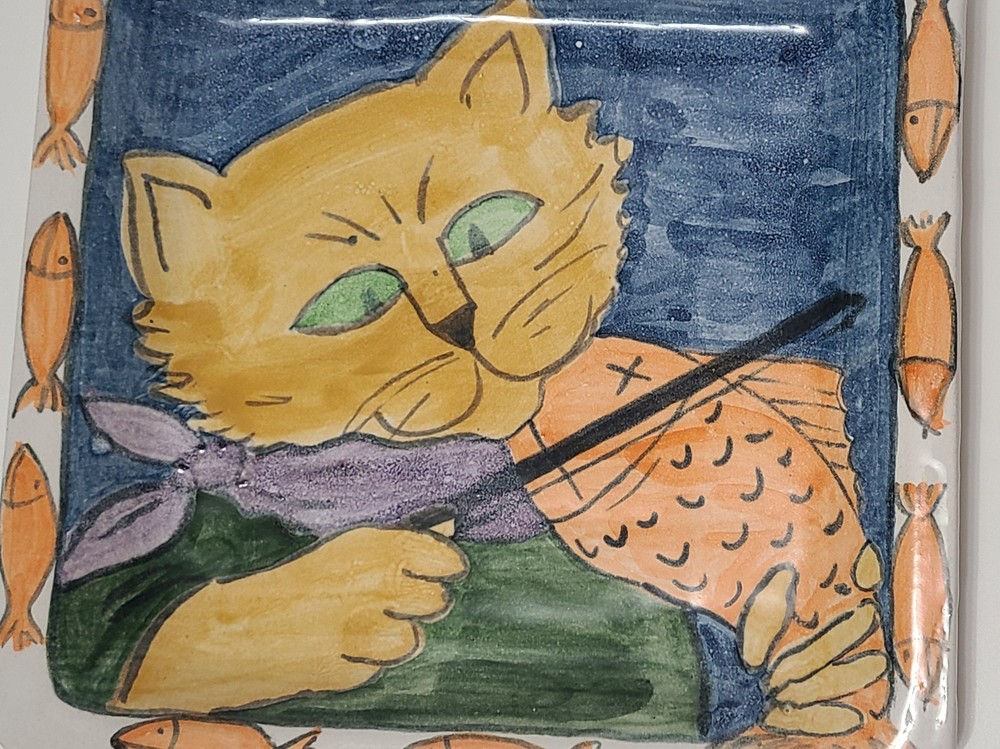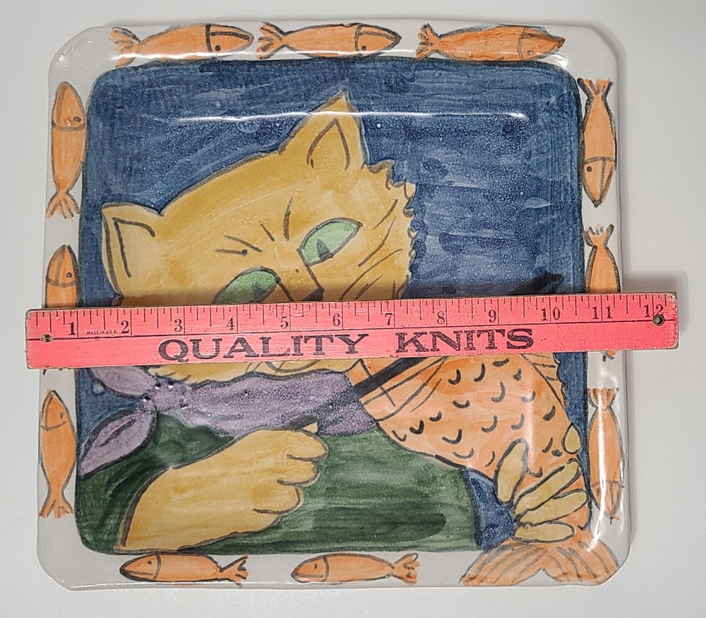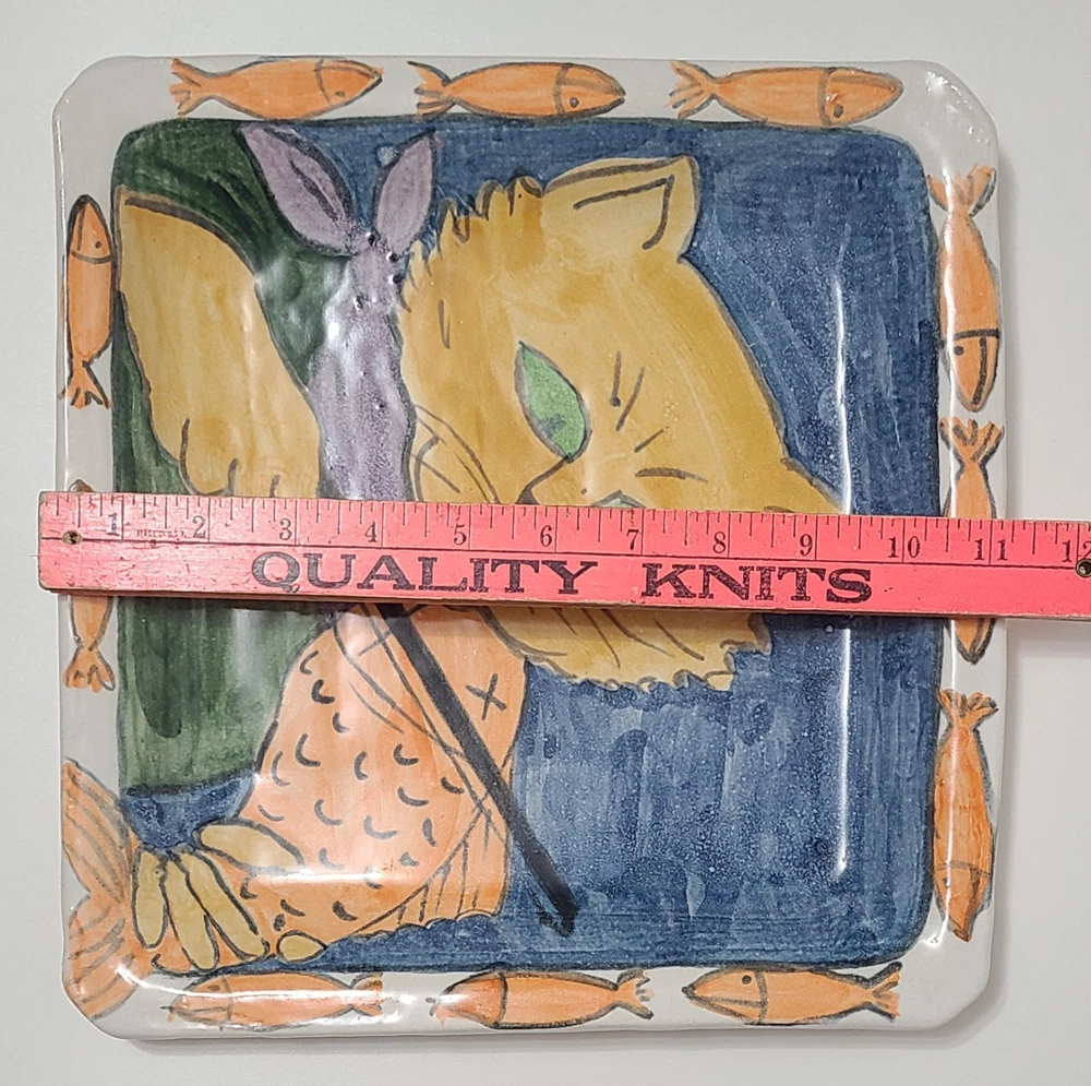 Studio Pottery Art 11.5" Square Cat Violin Fiddle Fish Platter Plate, titled "PLAYING SCALES" Signed VERY GOOD PREOWNED CONDITION. NO CHIPS, CRACKS OR CRAZING. PLEASE SEE ALL OF THE PHOTOS FOR MORE DETAILS. FROM A SMOKE FREE ENVIRONMENT. THANK YOU.