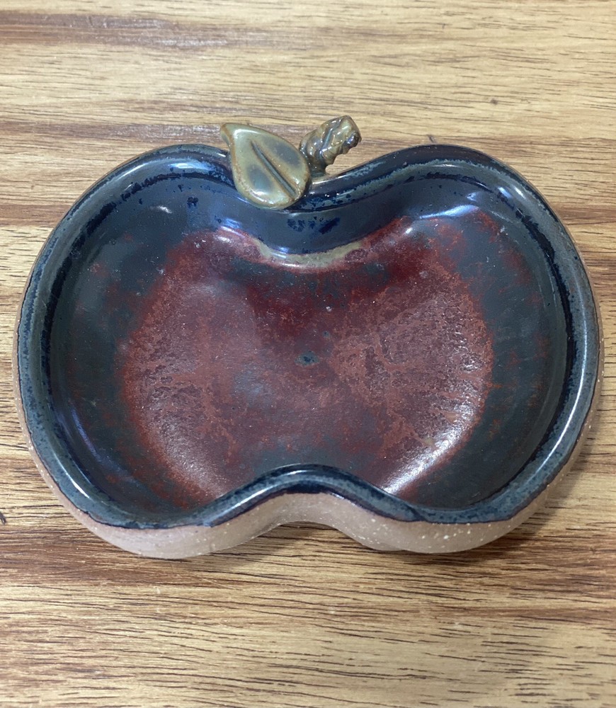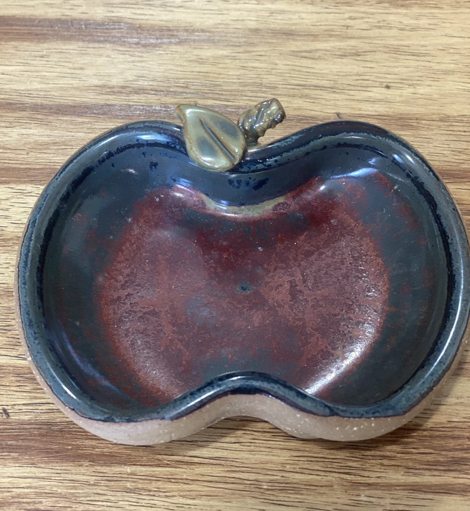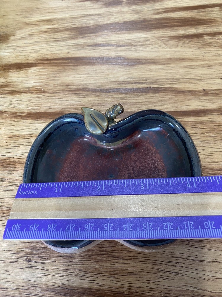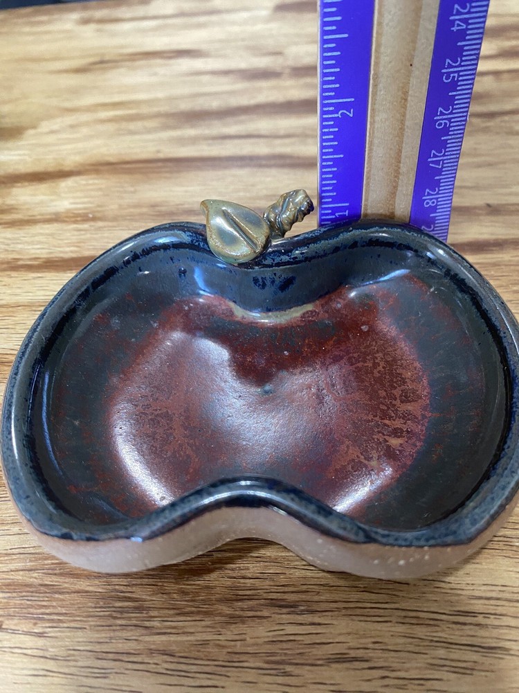Studio Pottery Apple Shaped Dish Multicolored Hand Crafted Pottery 4.25” Signed This beautiful decorative bowl/dish is a must-have for any apple lover. With its unique apple shape and vibrant green and maroon colors, it will add a touch of whimsy to any table setting. The bowl is handcrafted from clay using traditional pottery techniques and is signed by the artist. Measuring 4.25 inches in length and 3 inches in width, this bowl/dish can also be used as a trinket dish. Excellent condition.