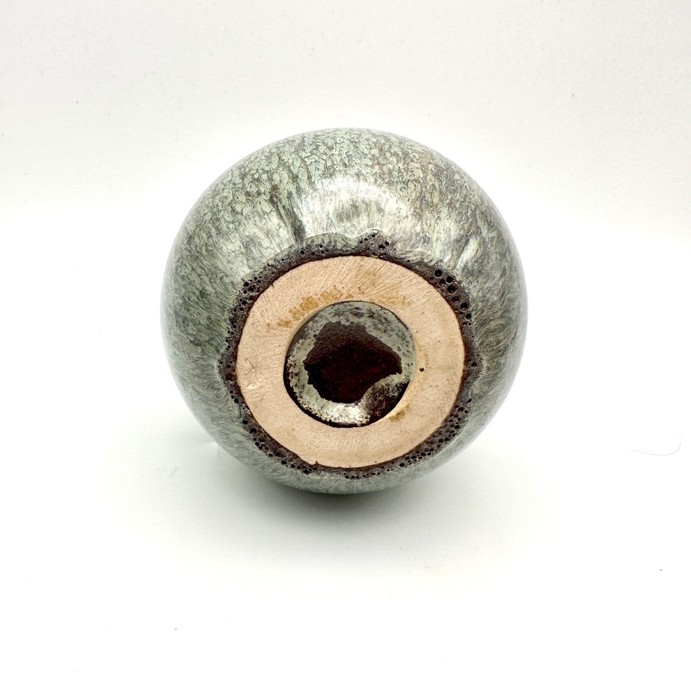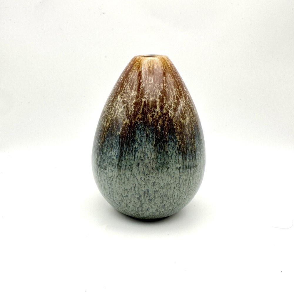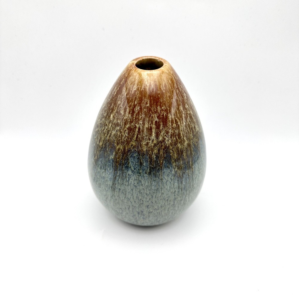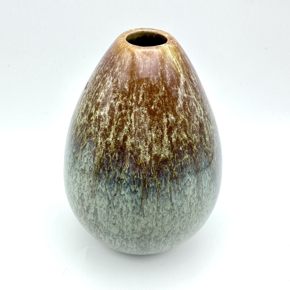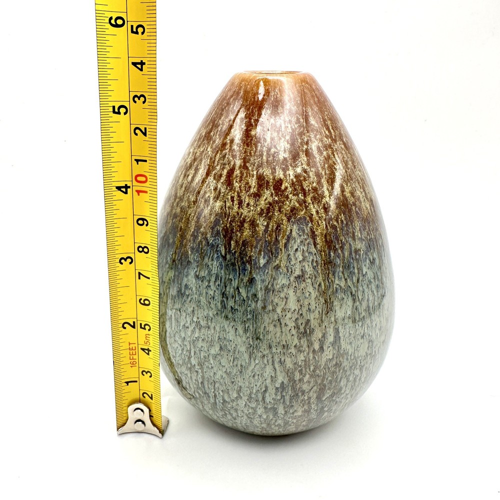 Studio Pottery Art Egg-Shaped Bud Vase w/ Muted Earth Tones Glaze 6” Tall Perfect mantle or window sill piece. Crafted with light gray clay. The glaze appears volcanic with turquoise at bottom and browns spilling from the top. Condition: Excellent with no cracks, chips or repairs. Measures 6” tall and about 4” across. Weight: 1 lb 3 oz Offers are welcome. Will pack and ship with care within 24 hrs of purchase. SBLK10-2 23